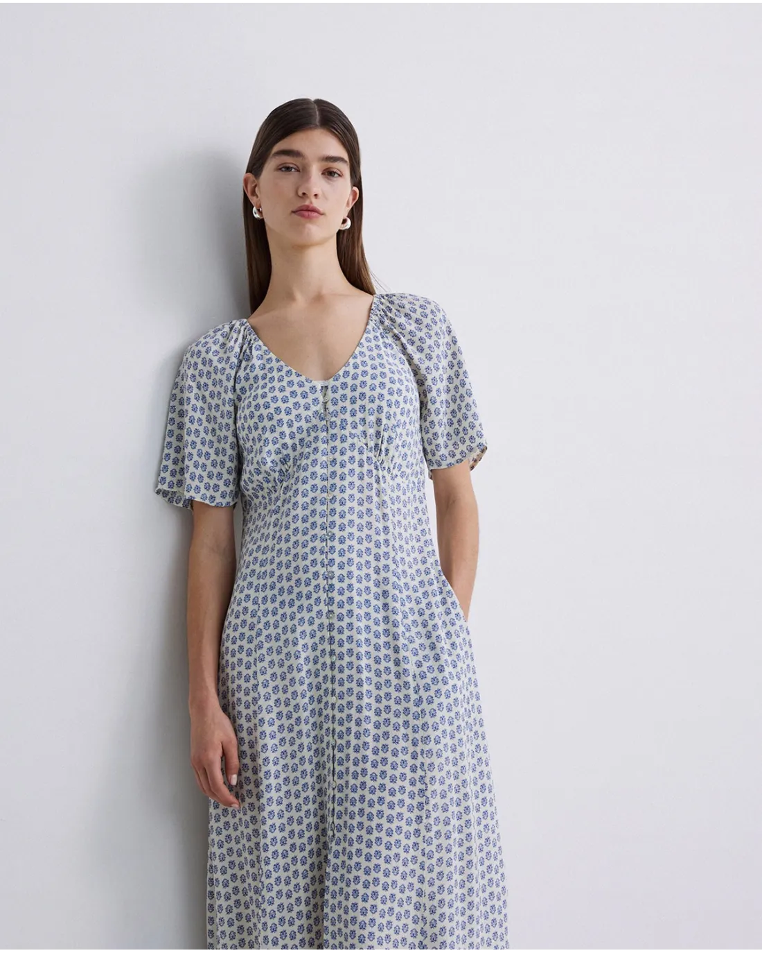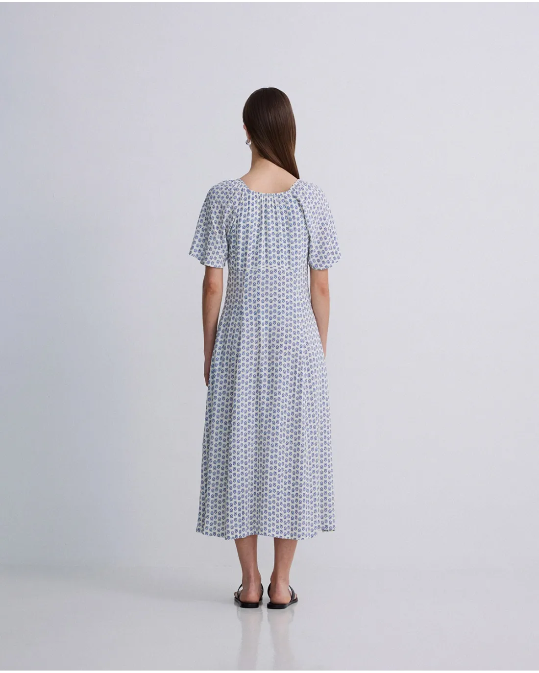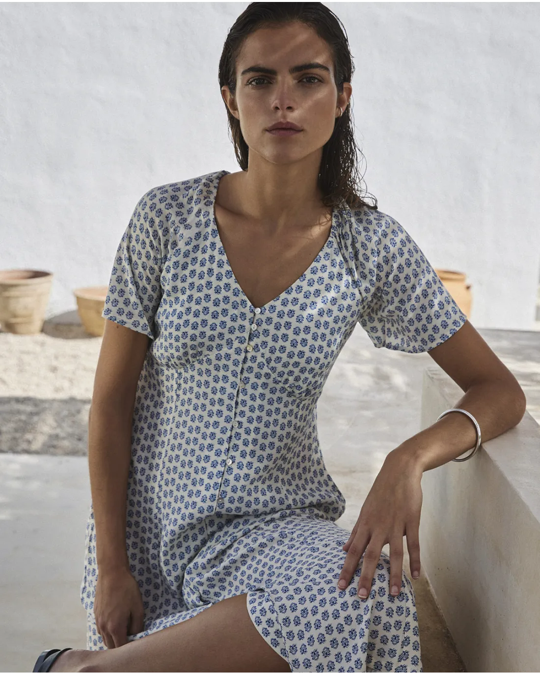 Vestido corto estampado confeccionado en tejido de gasa, manga corta acabada en elástico para poder fruncirla, cuello alto con botones, cintura elástica y falda de vuelo.
