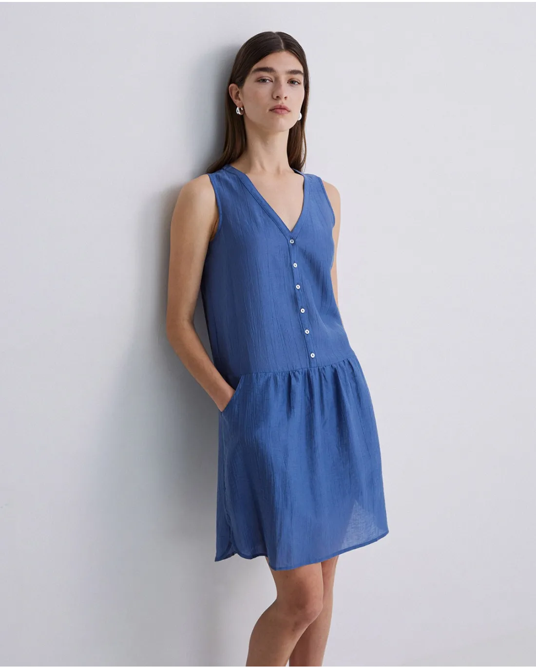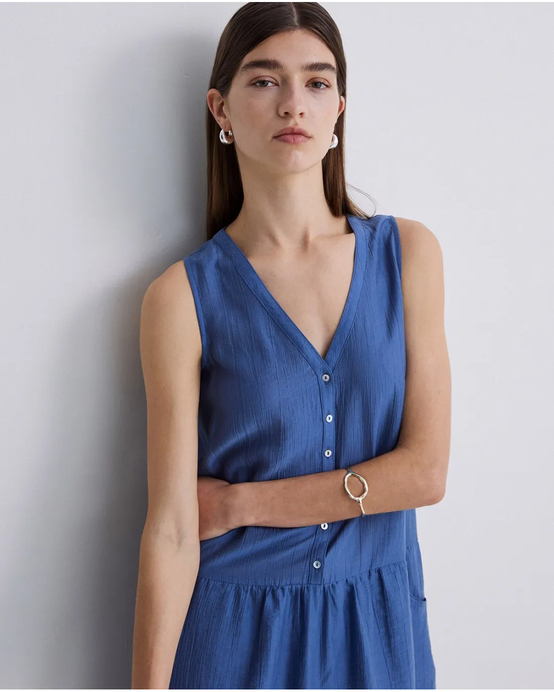 Vestido de largo midi estampado confeccionado en tejido de viscosa ECOVERO con manga corta abullonada, escote en V con cierre de botones centrales.
