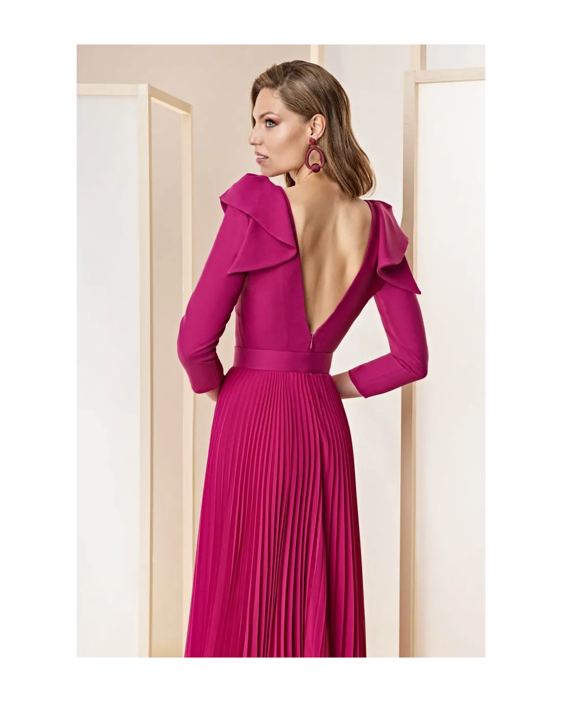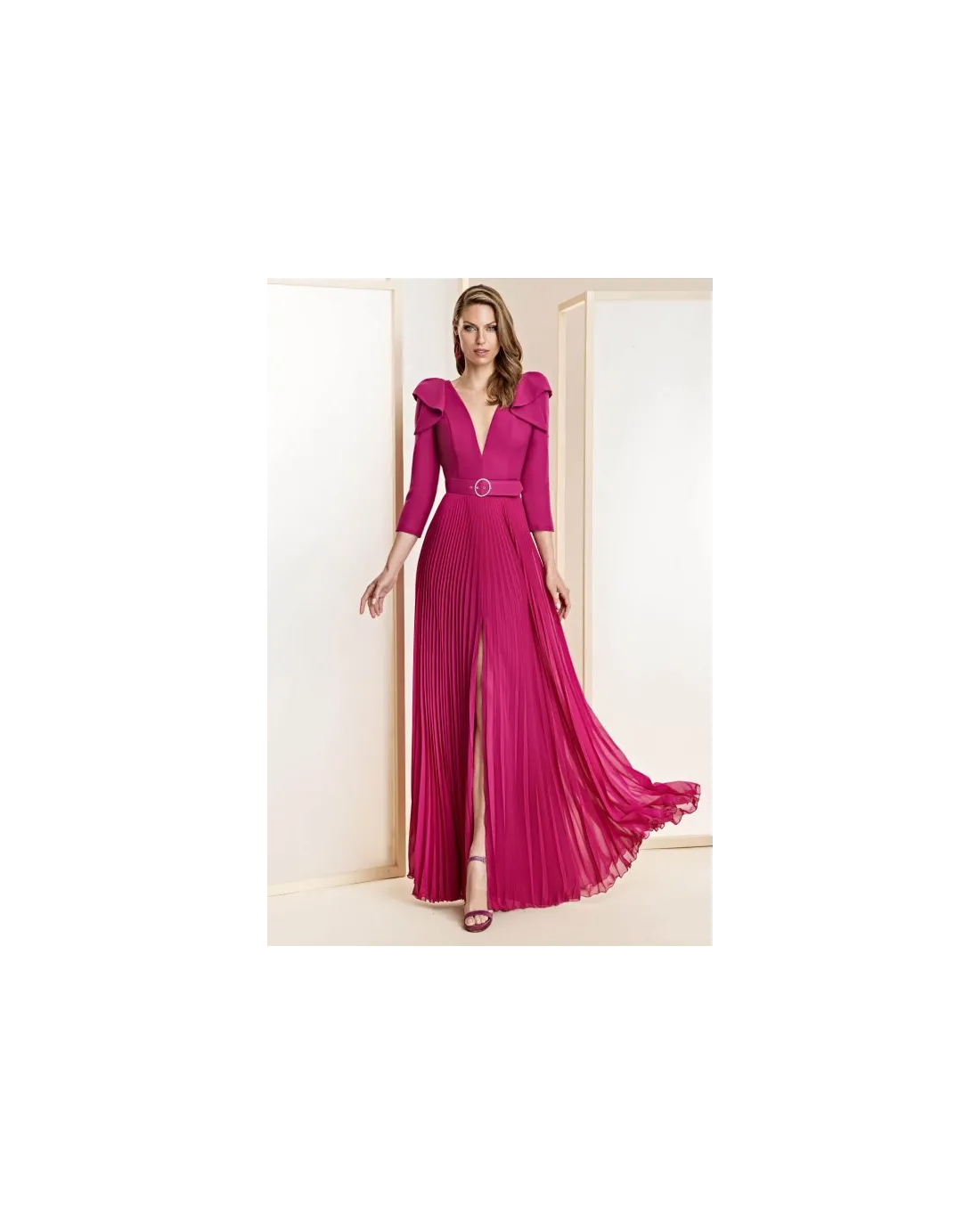 Vestido largo con escote en V por la parte delantera y más pronunciado por detrás, manga francesa con aplique de volante en el hombro confeccionado en crepé y falda larga plisada con abertura central y cinturón al tono.