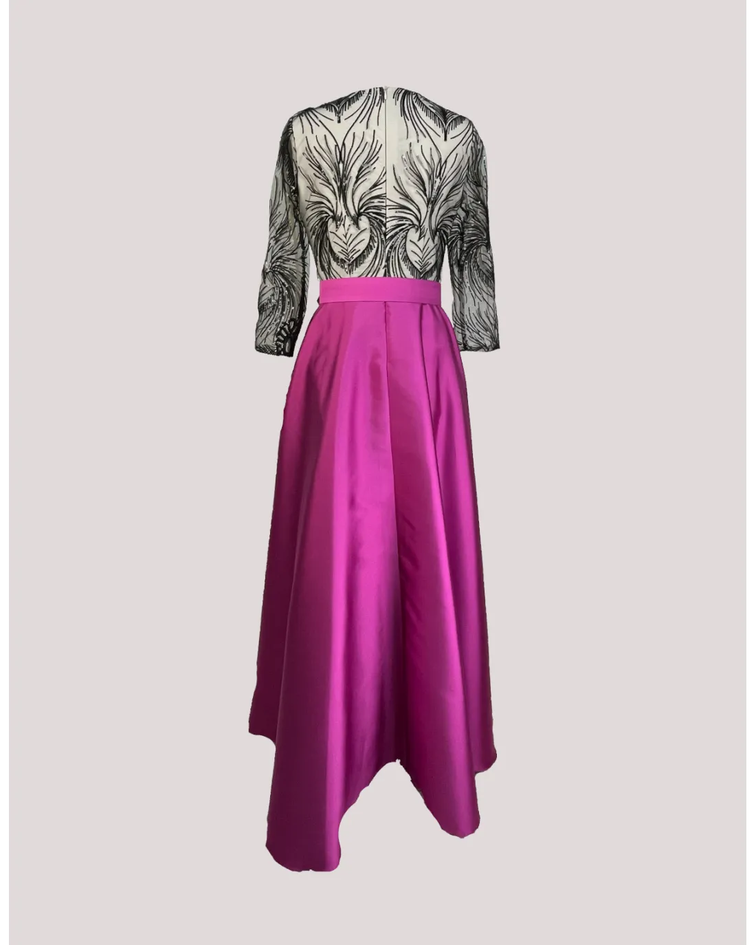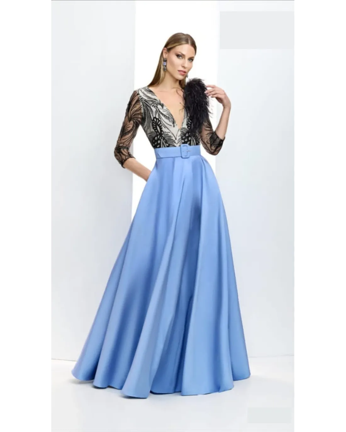 Vestido largo confeccionado con doble tejido, cuerpo de encaje con manga 3/4 semi-transparente, escote en V y aplique de plumas al tono en un lado. Falda larga confeccionada en tejido mikado con bolsillos laterales y cinturón al tono. Cierre de cremallera trasera invisible.