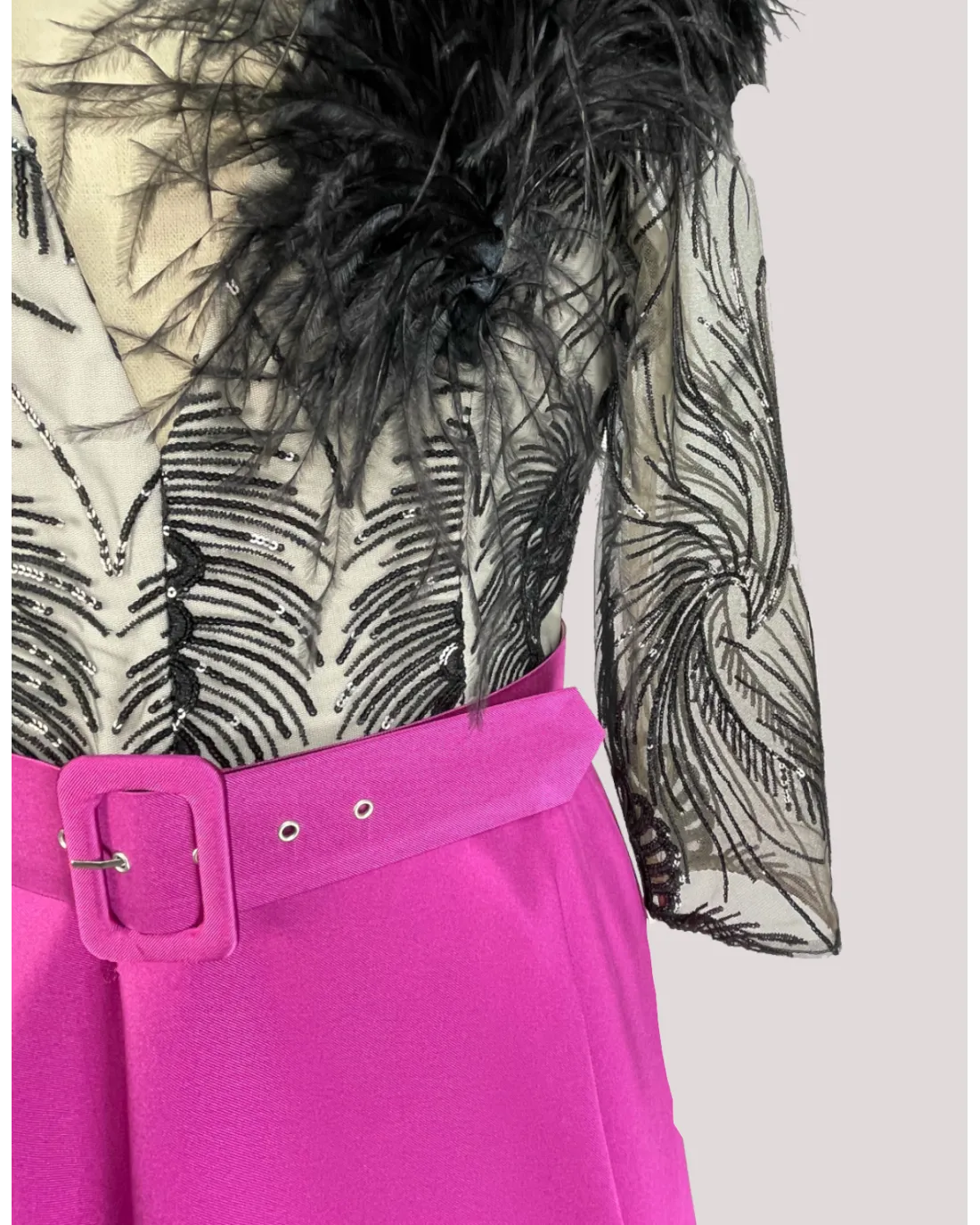 Vestido corto confeccionado en tejido mikado, escote en V, manga larga acabada en plumas al tono. El vestido está cortado a la cintura con un peplum en un lateral donde abre el tejido dejando ver un tul bordado con lentejuelas a contraste al igual que en la mitad de la espalda.