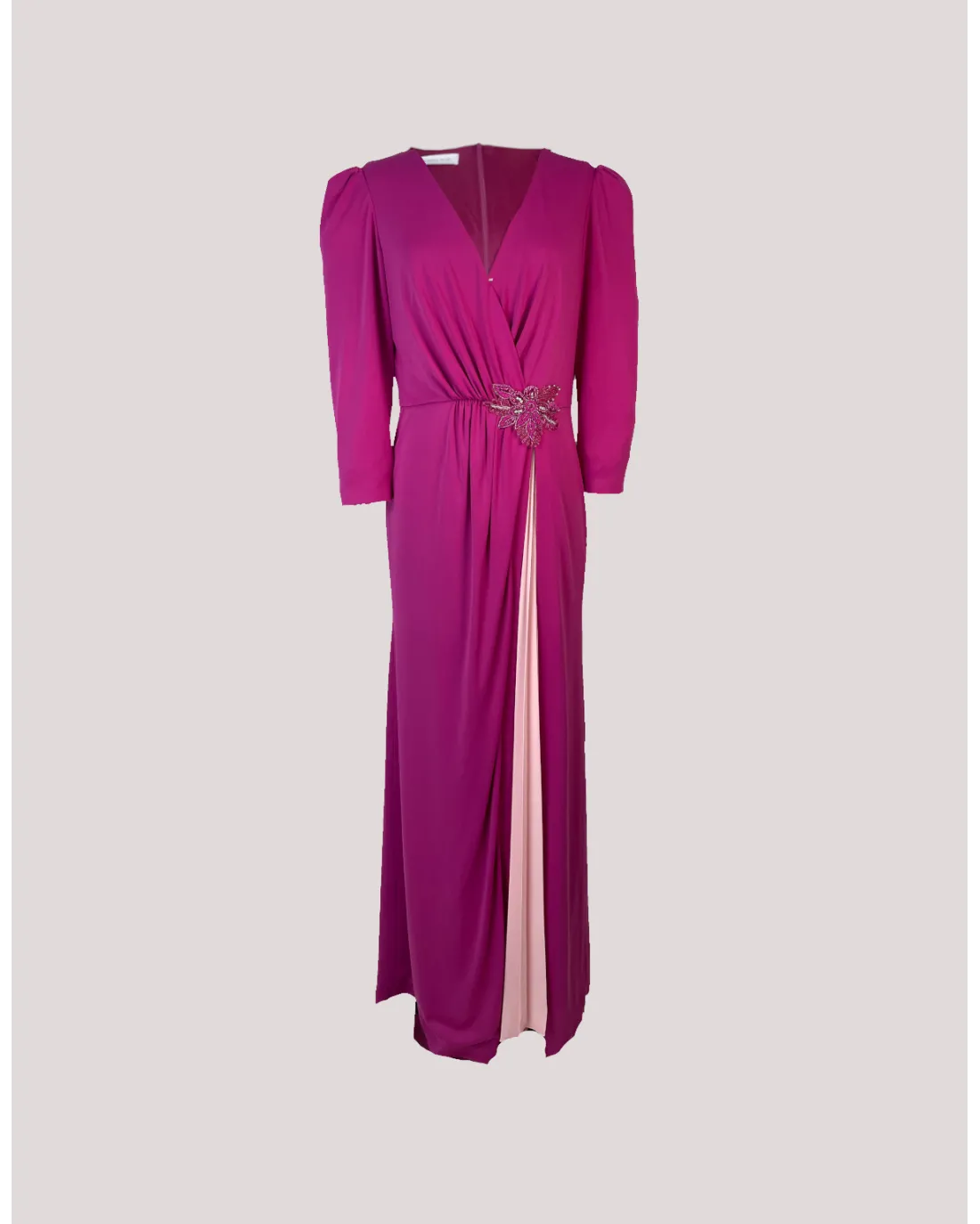 Vestido largo confeccionado en tejido crepé con capelina confeccionada en gasa asimétrica. El cierre del vestido es de cremallera trasera invisible. Flor y broche NO incluido.