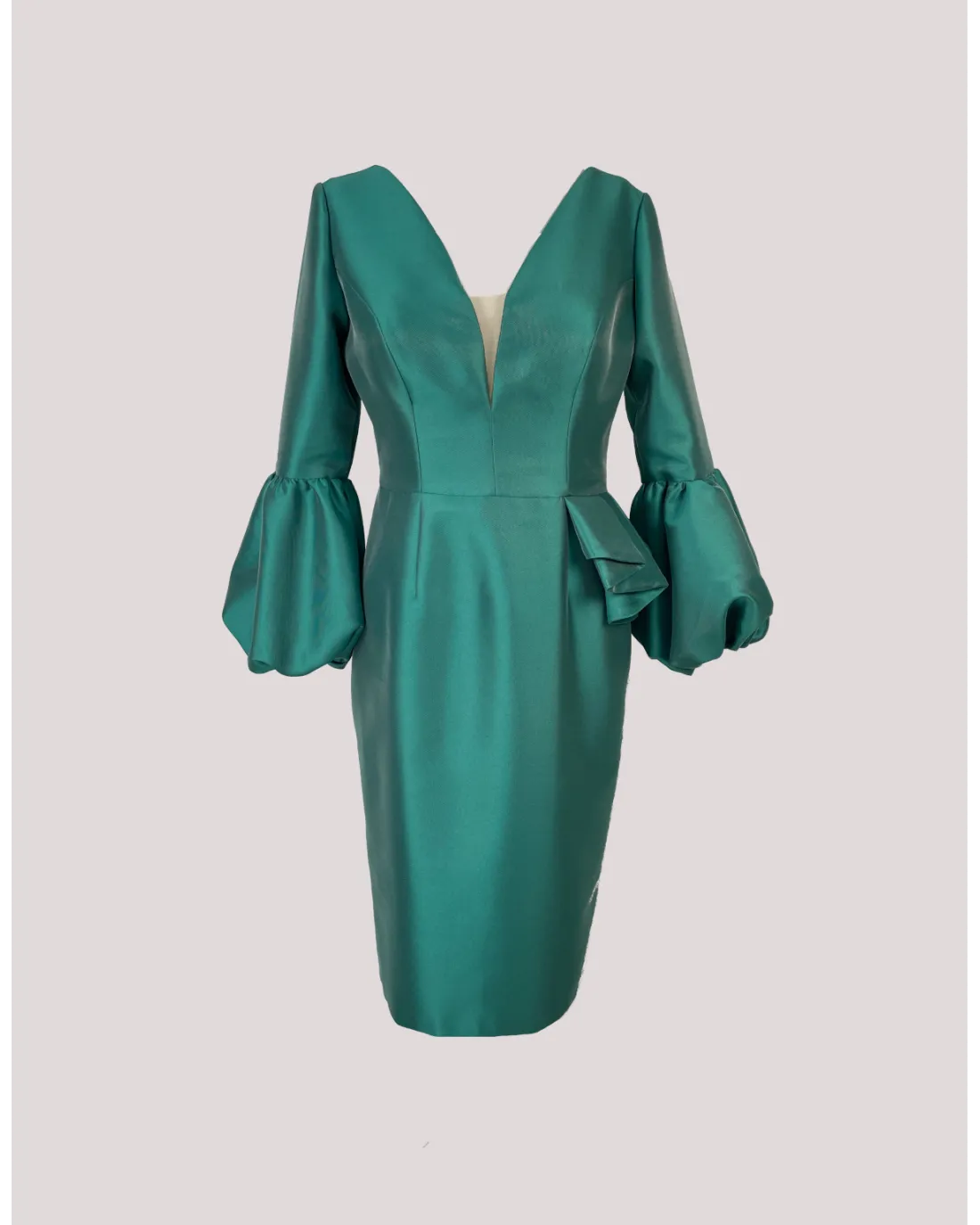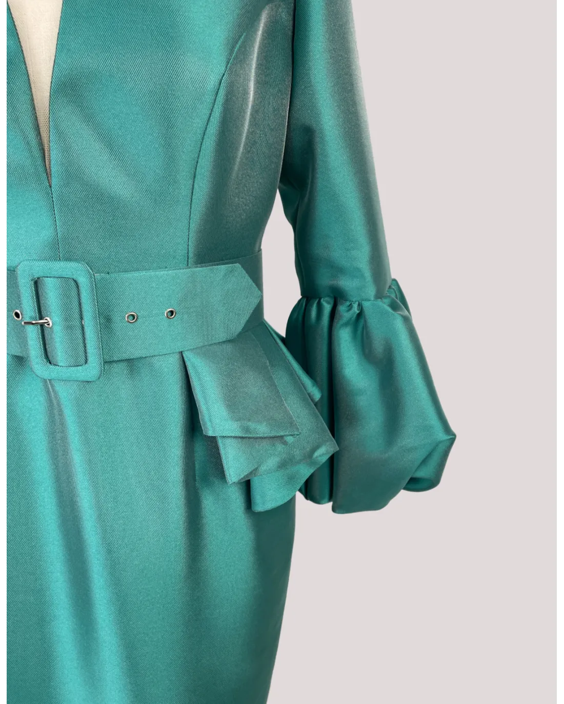 Vestido corto confeccionado en tejido mikado con manga larga acabada en farol, escote en V que se prolonga hasta la espalda. Cortado a la cintura y un lateral nos deja ver un pequeño plumeti. Incluye cinturón al tono.