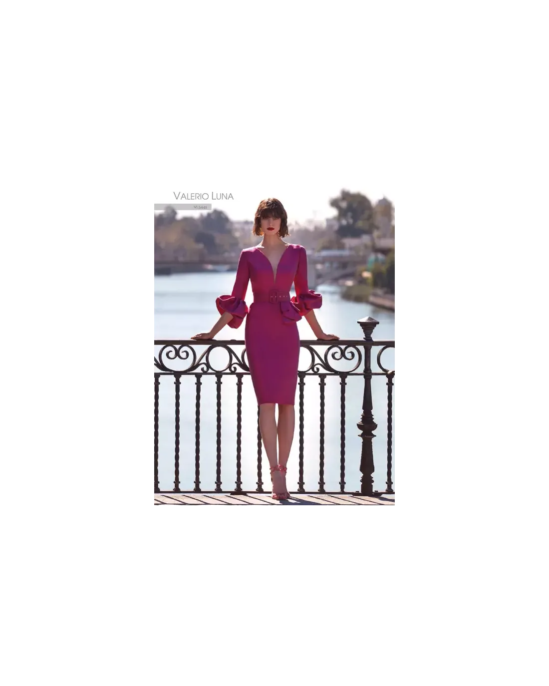Vestido de largo midi confeccionado en tejido crepé de corte ajustado, escote cruzado en V drapeado y manga corta de volantes. El vestido cierra con cremallera trasera invisible y lleva una abertura trasera.