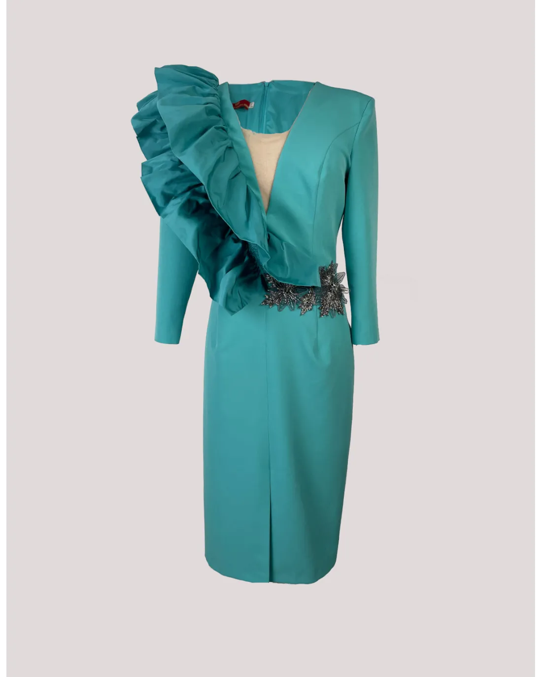 Vestido corto confeccionado en tejido crepé con escote en V pronunciado y volante lateral confeccionado en tejido tafetán donde acaba en un bonito aplique. El vestido es acabado en una abertura central, con manga larga y cierre de cremallera trasera invisible.