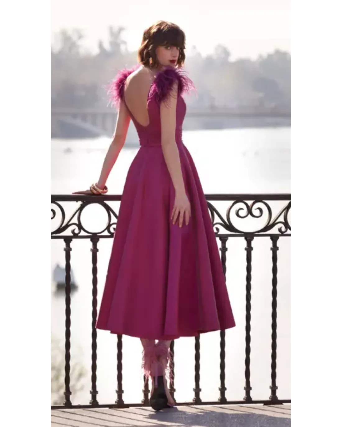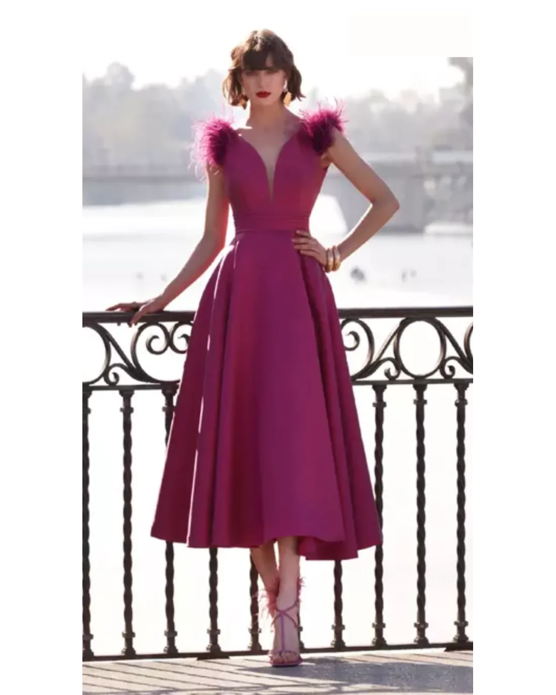 Vestido corto confeccionado en tejido mikado con manga larga acabada en farol, escote en V que se prolonga hasta la espalda. Cortado a la cintura y un lateral nos deja ver un pequeño plumeti. Incluye cinturón al tono.