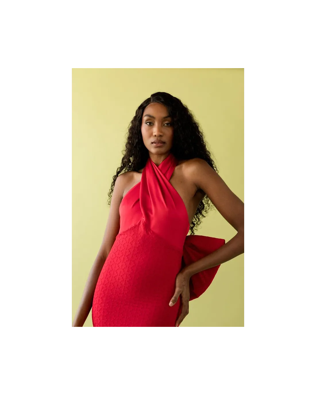 Vestido Esthefan de corte recto a media pierna confeccionado en un tejido mikado, con escote redondo y espalda transparente con tul, pedrería y fila de botones al tono, maga francesa con hombros de volantes y pedrería.