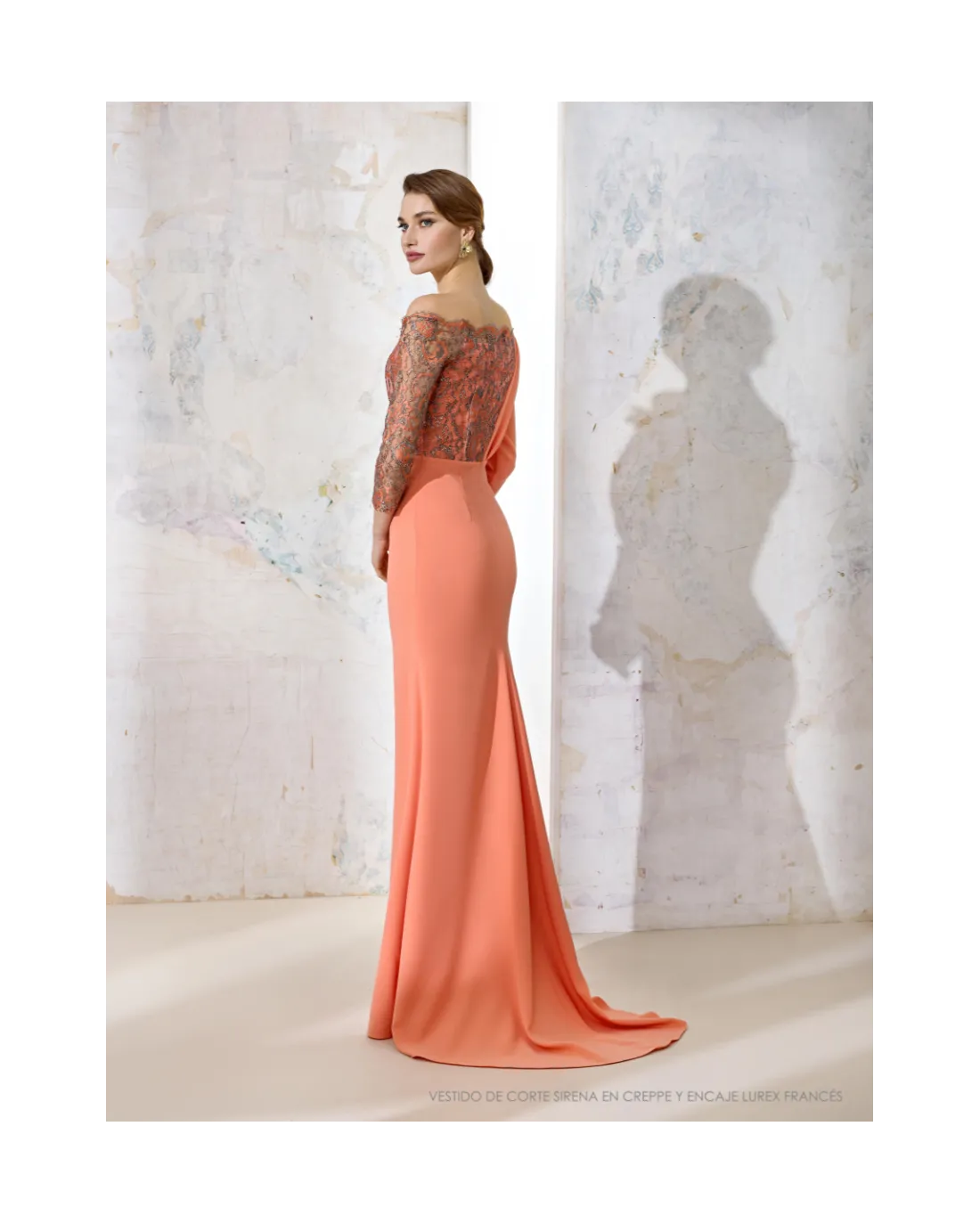 Elegante vestido largo confeccionado en tejido crepé pétalo con escote de solapas en diferente tejido, manga 3/4 con cinturón al tono con aplique plateado y cascada. El cierre del vestido es de cremallera invisible trasera con fila de botones del mismo tejido.
