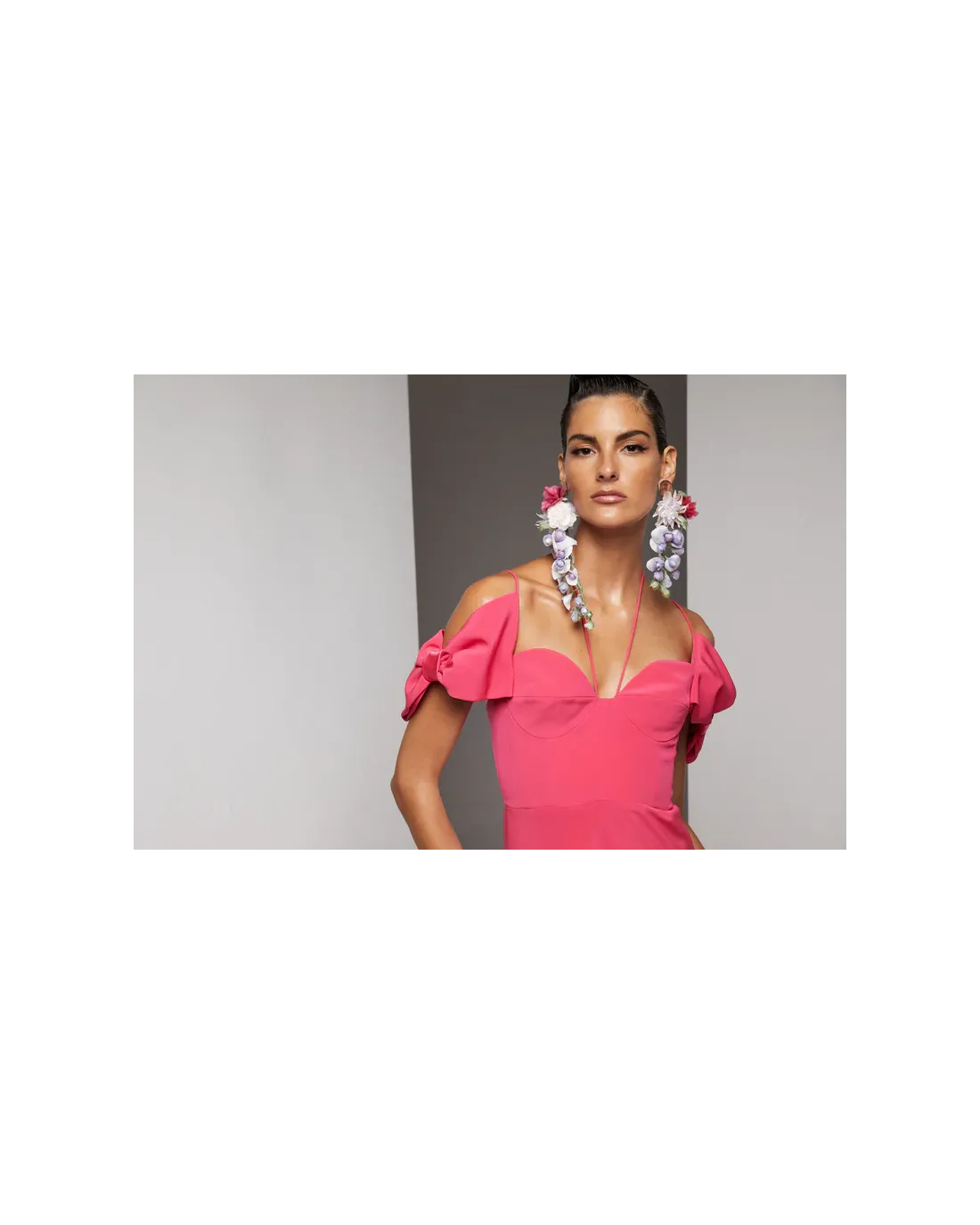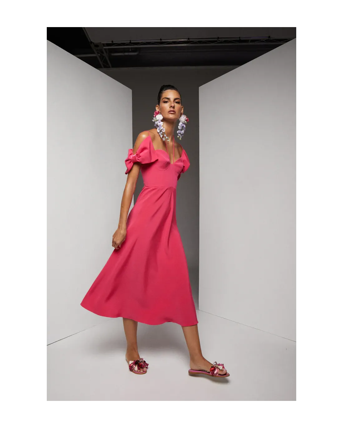Vestido de largo midi confeccionado en tejido crepé pétalo, de manga corta con tirantes finos, escote pronunciado y ballenas para poder realzar. La falda tiene un bonito movimiento puesto que es con forma evasé.