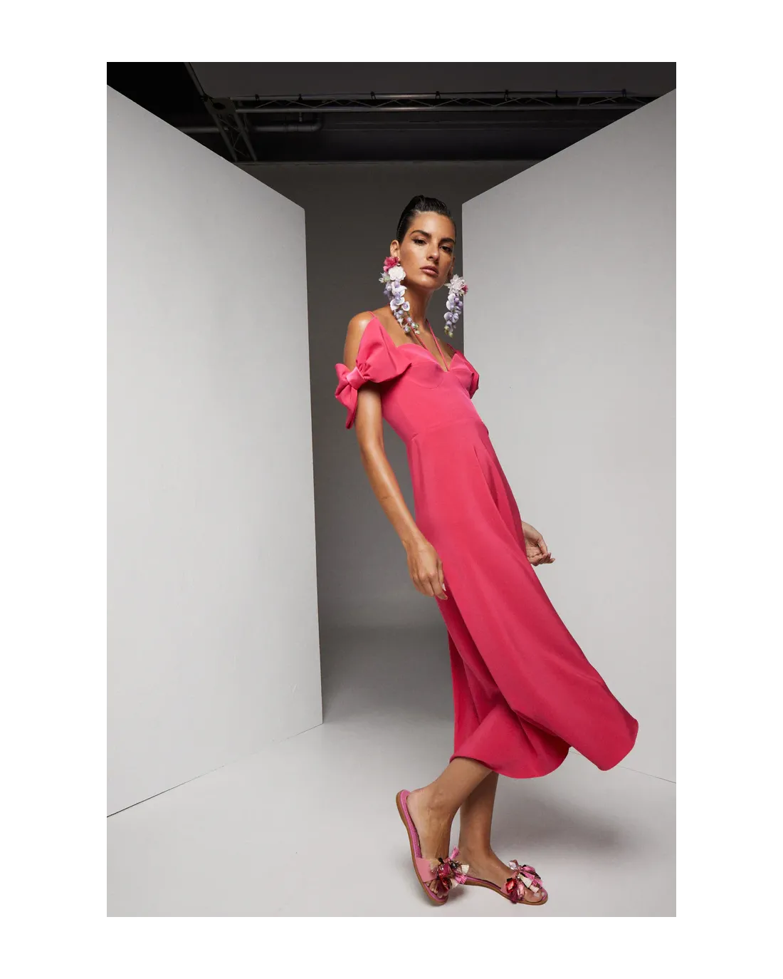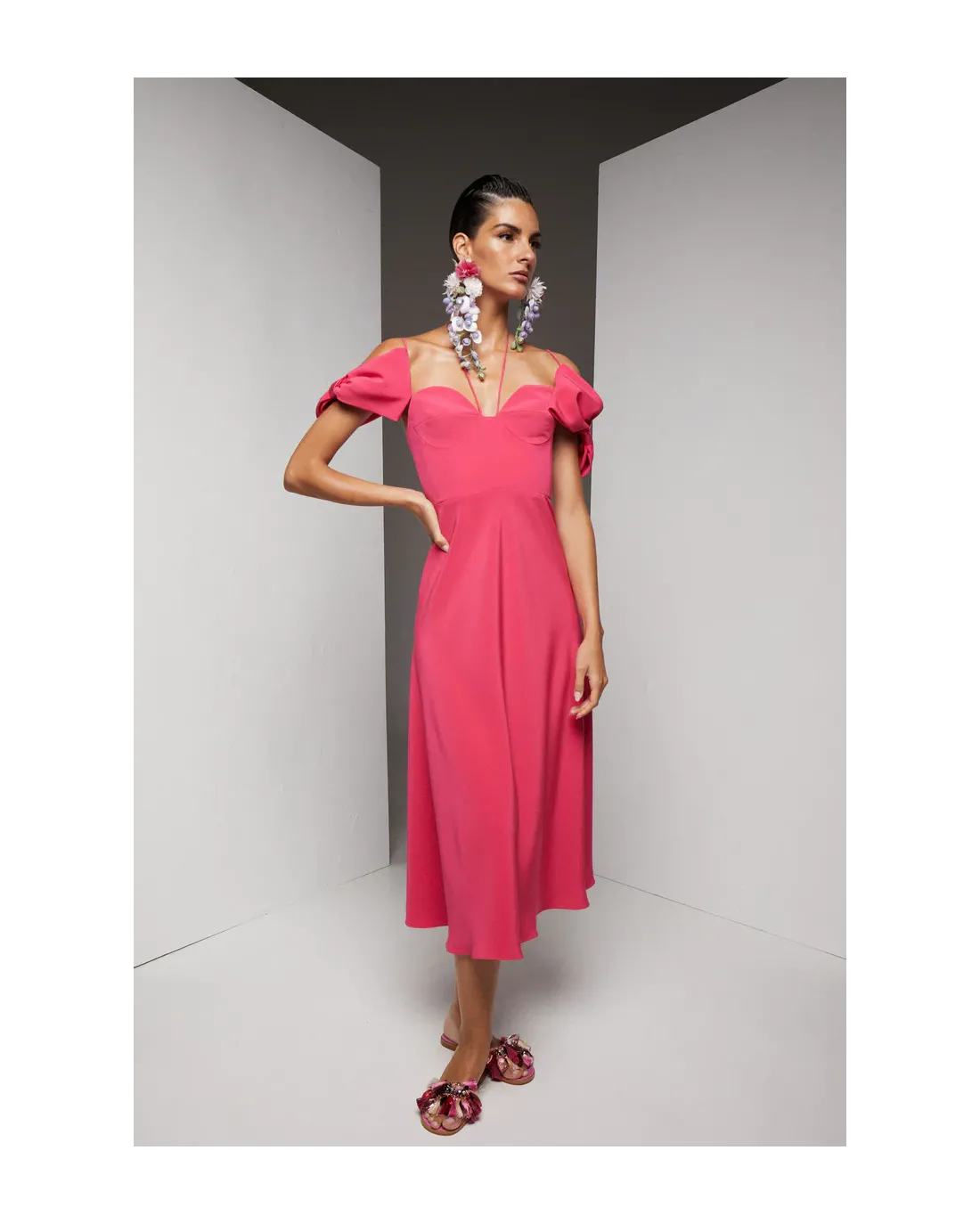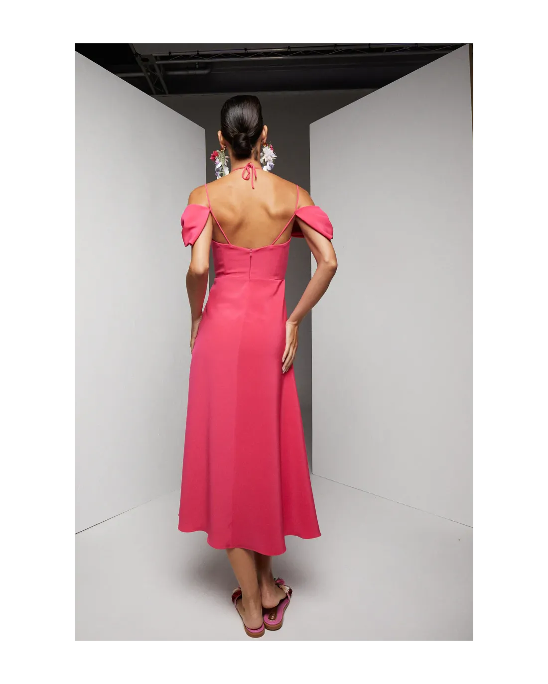 Vestido de largo midi confeccionado en tejido crepé con cuello halter, espalda baja y maxi lazo confeccionado en seda en la parte alta de la espalda.