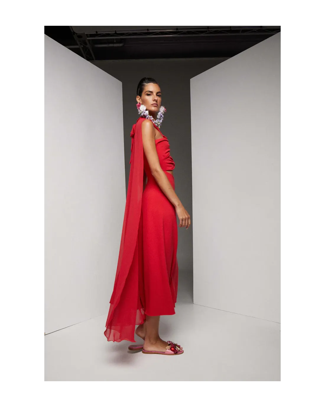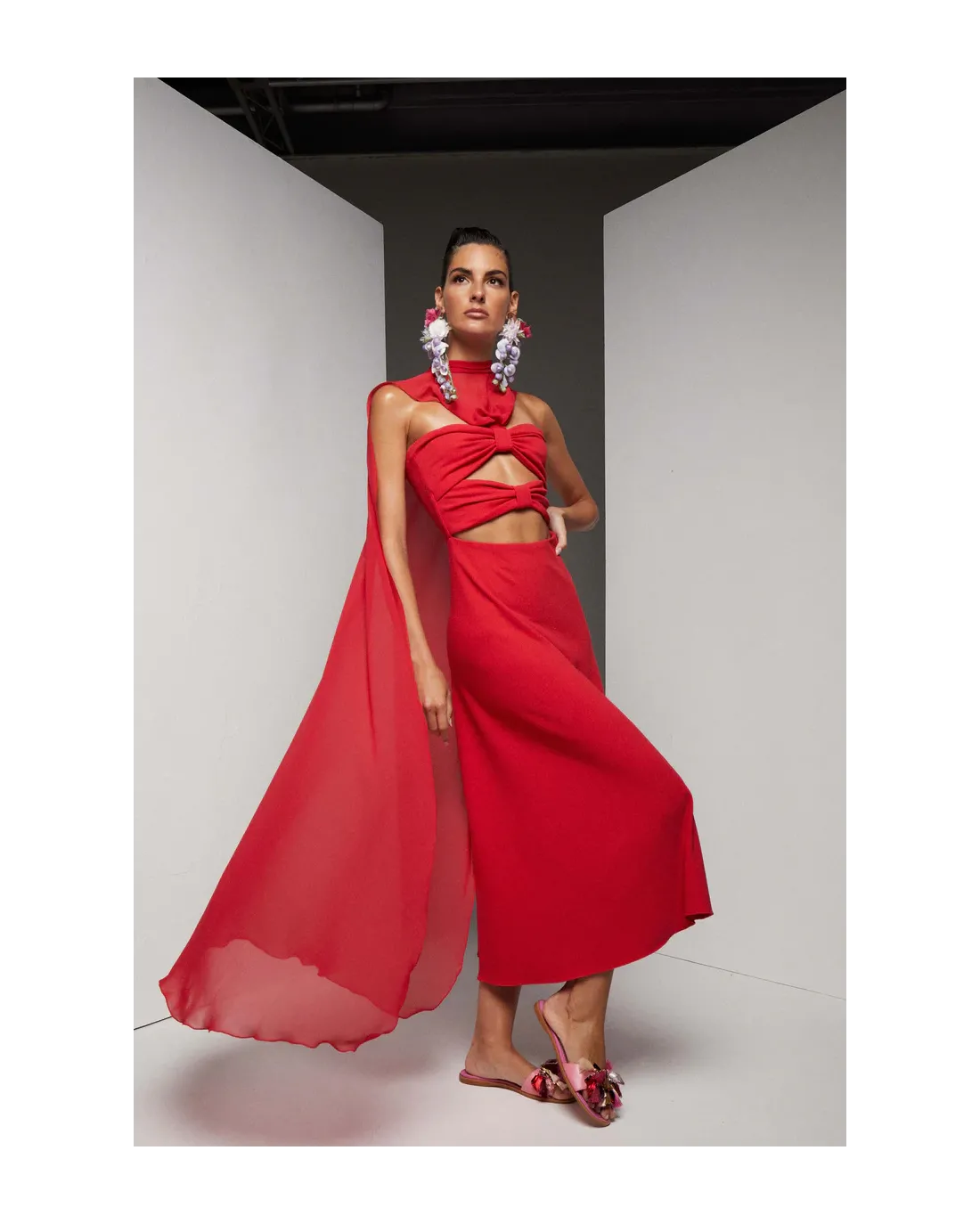 Vestido de largo midi con estampado en pajaritos dorados con amplio escote, manga corta abullonada cortado a la cintura con falda evasé y abertura lateral.