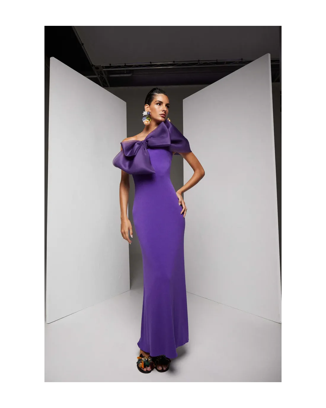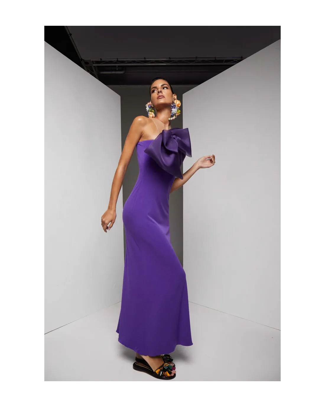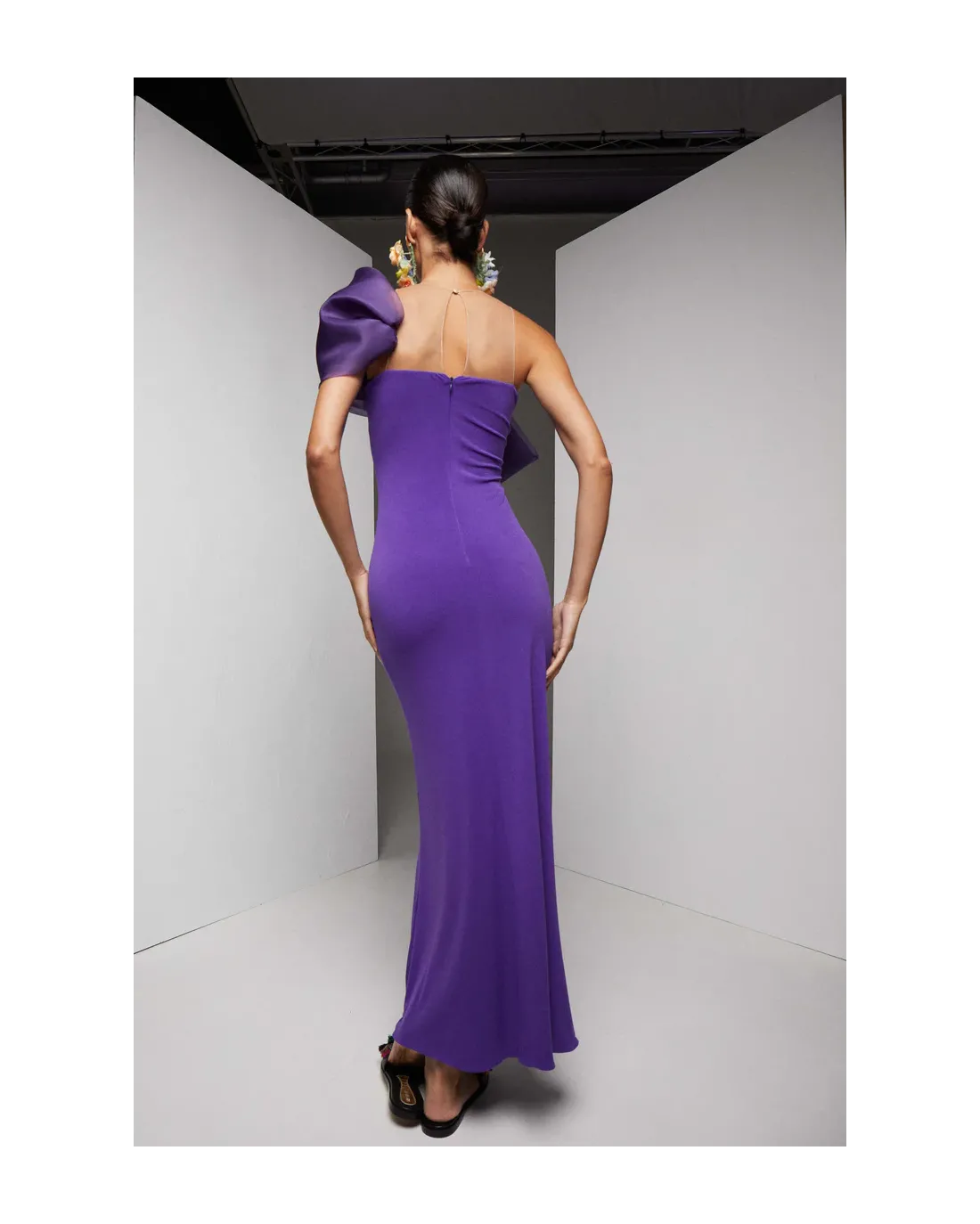 Vestido largo confeccionado en un punto de seda con un maxi lazo confeccionado en seda, efecto palabra de honor.