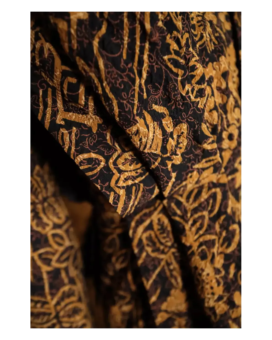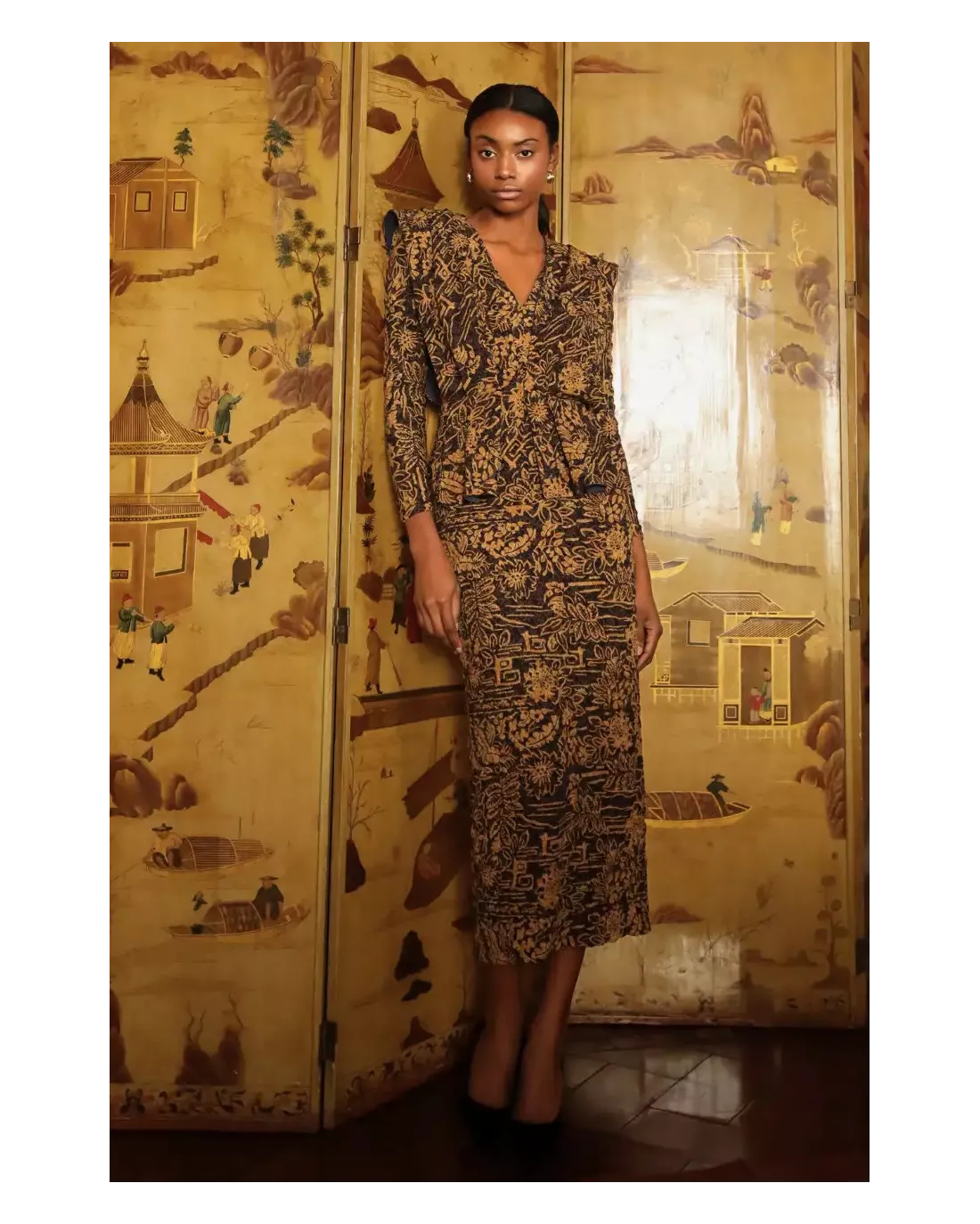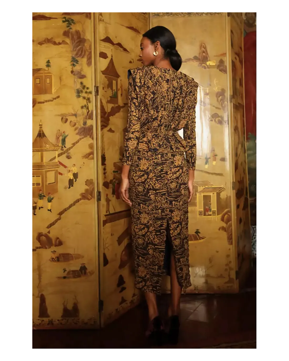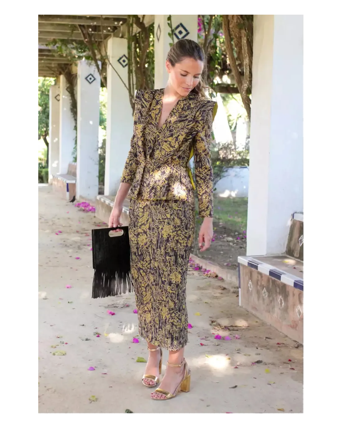 Vestido largo con escote en V por la parte delantera y más pronunciado por detrás, manga francesa con aplique de volante en el hombro confeccionado en crepé y falda larga plisada con abertura central y cinturón al tono.