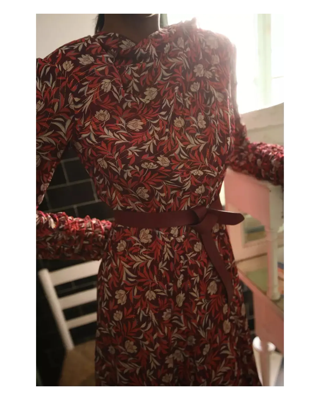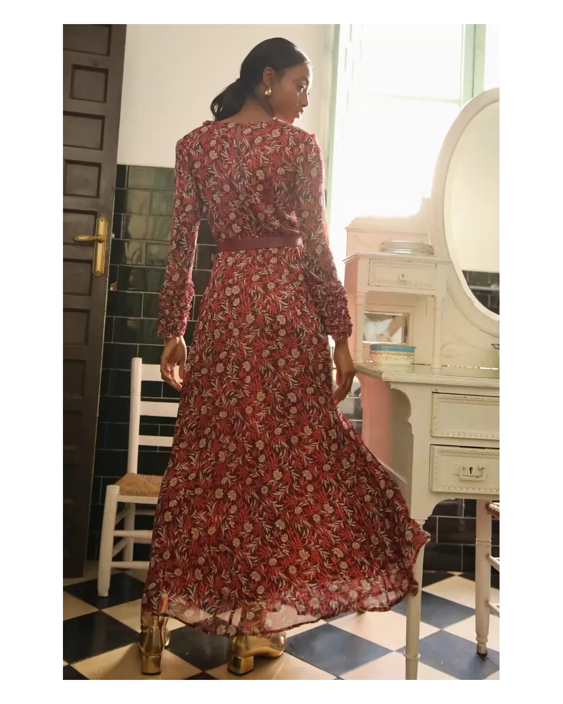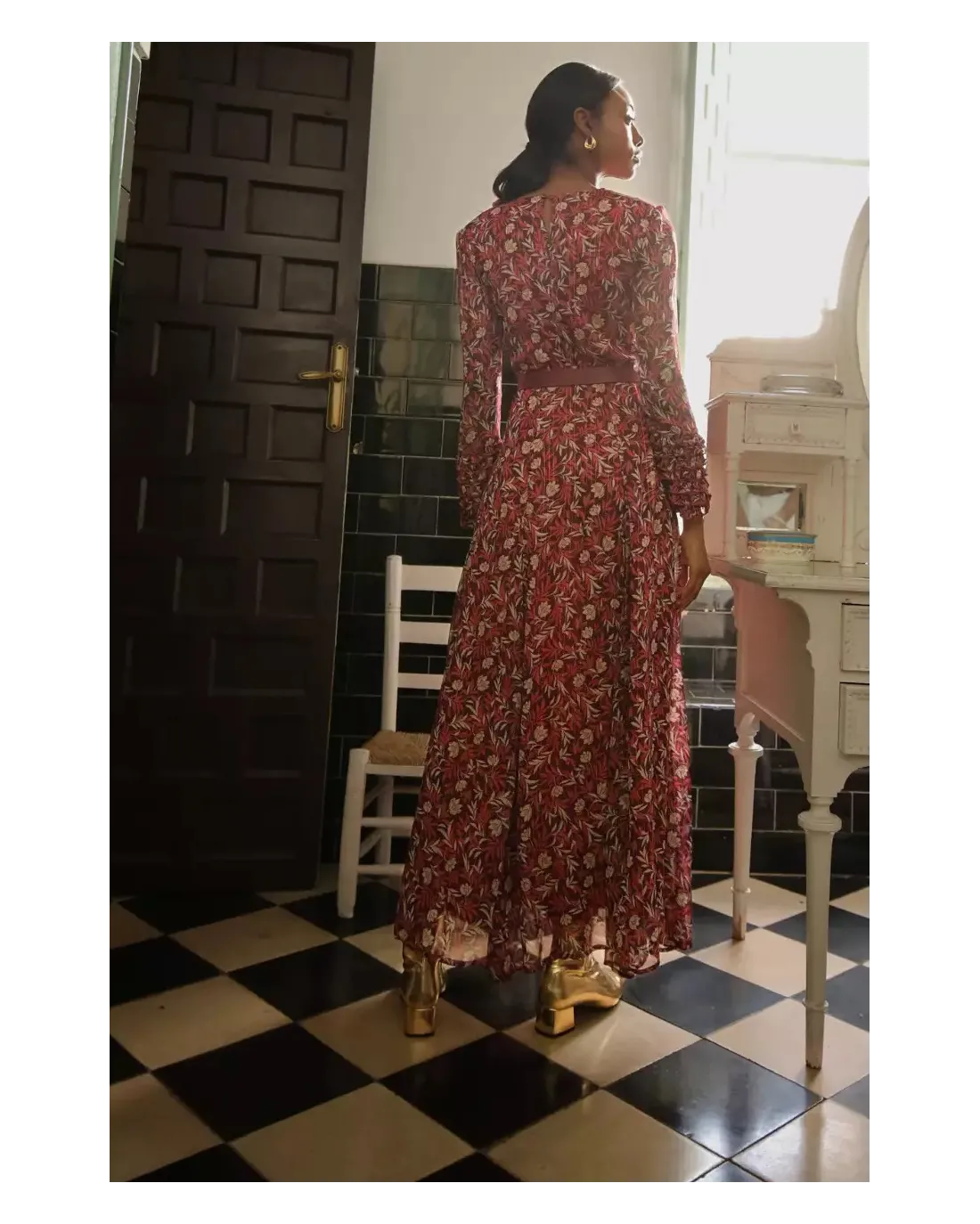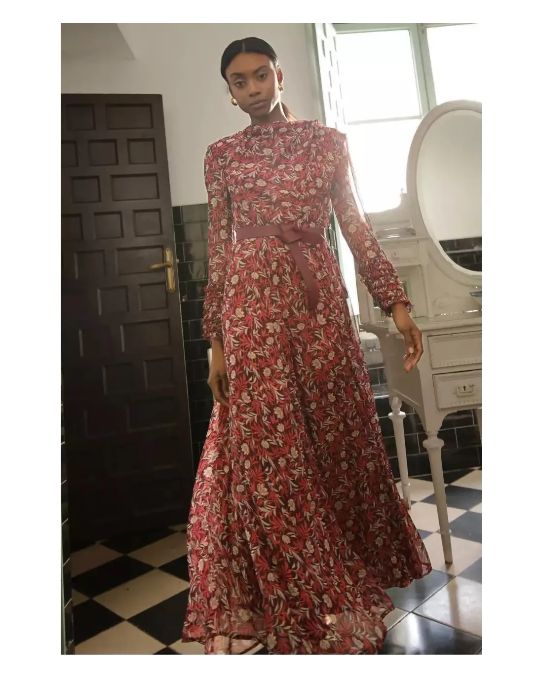 Vestido de largo midi estampado con pecho drapeado, manga larga acabada en volantes y falda evasé. Su cierre es de cremallera lateral invisible.
