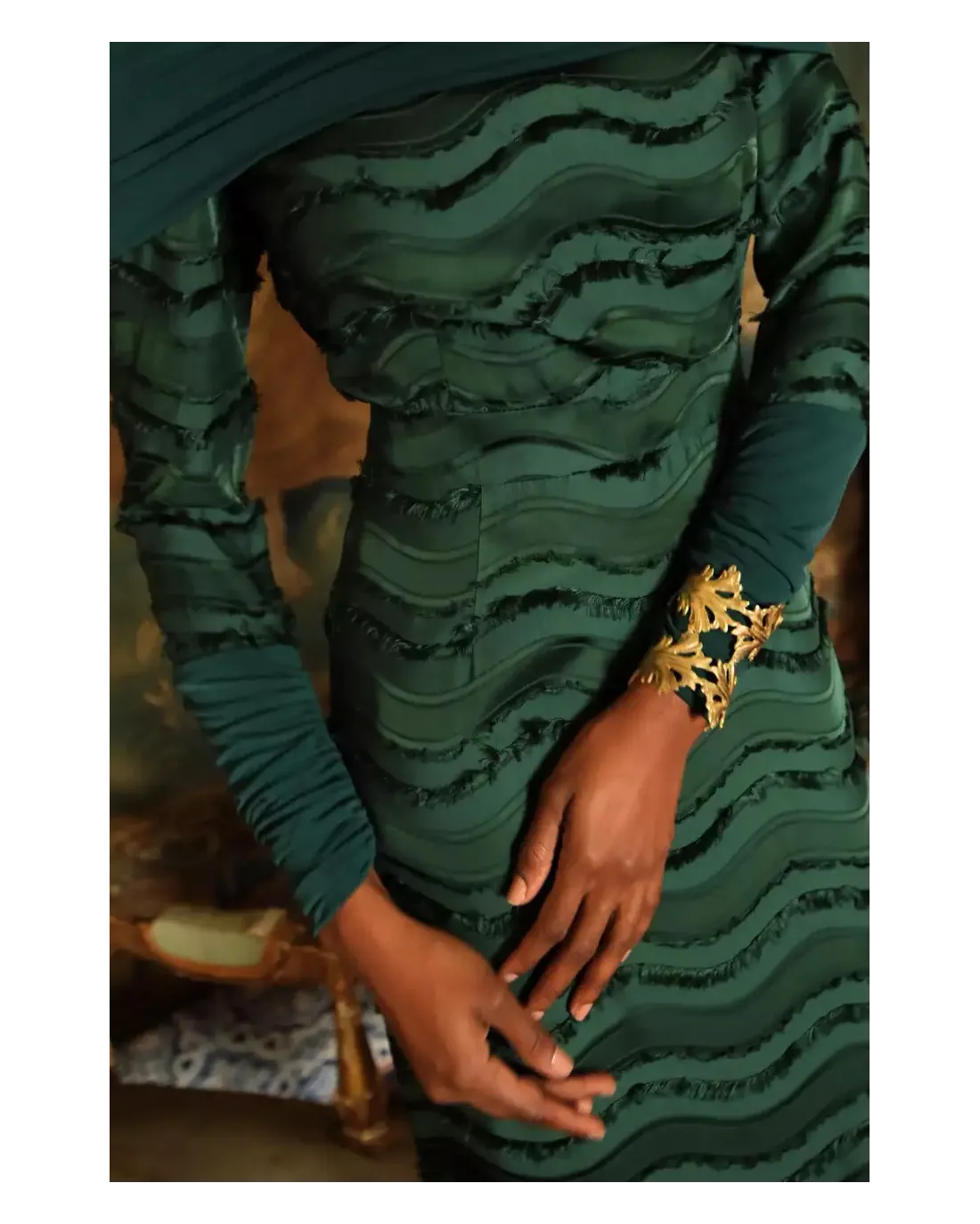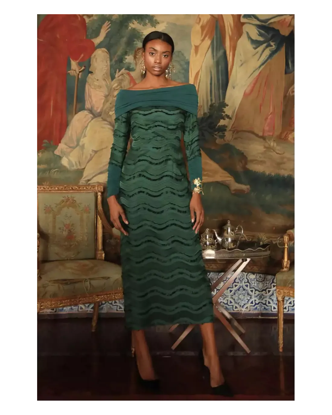 Vestido de largo midi confeccionado tejido elástico con flecos, manga larga acabada en puño. Cuello barco para poder volverlo.
