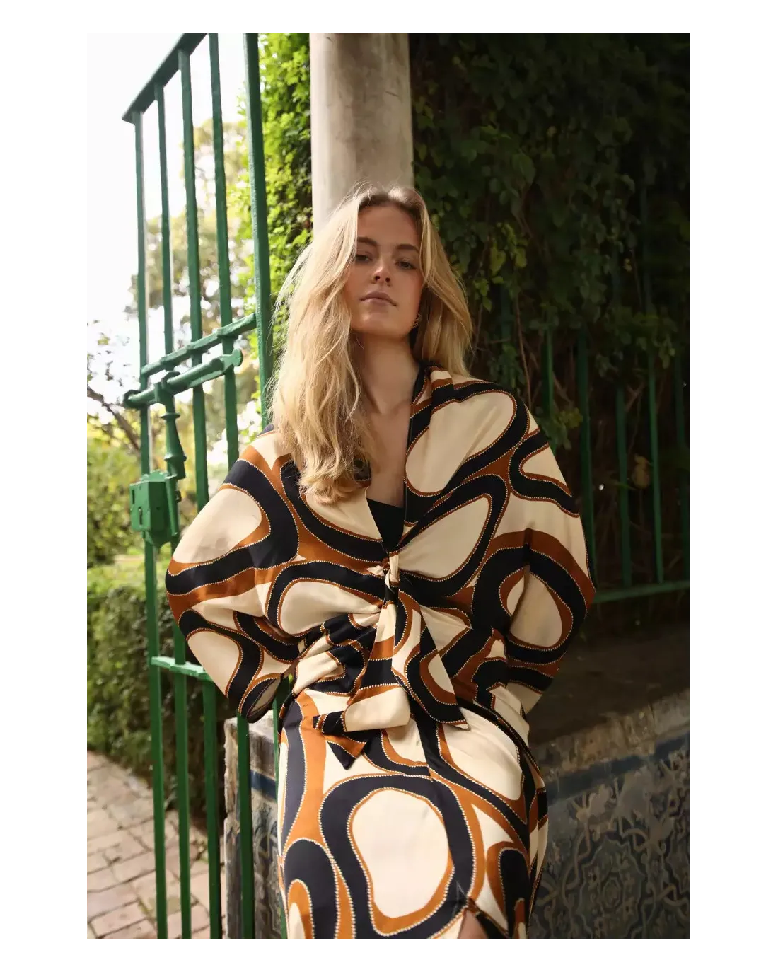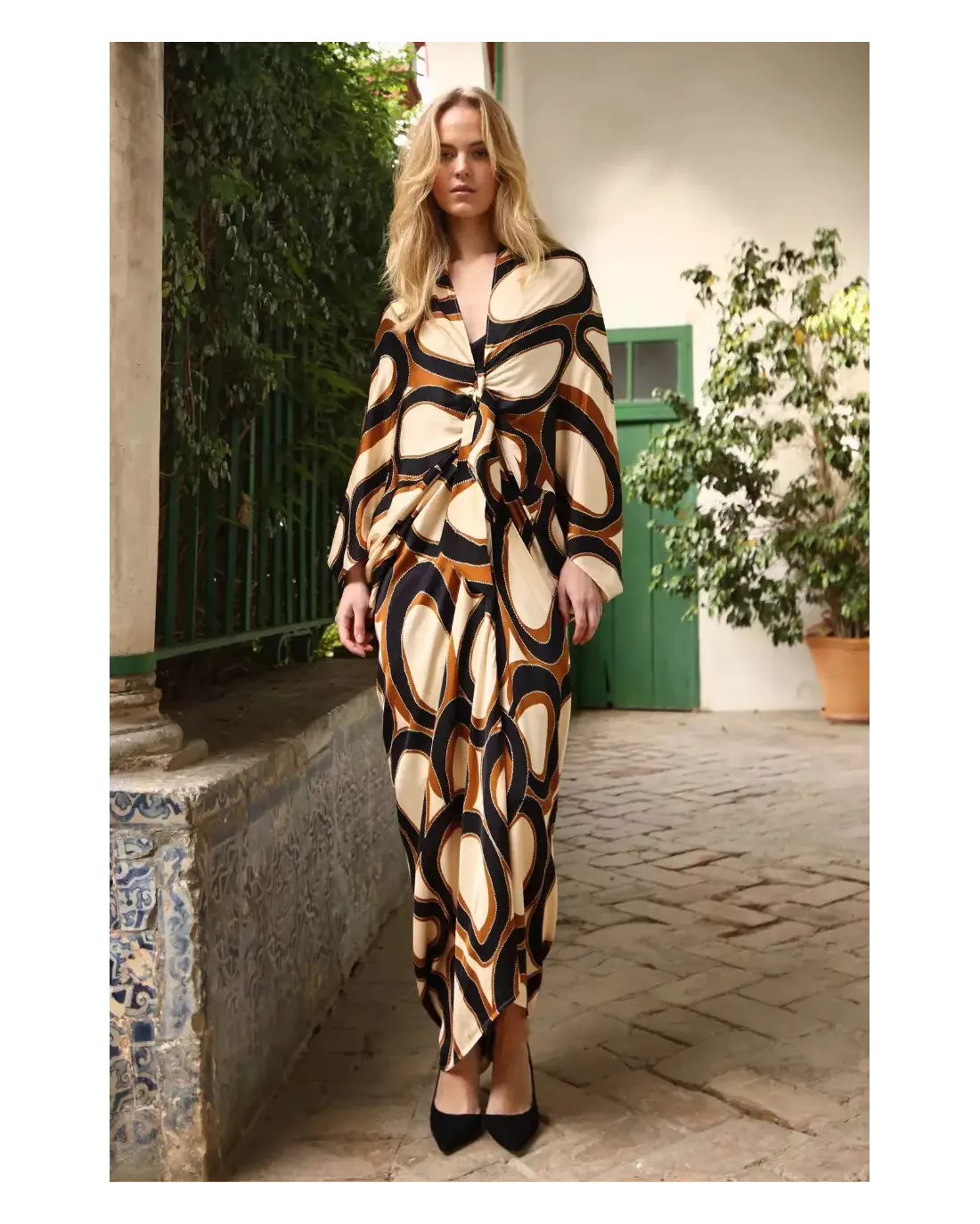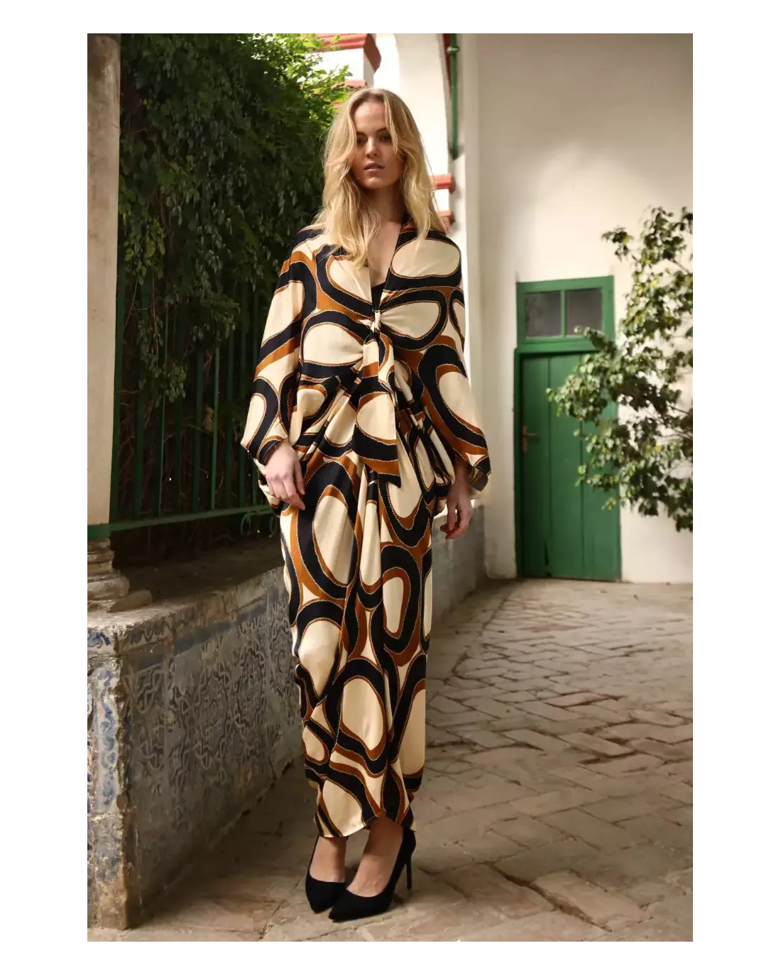 Vestido de largo midi con lunares, confeccionado en tejido filudo con mangas de murciélago y anudado en el centro.