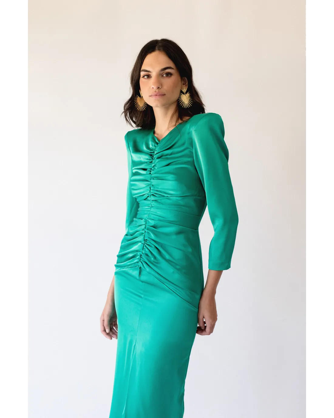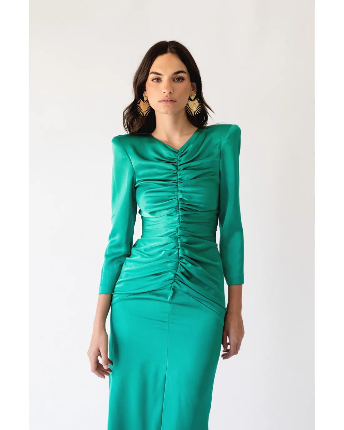 Vestido de largo midi confeccionado en tejido satén con hombros y pecho en lentejuelas. El vestido lleva un drapeado en el centro y abertura trasera.
