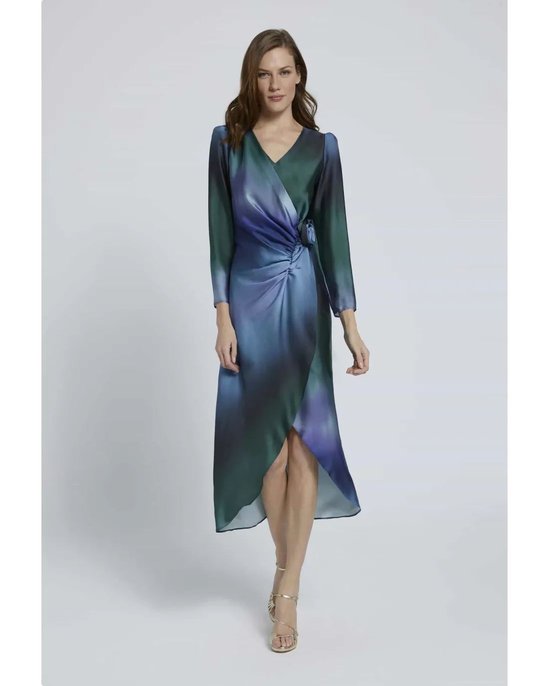 Vestido multicolor confeccionado en un ligero tejido con manga 3/4, escote cruzado y cintura drapeada con flor lateral.