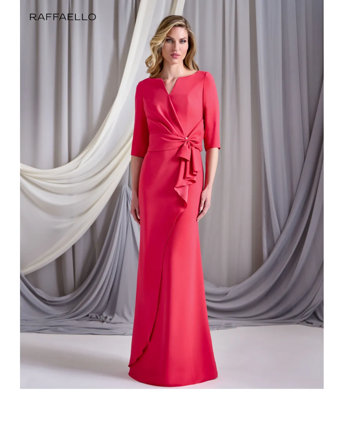 Vestido largo confeccionado en tejido crepé con escote semicerrado, manga 3/4 y cintura drapeada formando una lazada en un lateral. La espalda es cerrada con cremallera invisible y el vestido es acabado en una bonita caída formando una pequeña cola.