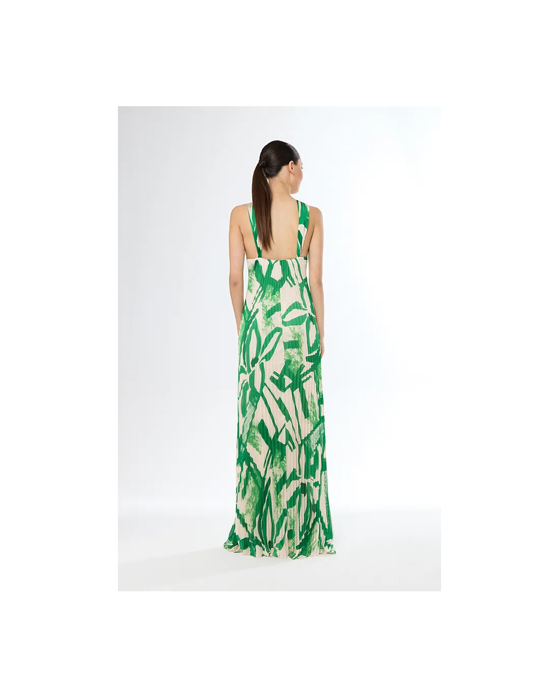 Vestido largo confeccionado en un tejido satinado plisado, pecho plisado con transparencia en pecho y laterales. Tirantes finos trenzados y lazada al tono en cintura.