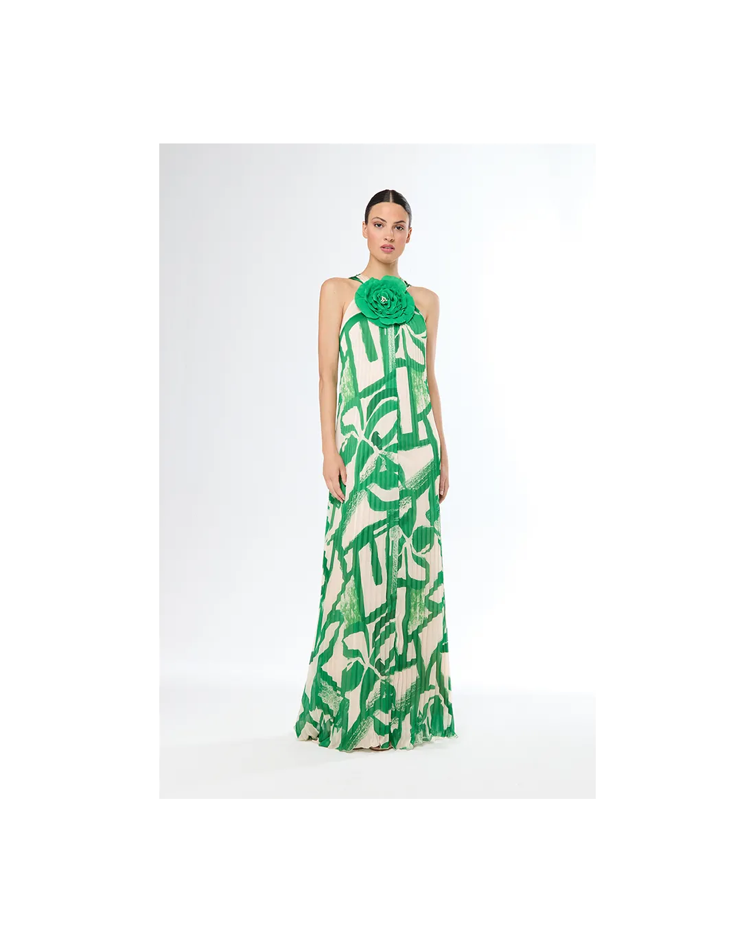 Vestido Largo Plisado con Aplique de Maxi Flor Carla Ruiz