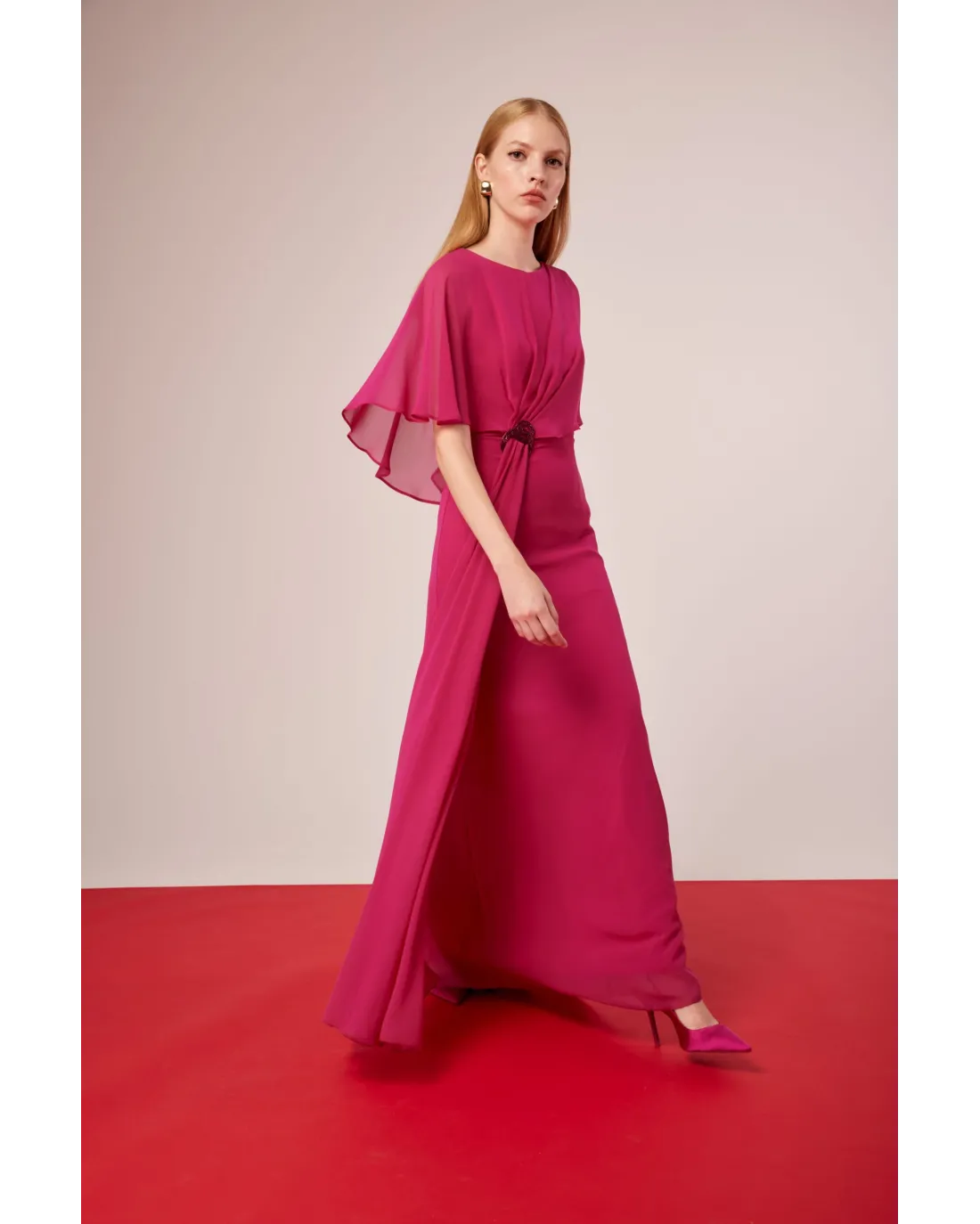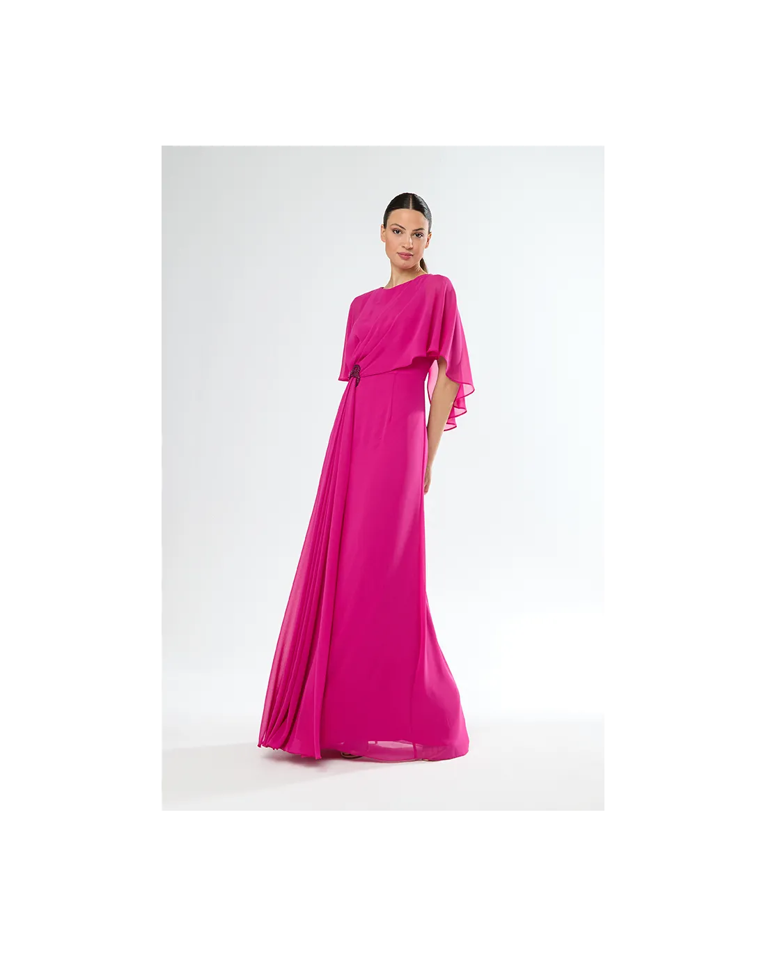 Vestido largo confeccionado en tejido georgette, escote redondo con cuerpo y mangas estilo capa drapeado que cae hacia atrás. Aplique joya en cintura con una bonita caída.