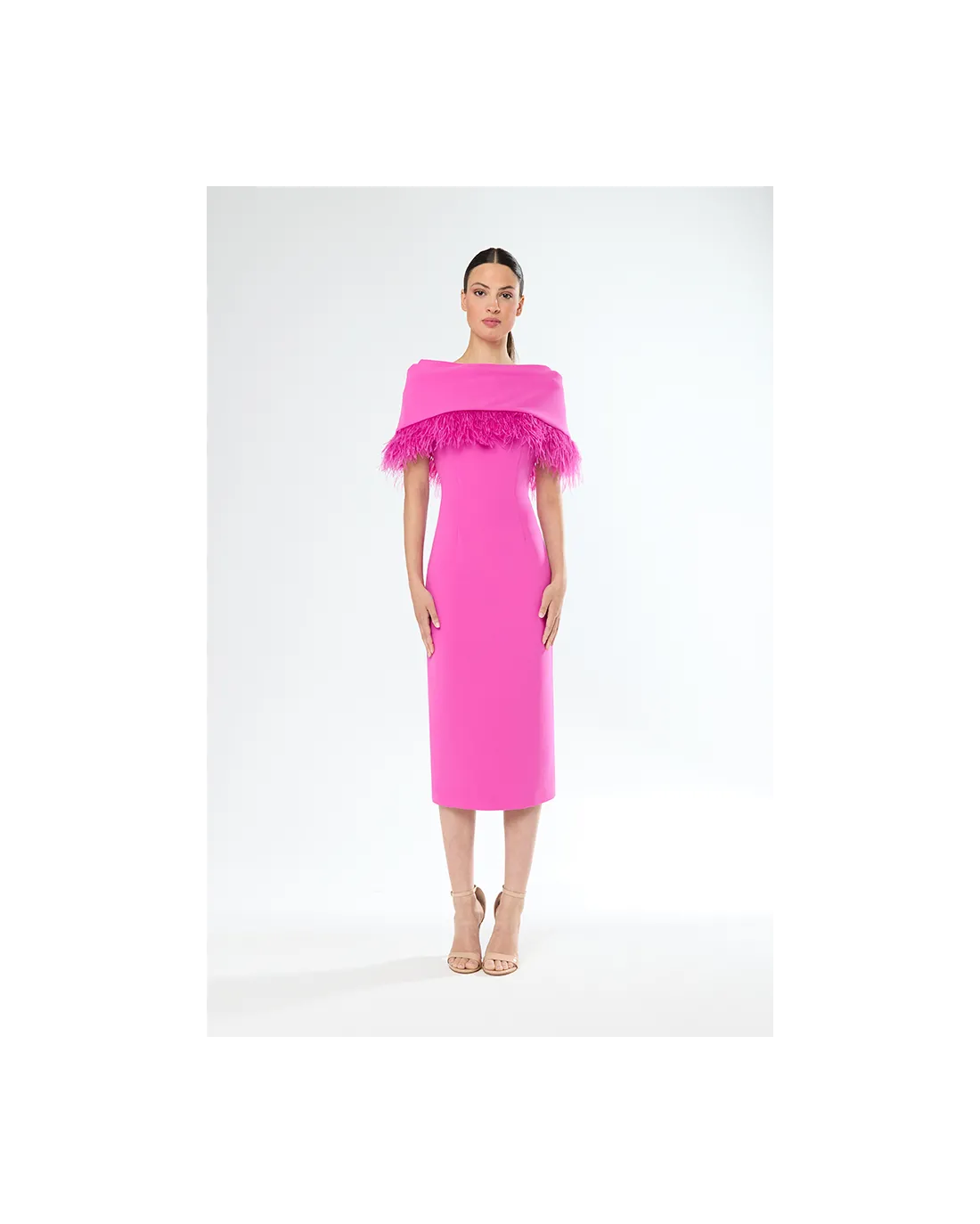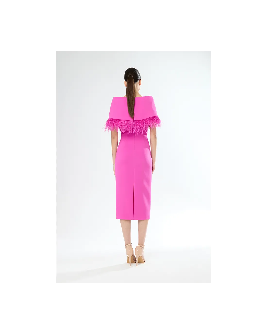 Vestido de largo midi y corte entubado confeccionado en tejido crepé con escote bardot acabado en plumas al tono y su cierre es de cremallera trasera invisible.