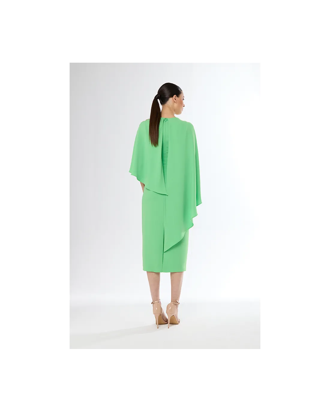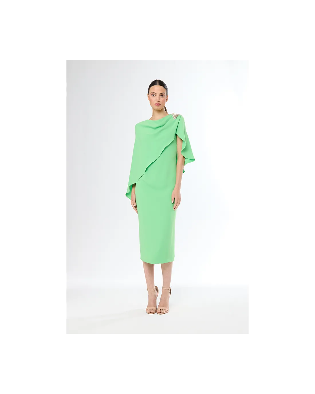 Vestido de largo midi confeccionado en tejido crepé con escote redondo, corte entubado y capelina con aplique dorado en un hombro.