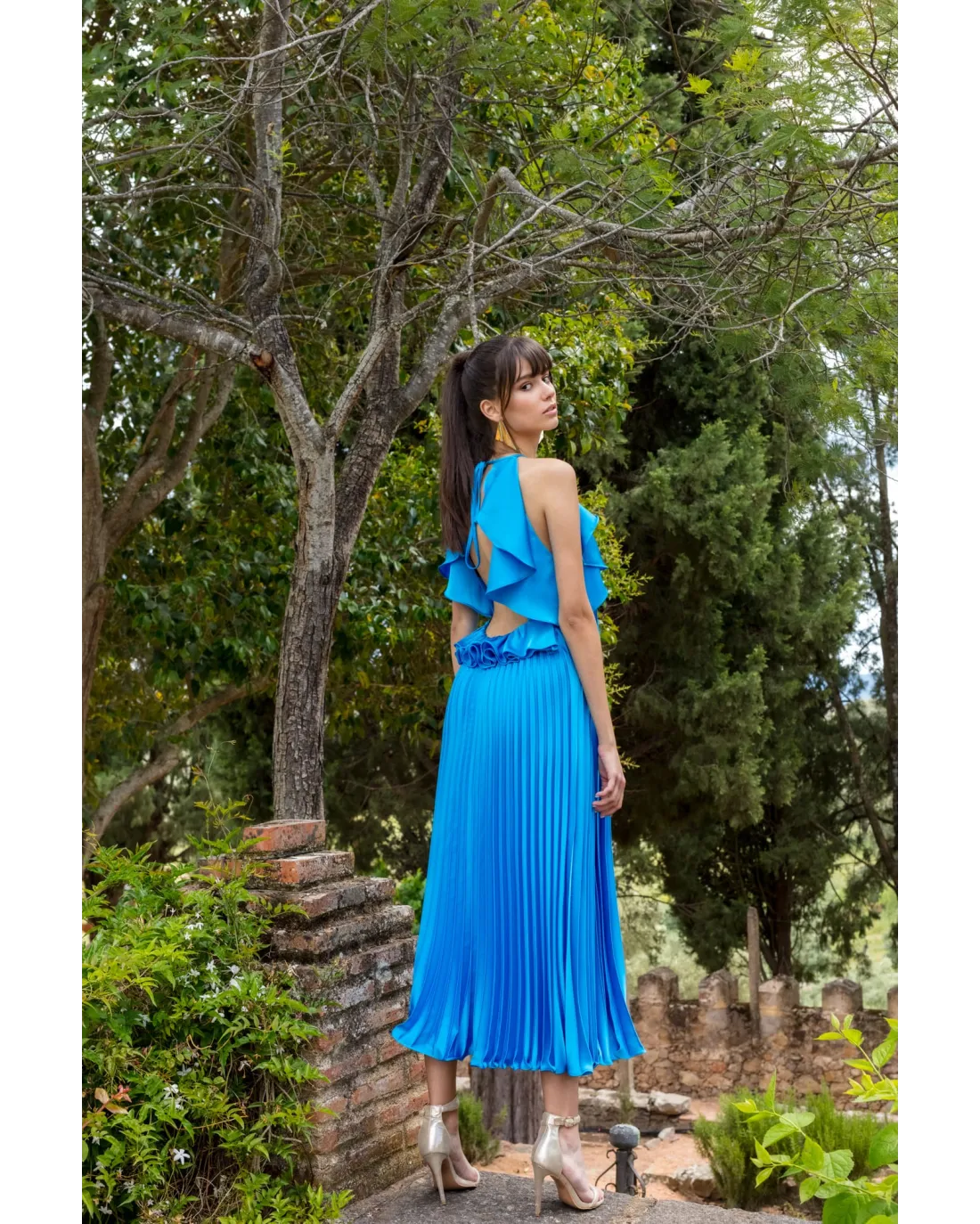 Vestido de largo midi efecto cruzado sin mangas con escote en V corte entubado, lazada al tono y abertura trasera.