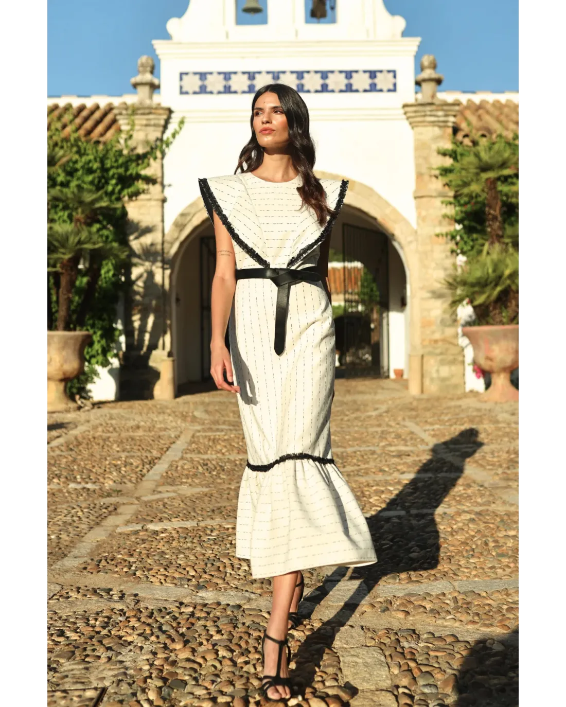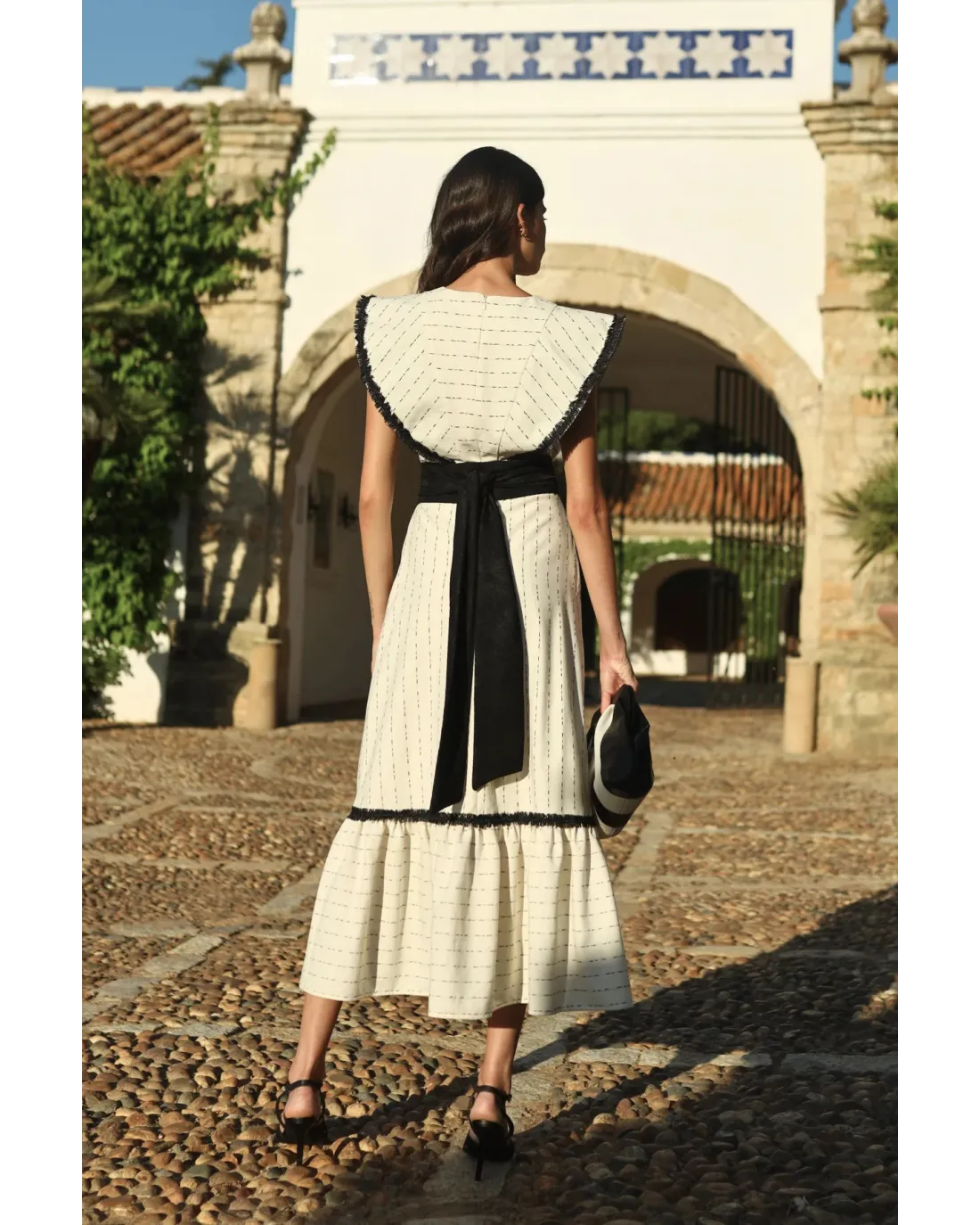 Vestido de largo midi confeccionado en tejido minimalista de rayas muy sutiles con maxi alerón acabado en flecos a contraste y final del vestido con falda evasé y flecos. El cierre es de cremallera trasera invisible.