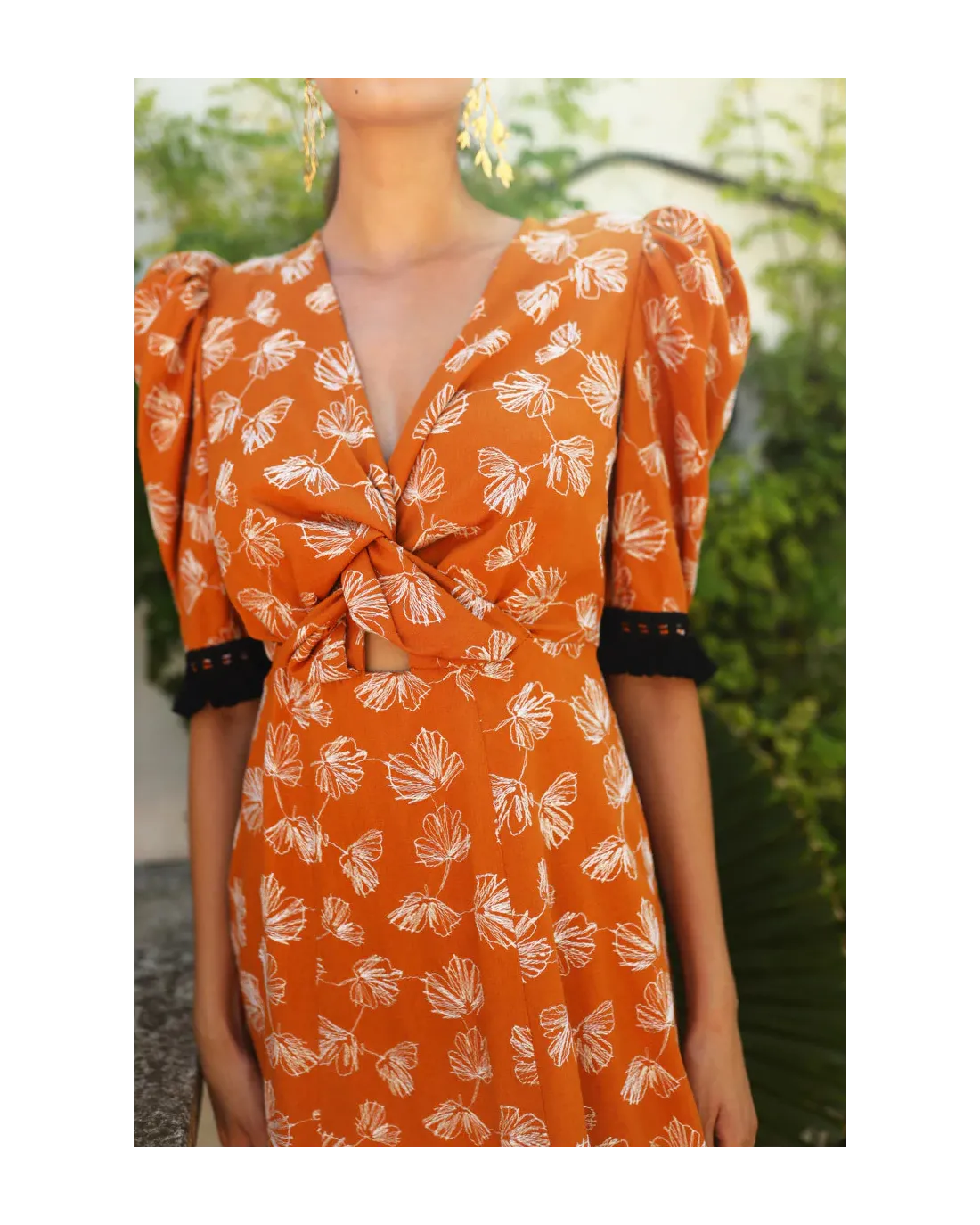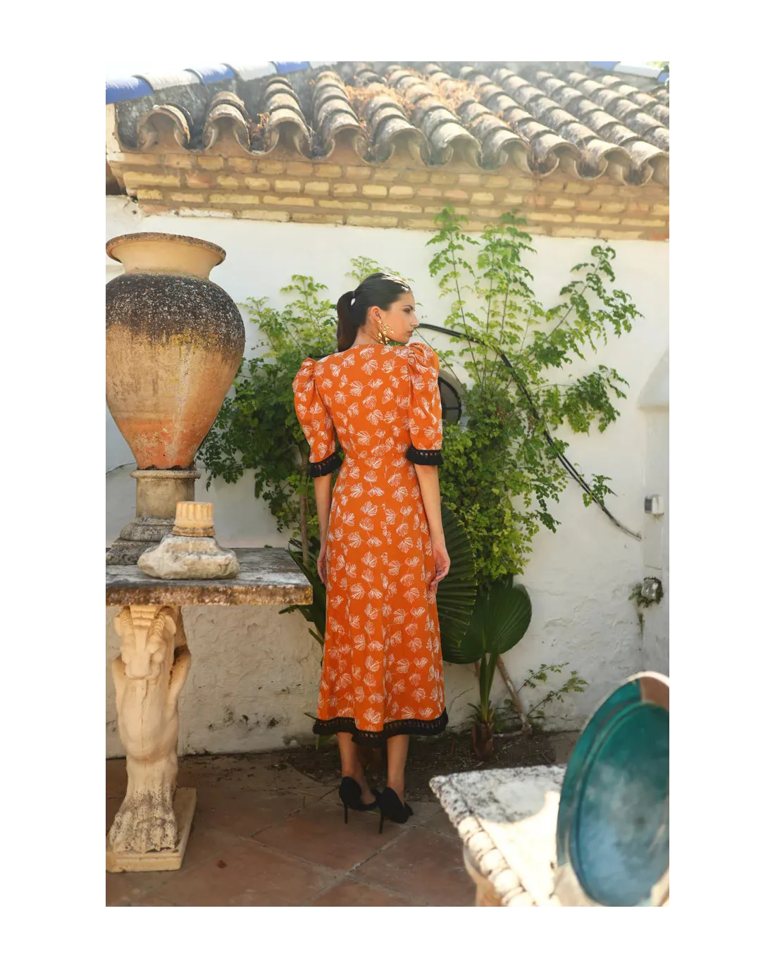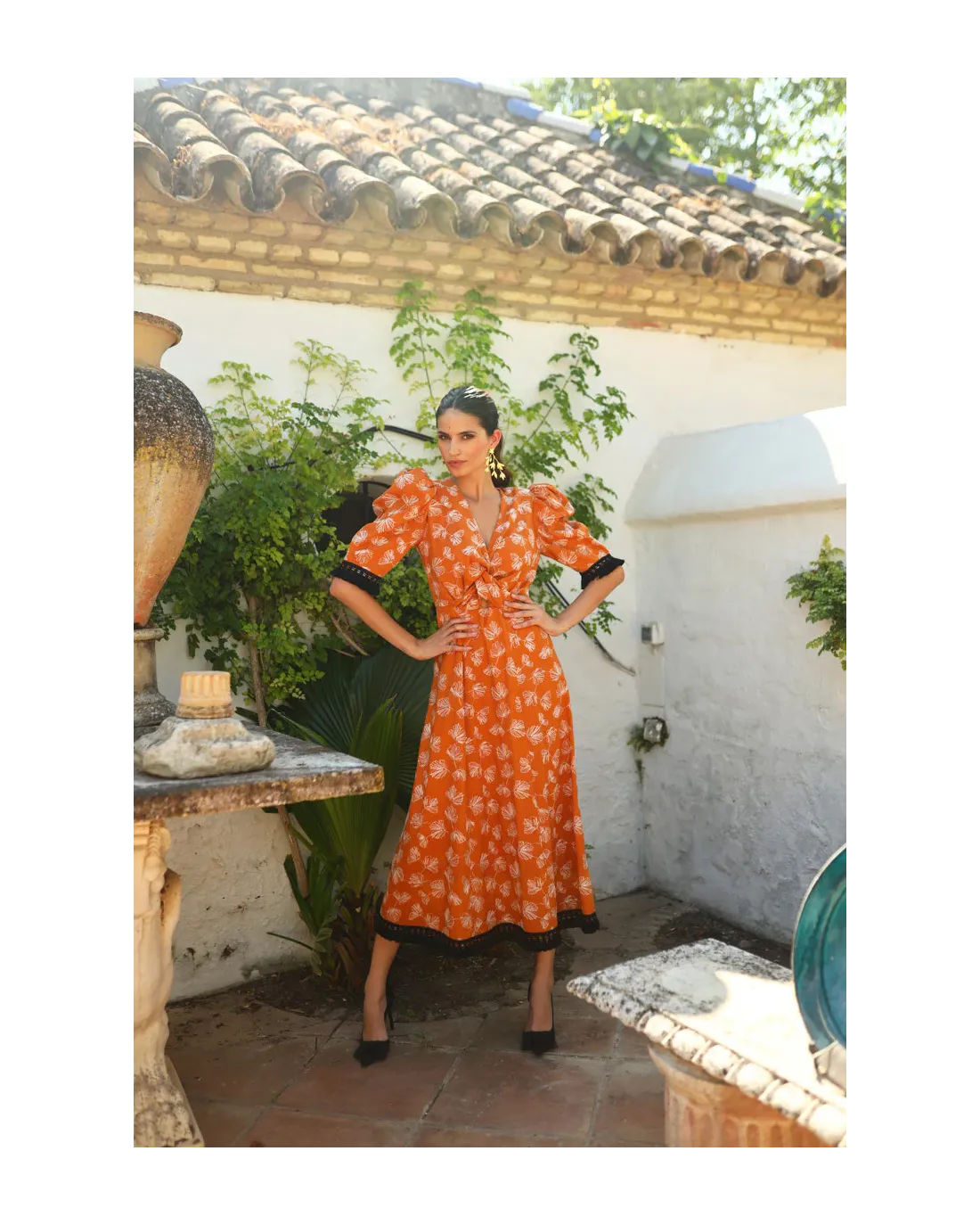 Vestido de largo midi bordado en hilo a contraste con final de mangas y vestido acabado en borlas negras. El vestido es de manga corta abullonada y escote en V anudado. Su cierre es de cremallera lateral invisible.