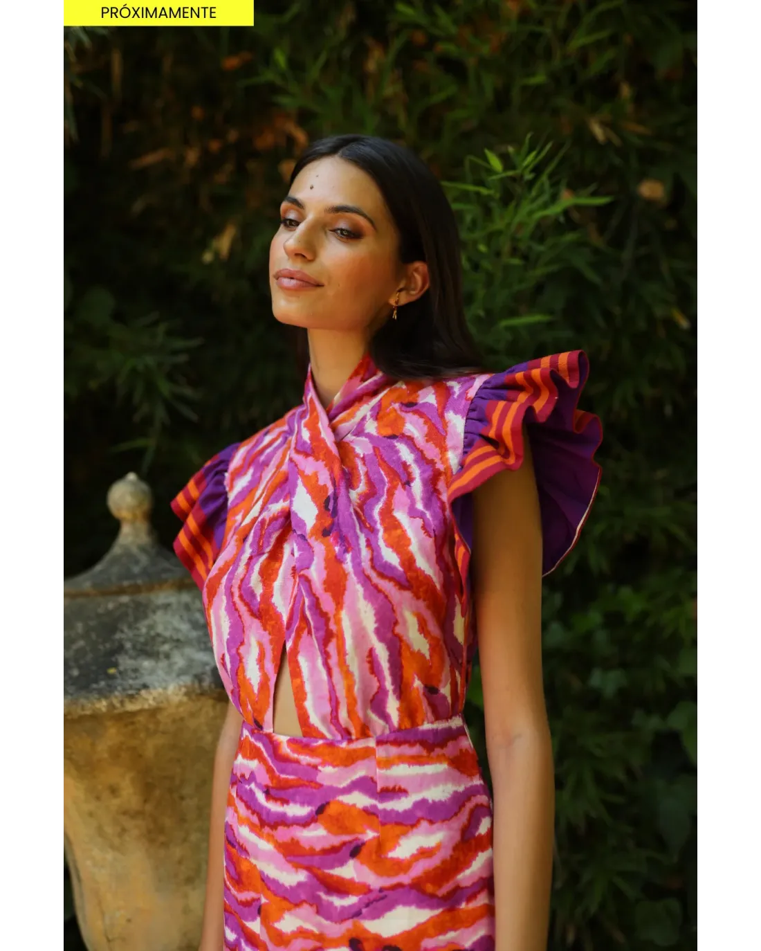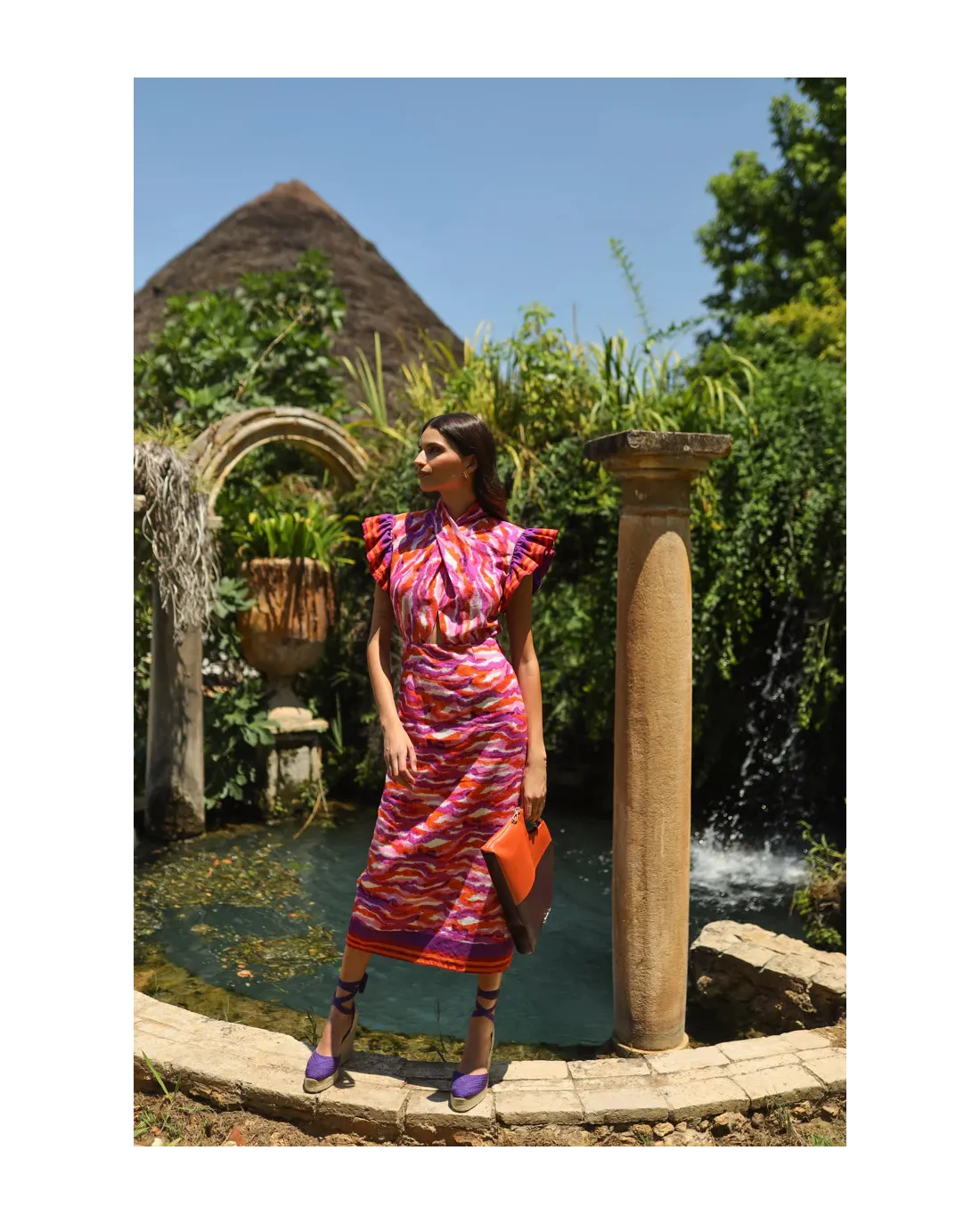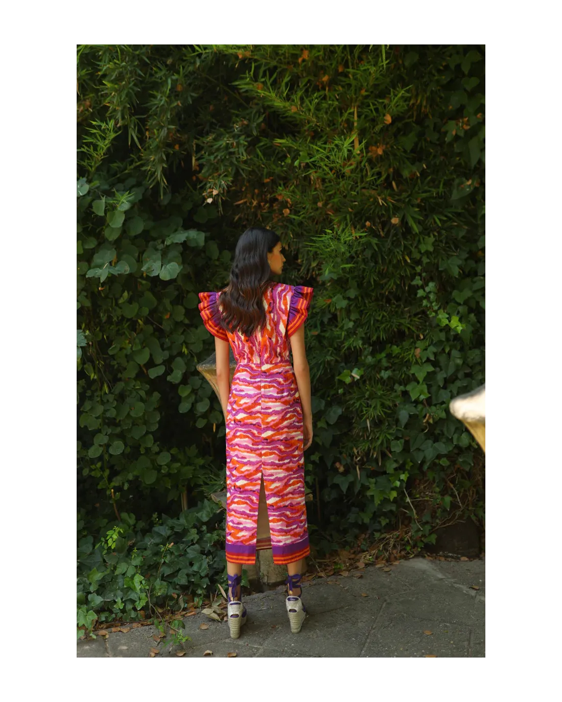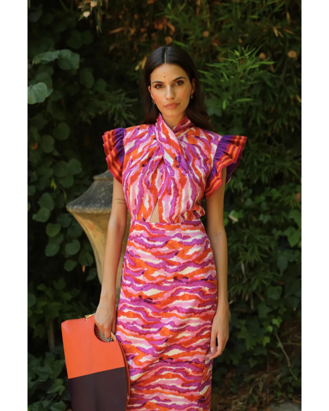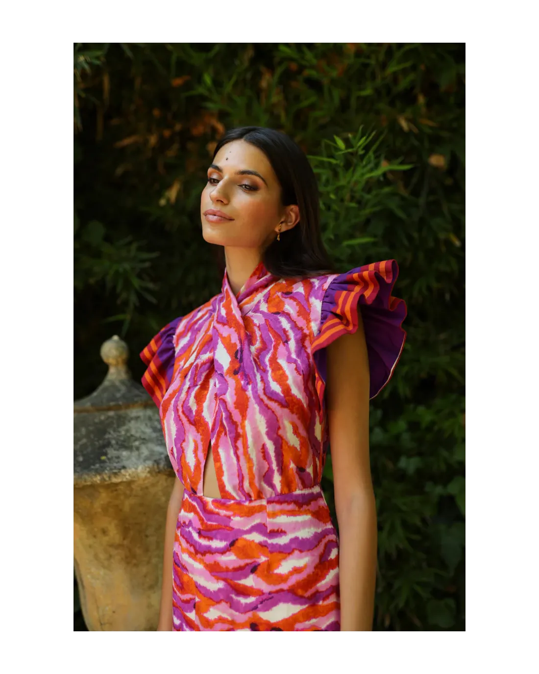 Vestido multicolor de largo midi confeccionado en tejido ligero con hombros y final del vestido acabado en flecos. El escote es cruzado anudado y falda evasé. Su cierre es de cremallera trasera invisible.