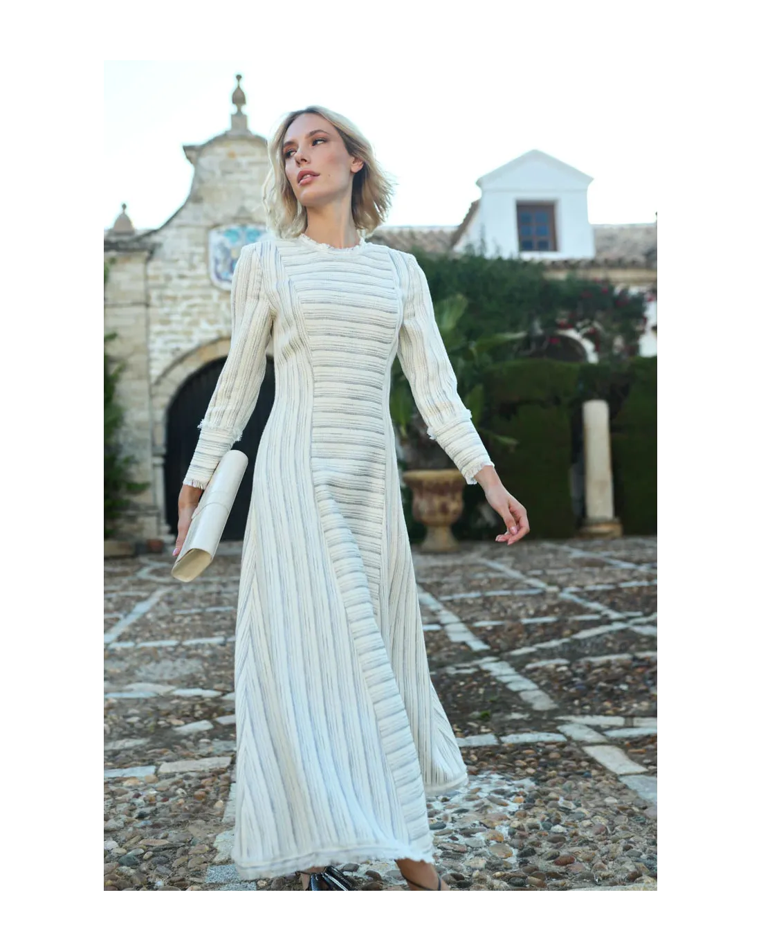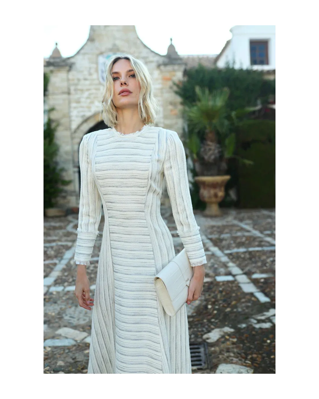 Vestido de largo midi confeccionado en tejido chanel con líneas horizontales y verticales con cuello redondo, manga 3/4 y falda evasé con bordes deshilachados.