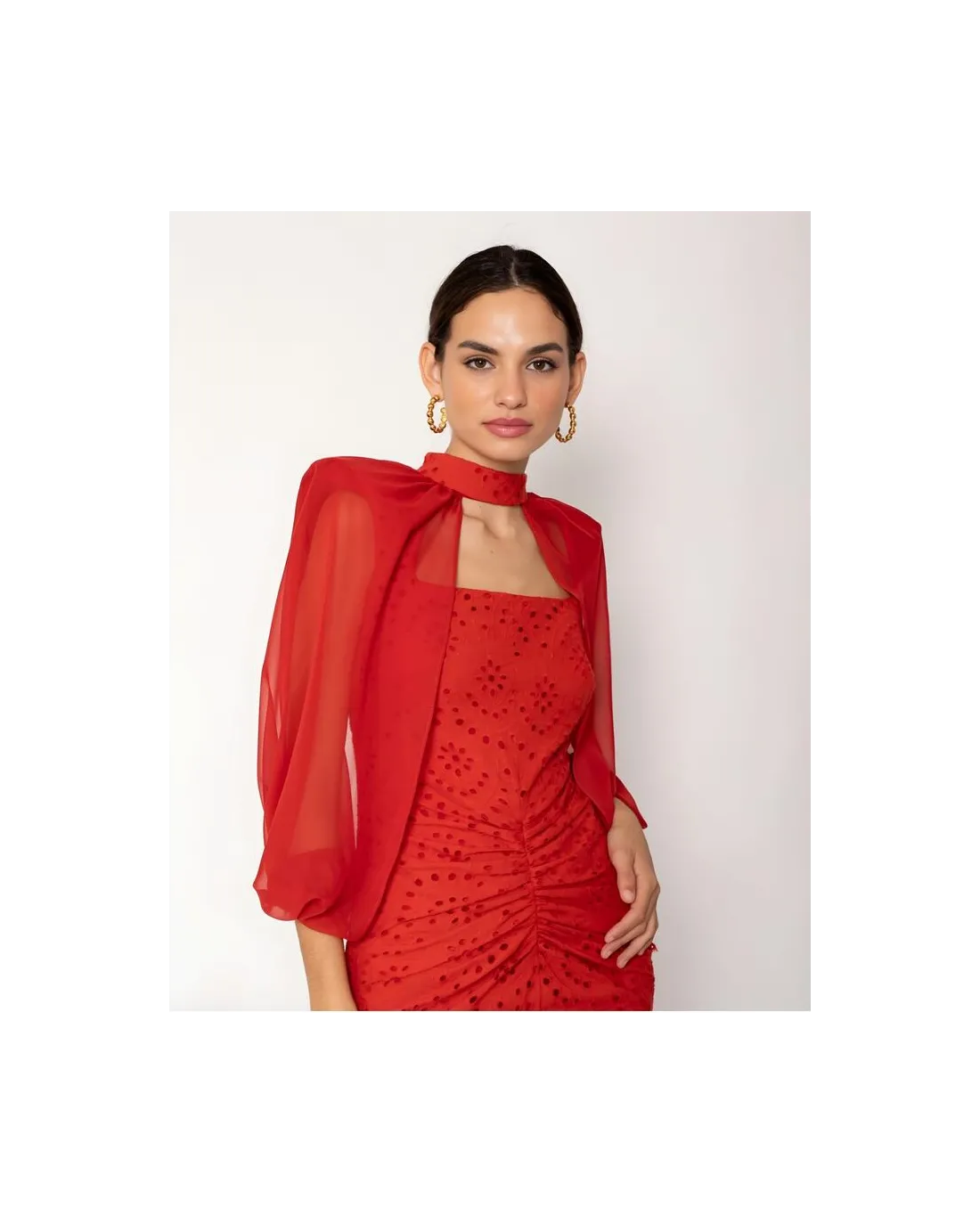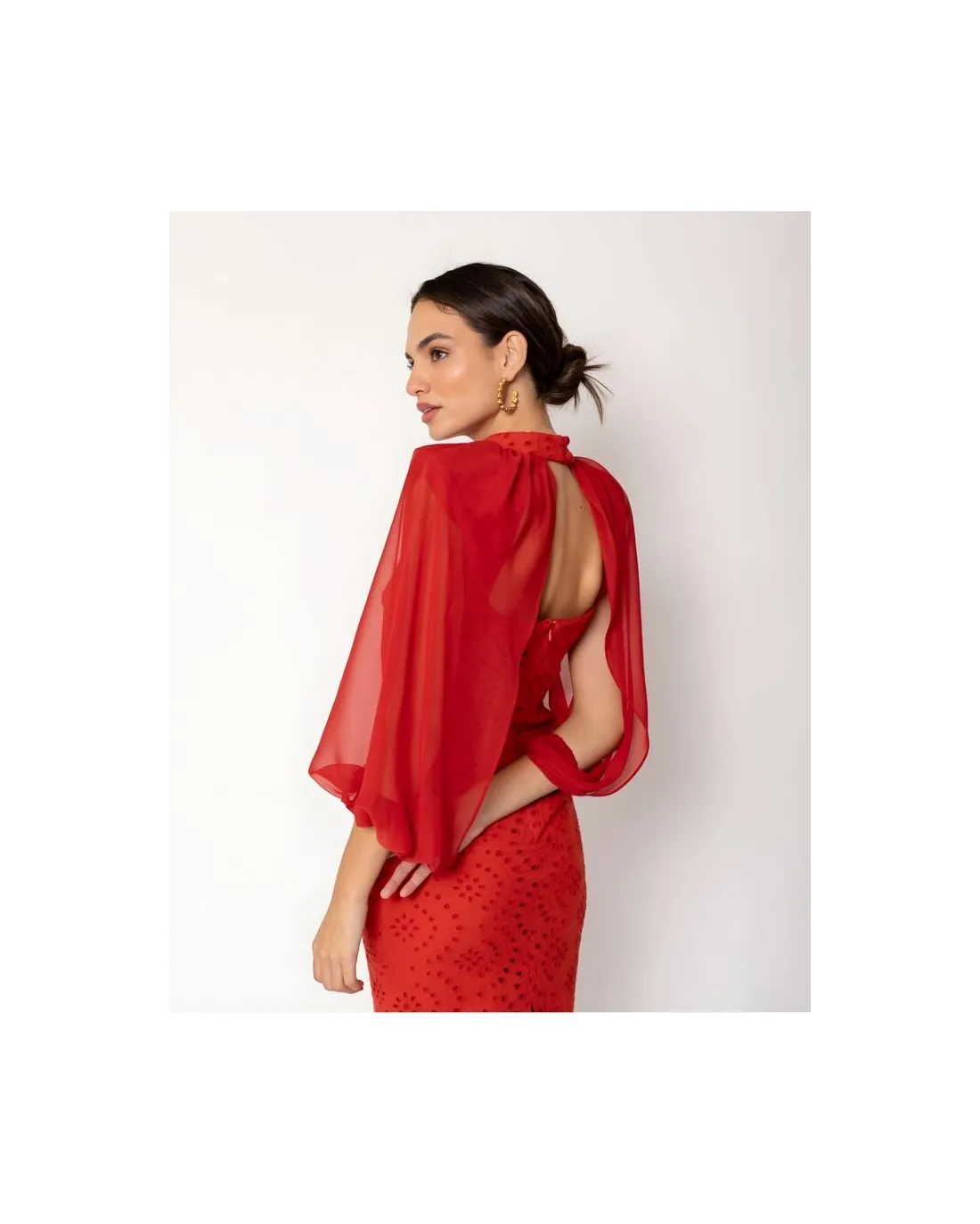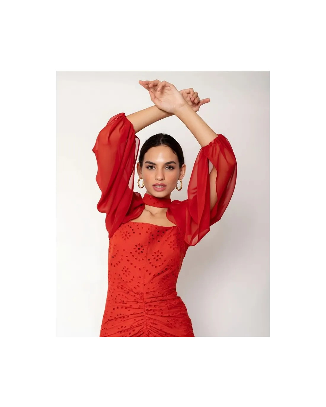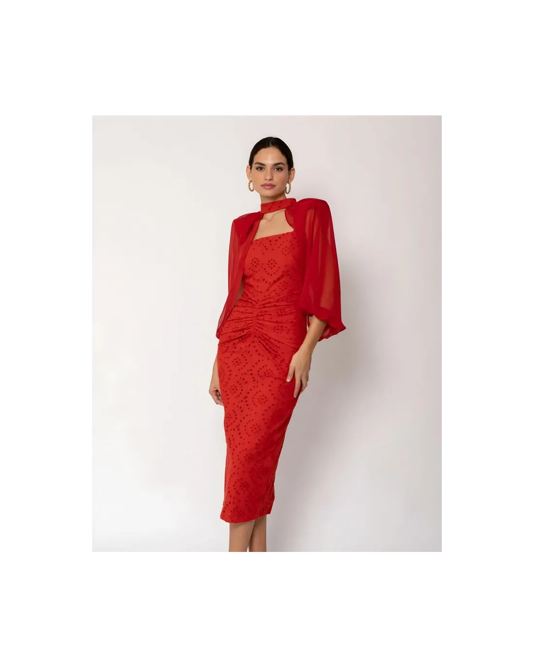 Vestido de largo midi confeccionado en tejido calado con maxi hombros y manga de gasa abiertas. El escote es cuadrado, lleva un drapeado en la parte delantera y abertura trasera. Su cierre es de cremallera trasera invisible y botones en el cuello.