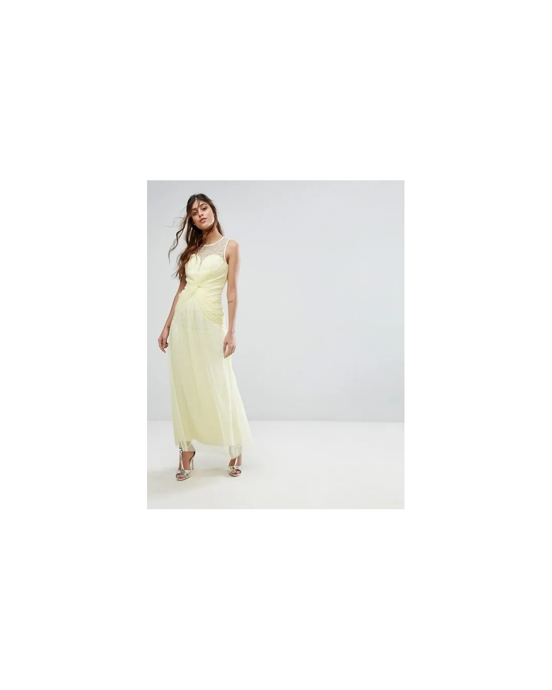 Vestido largo en tejido de tul, con pedrería y un drapeado en pecho.