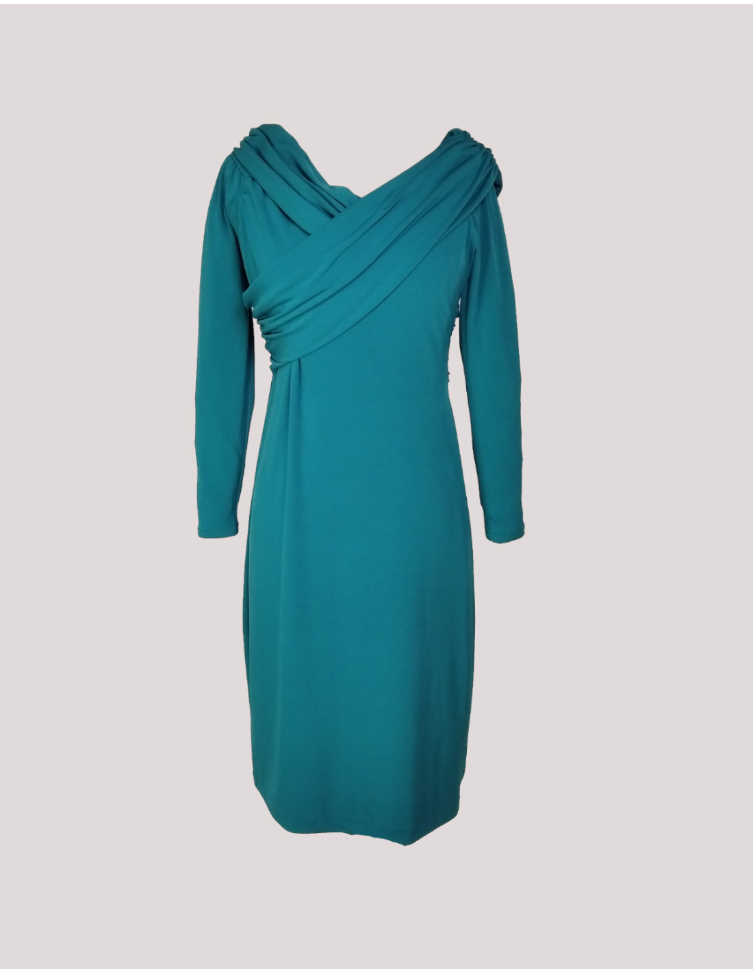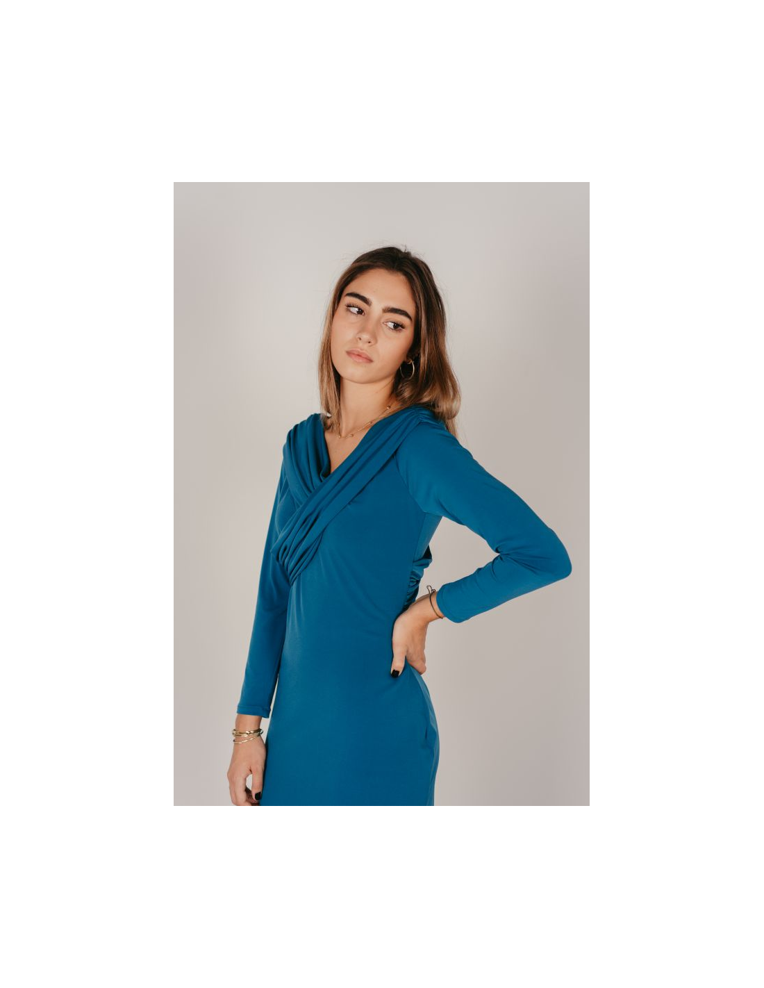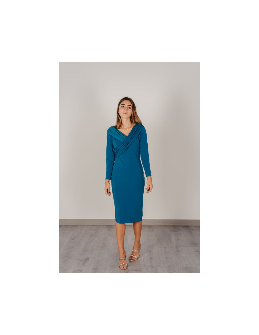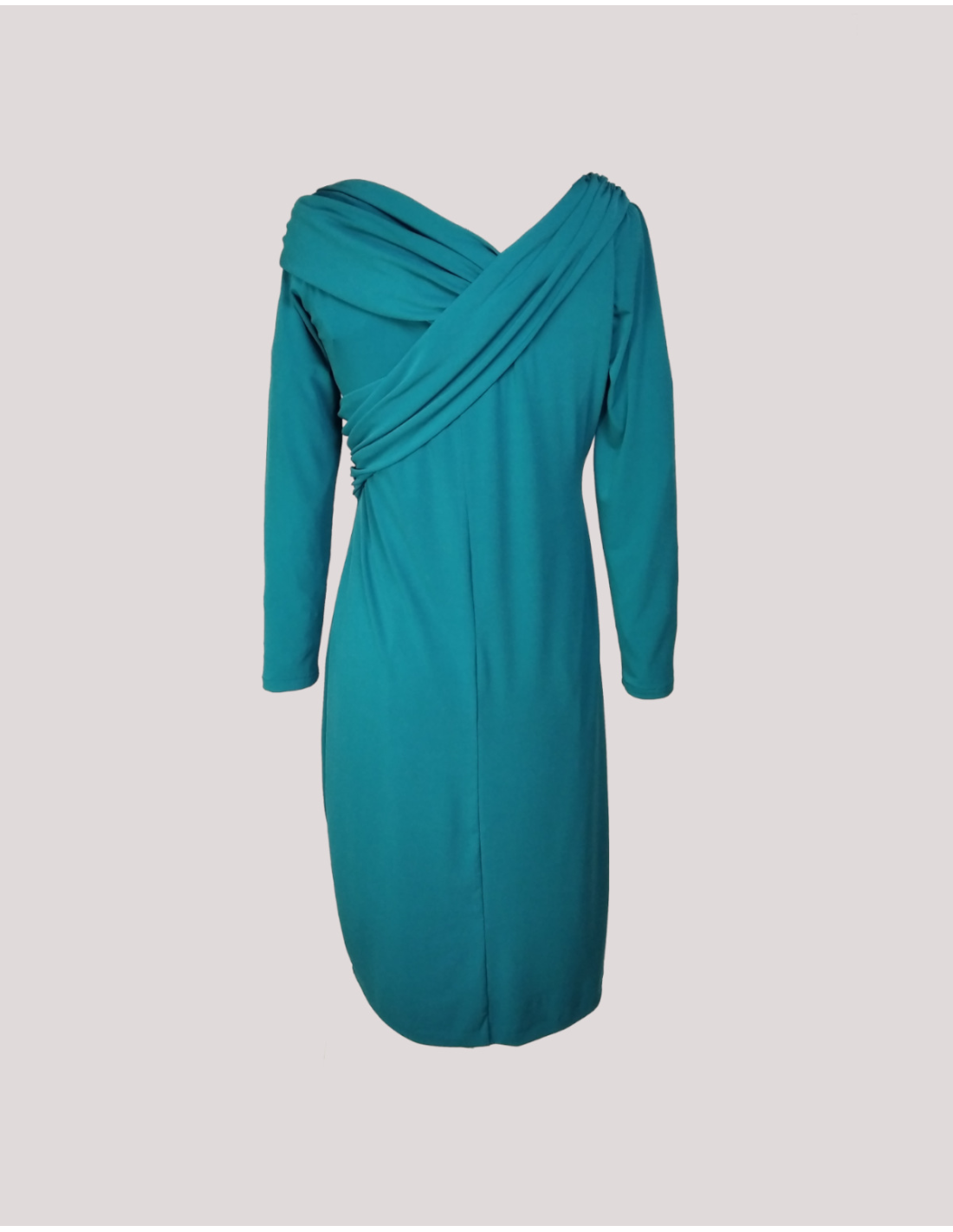 Vestido midi de corte ajustado, de los hombros nace un drapeado cruzando el pecho y su manga es larga. El vestido está confeccionado en un tejido de punto de seda el cual se ajusta muy bien dejando ver tu silueta.