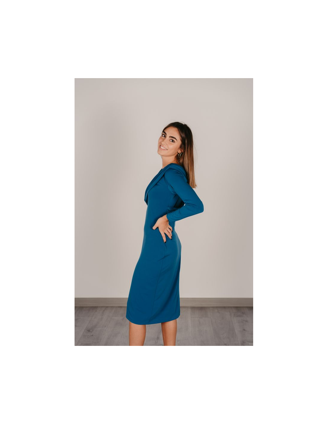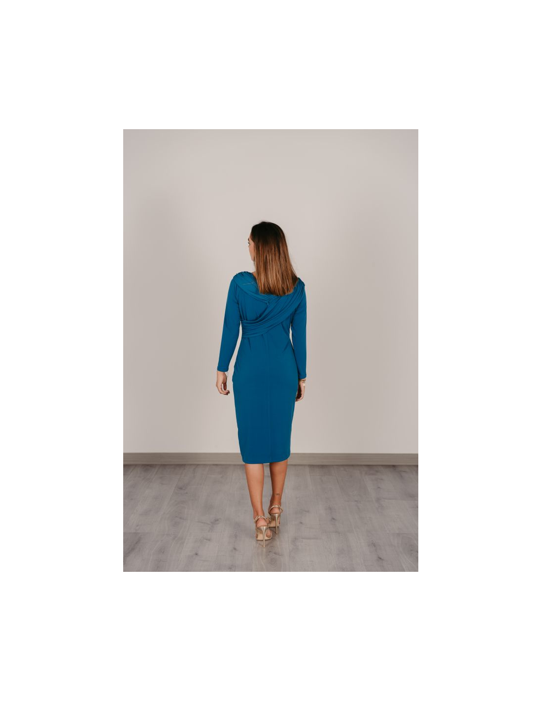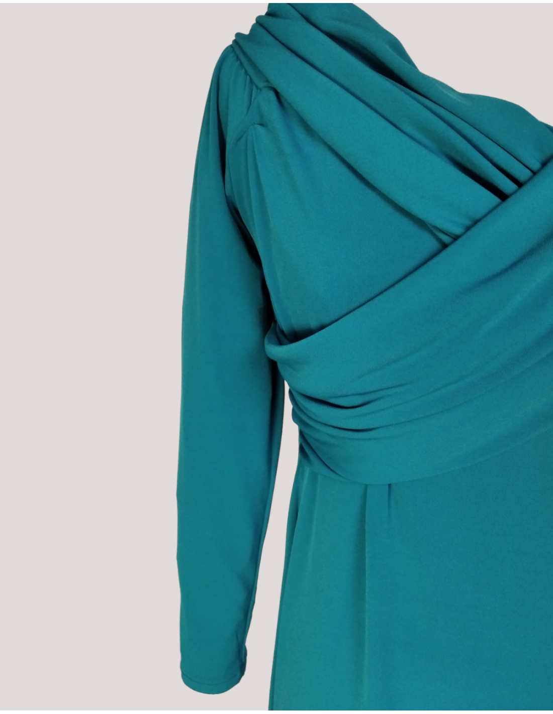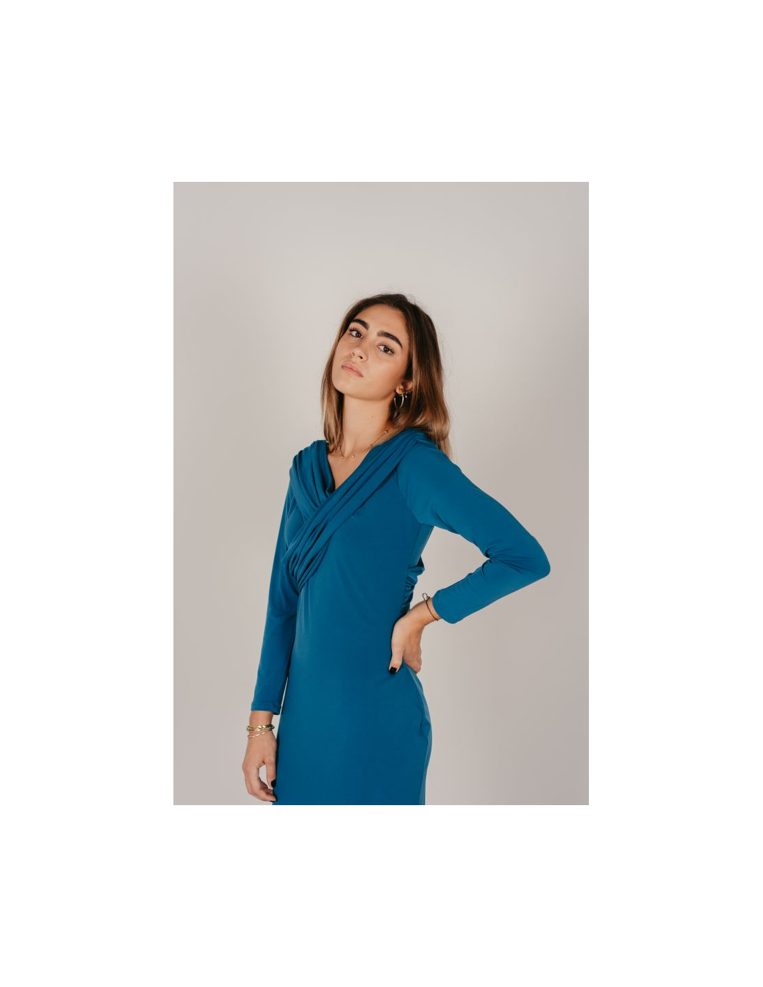 Vestido midi de corte ajustado, de los hombros nace un drapeado cruzando el pecho y su manga es larga. El vestido está confeccionado en un tejido de punto de seda el cual se ajusta muy bien dejando ver tu silueta.