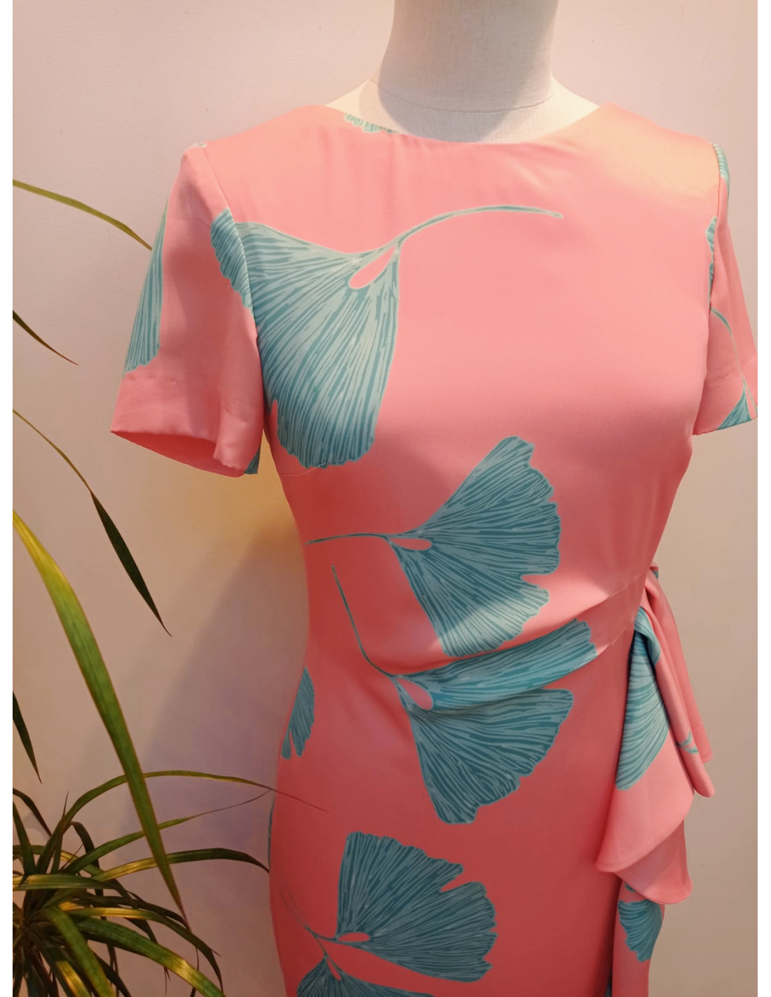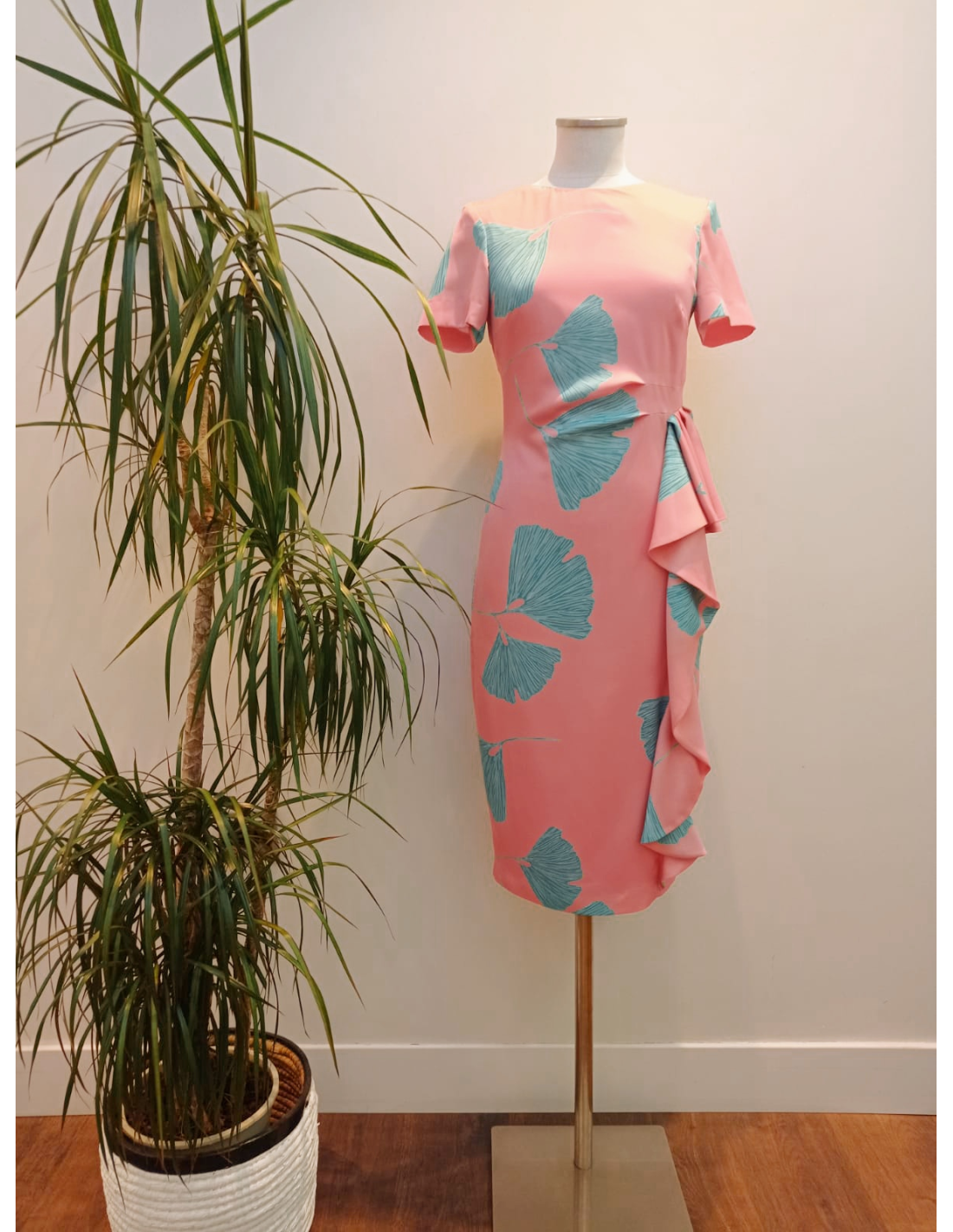 Vestido corto de corte recto, confeccionado en tejido crepe de alta calidad y manga corta. Lleva un bonito volante lateral en cascada que cae sobre la falda. Espalda cerrada con cremallera invisible y cuello a la caja.