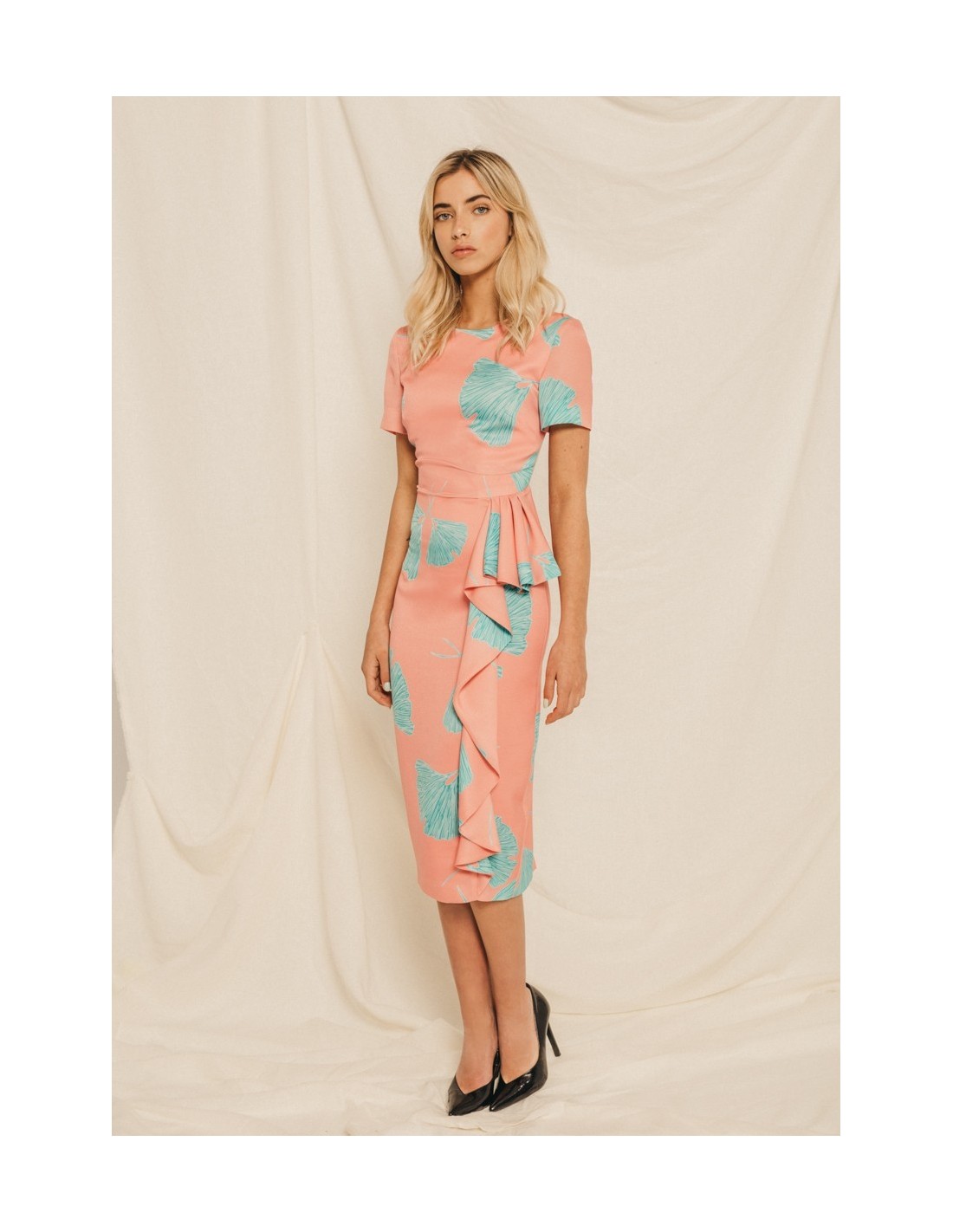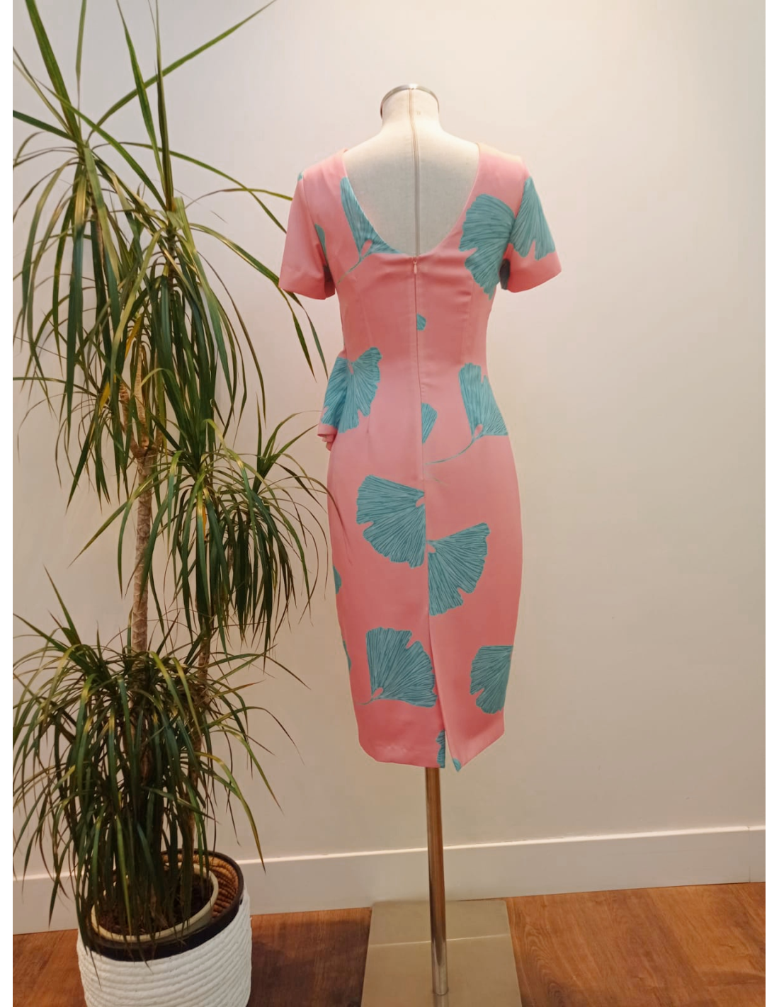 Vestido a media pierna de corte entubado confeccionado en un tejido brocado, con manga corta y escote en V. El vestido en tejido brocado estampado y cortado a la cintura donde sale un peplum al tono.