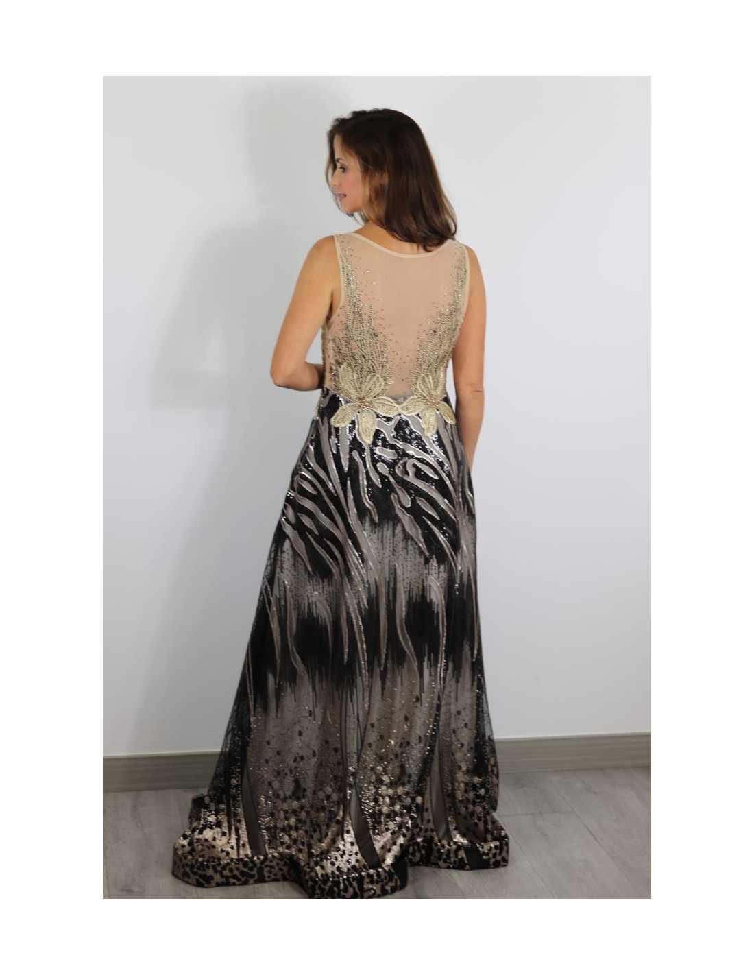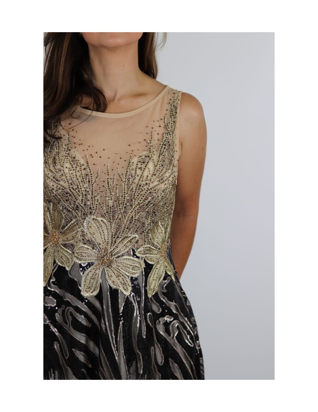 Vestido corto de corte recto, cuello redondo y manga larga. El vestido está confeccionado en tejido de lentejuelas.