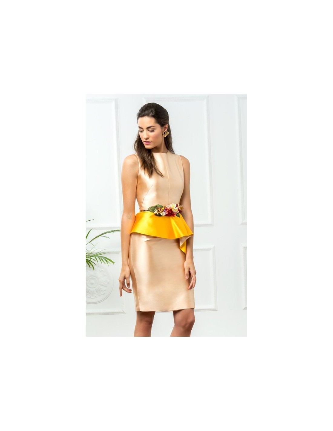 Vestido corto confeccionado con doble tejido, la parte de arriba brocada con manga 3/4 escote redondo y la parte de atrás con espalda baja cruzada. El final del vestido confeccionado en un tejido crepé con drapeado y lazada en un lateral.