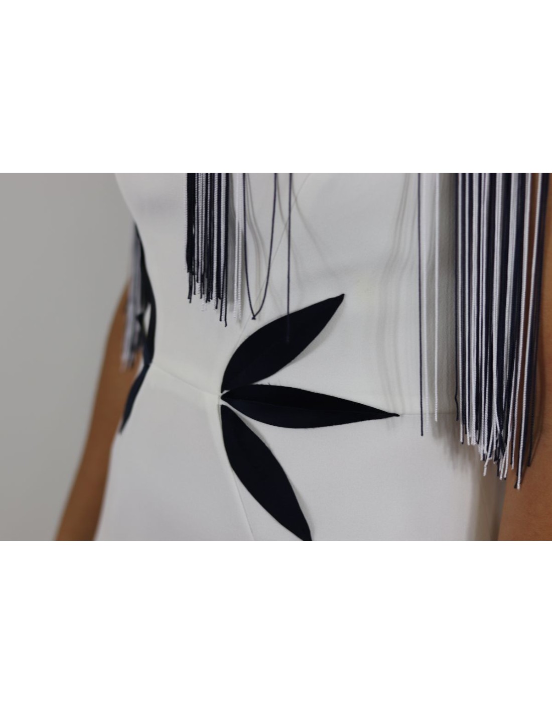 Vestido corto de corte entubado, confeccionado en tejido crepé. Sin mangas con unos flecos que salen desde el hombro en tonos azul marino y blanco. Detalle en cintura a contraste.