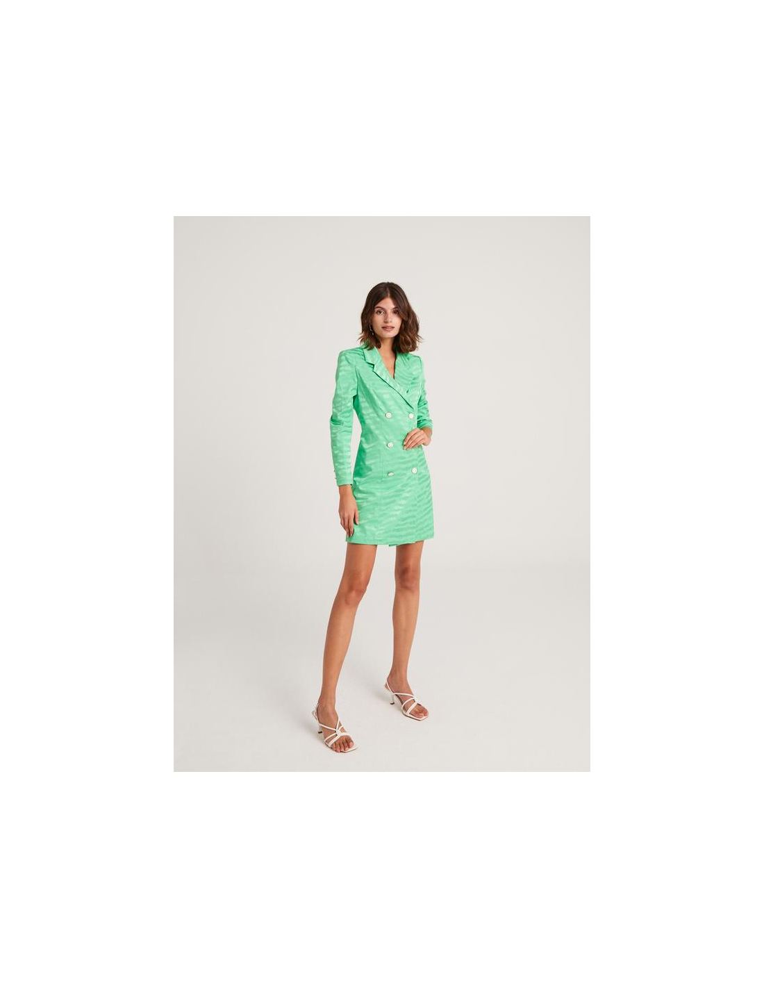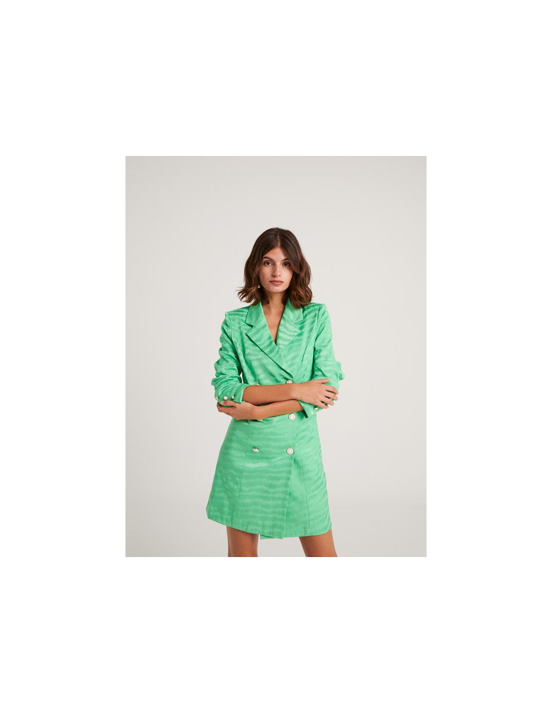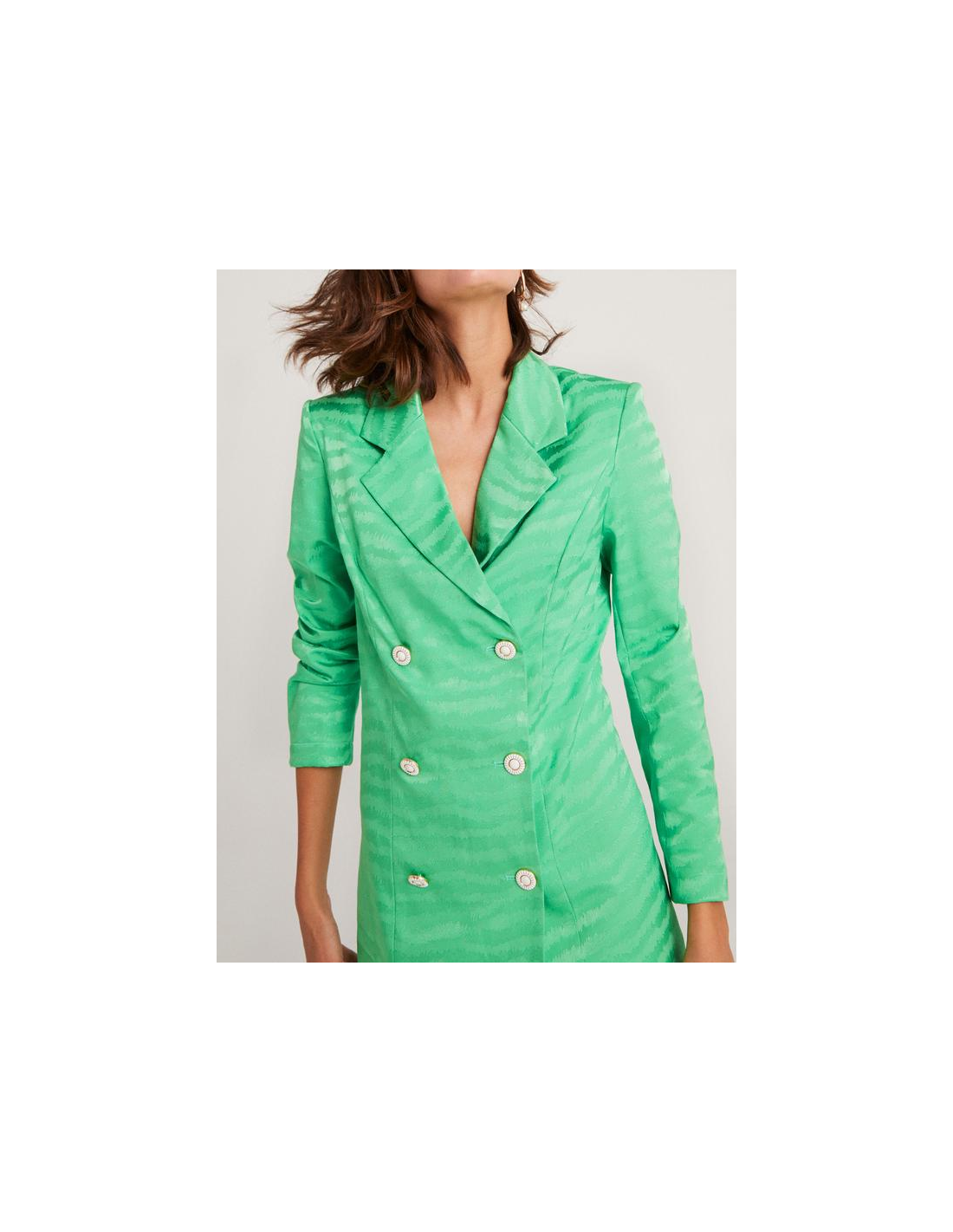 Vestido blazer corto en monocolor con manga larga y hombreras marcadas, está confeccionado en un tejido jacquard y su cierre es con botones dorados.