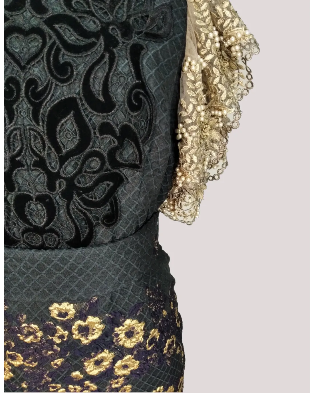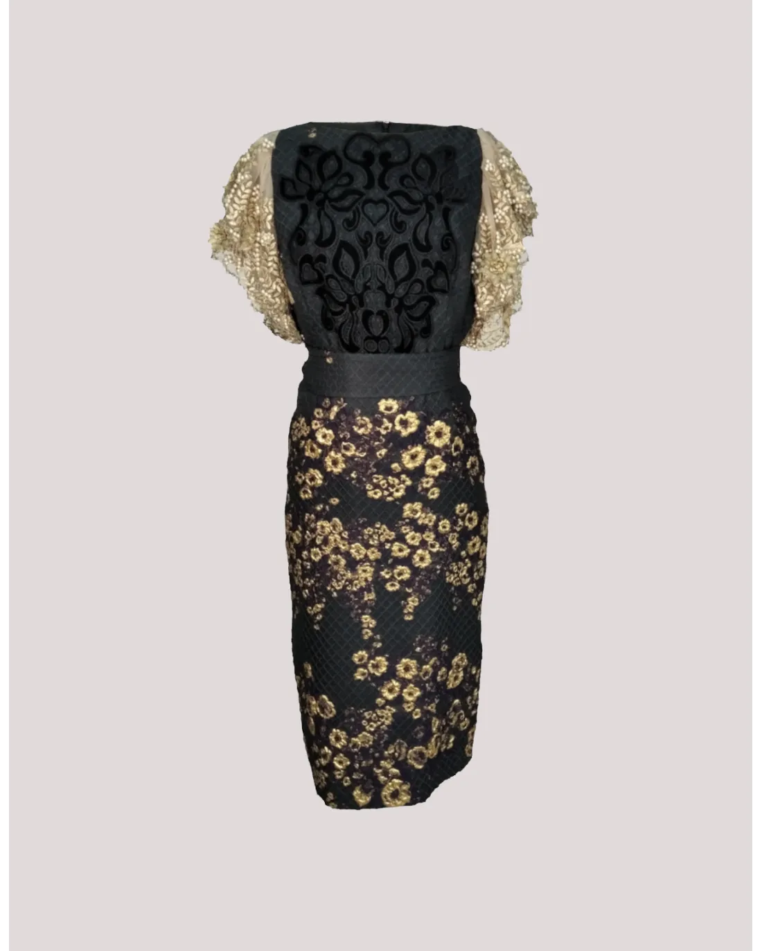 Vestido largo midi con falda brocada de distintos colores, cuerpo de plumetti en negro.