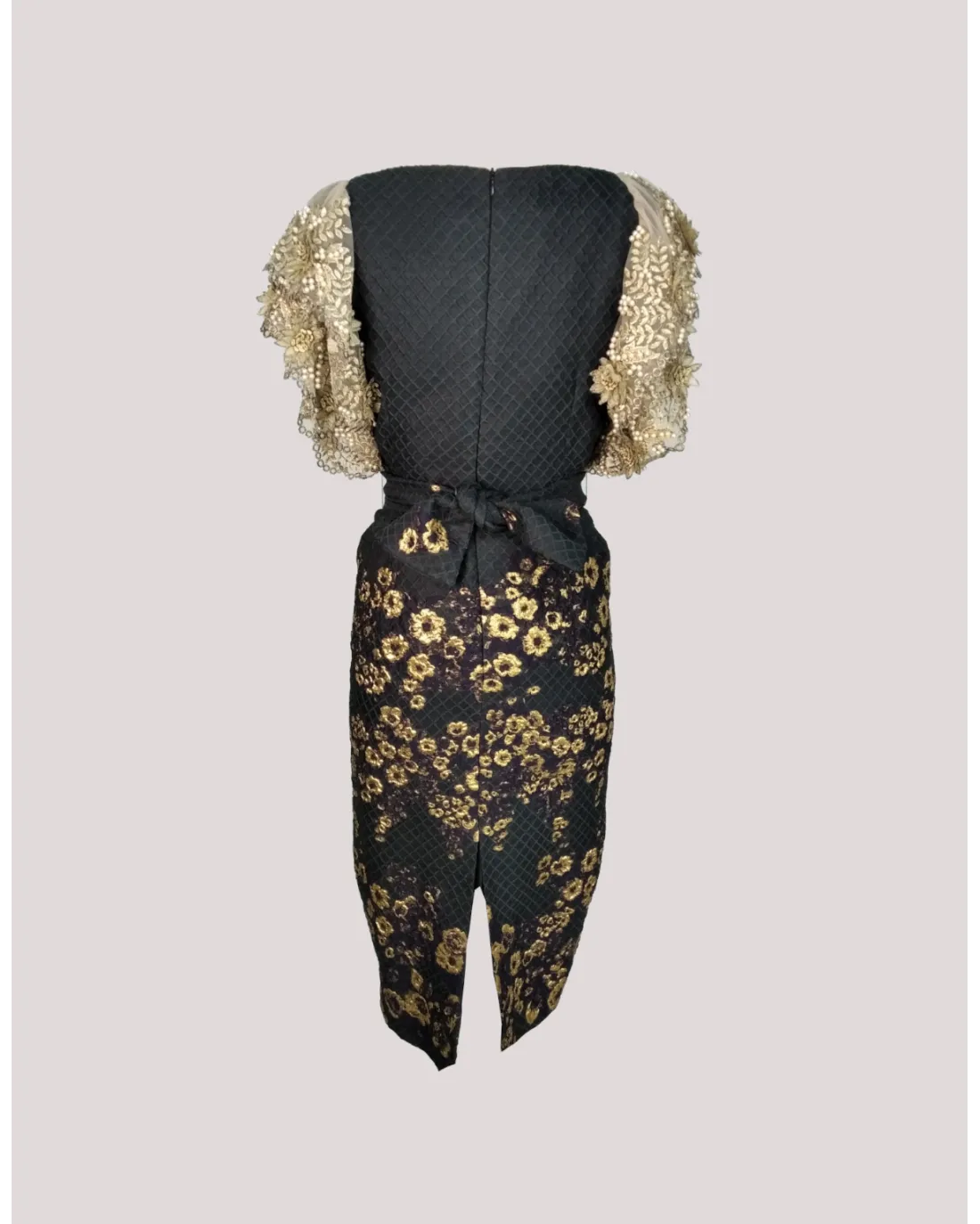 Vestido a media pierna de corte entubado con escote en tul, cuerpo y mangas de encaje.