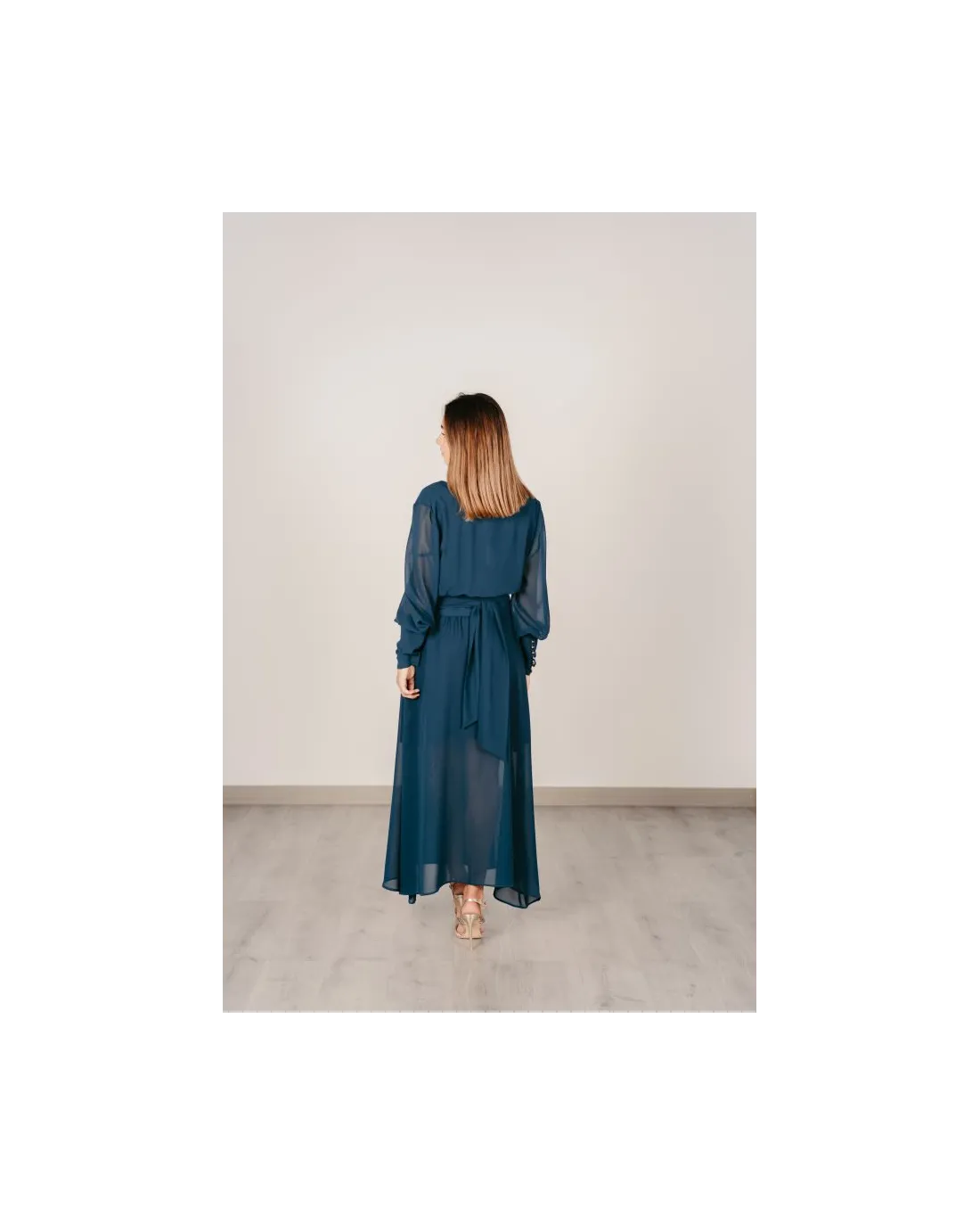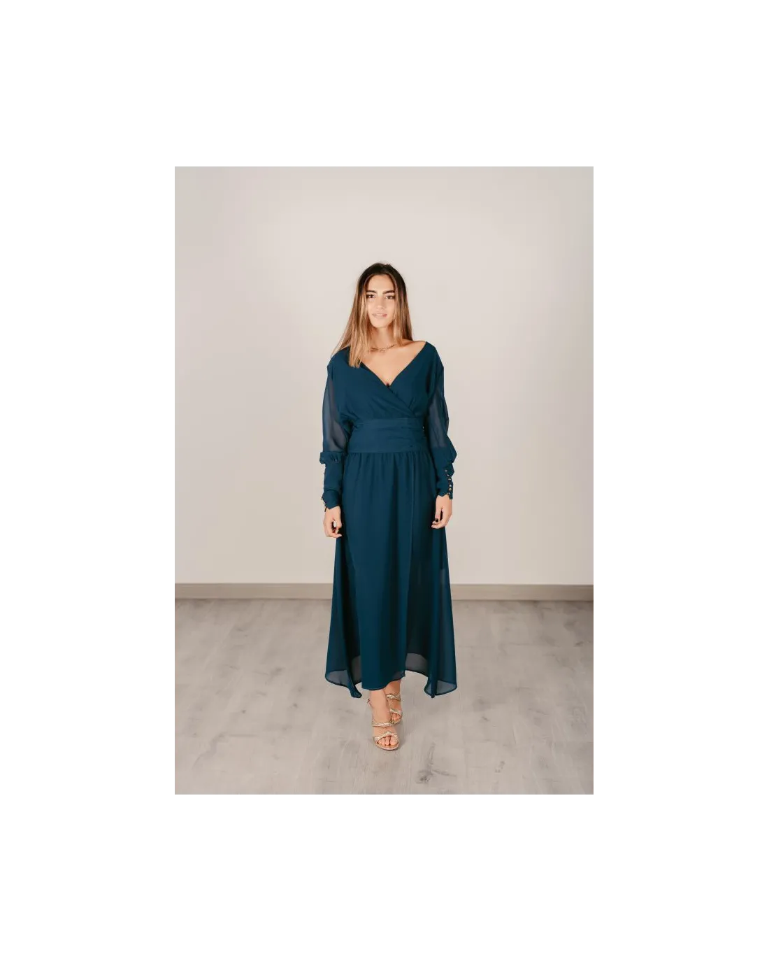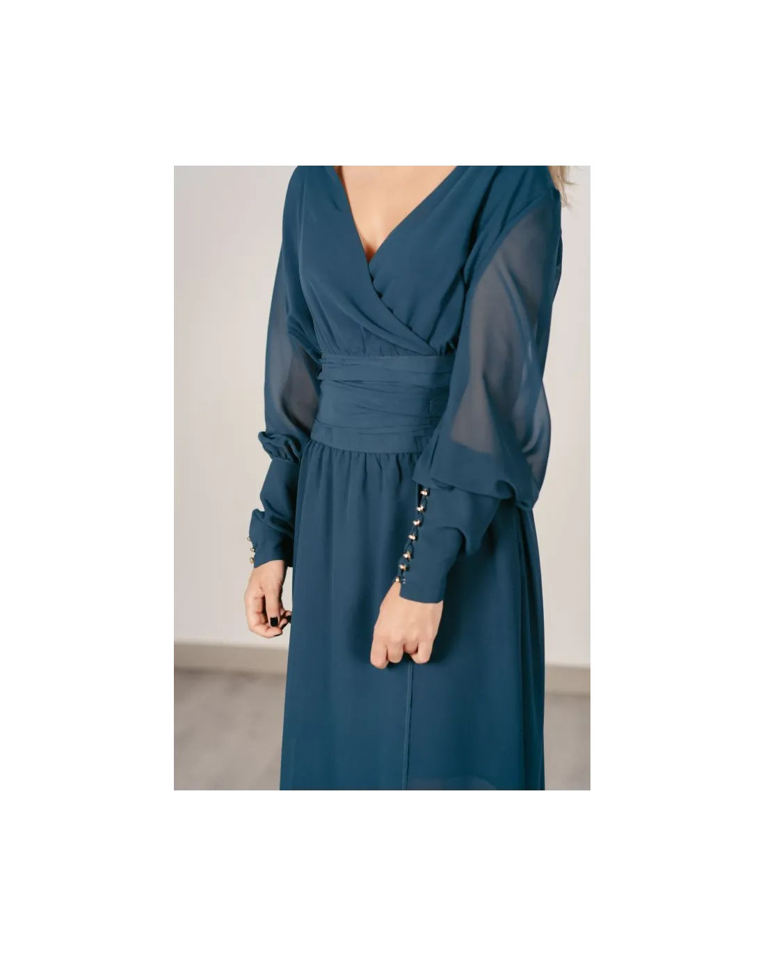 Vestido de corte midi con cuerpo ablusado, escote en V con manga larga acabada en puño con botones dorados, cintura fruncida y falda de corte cruzado. Éste modelo está confeccionado en un tejido de gasa que deja transparentar media pierna. Combínalo con complementos dorados, ideal para esos eventos de coctel.