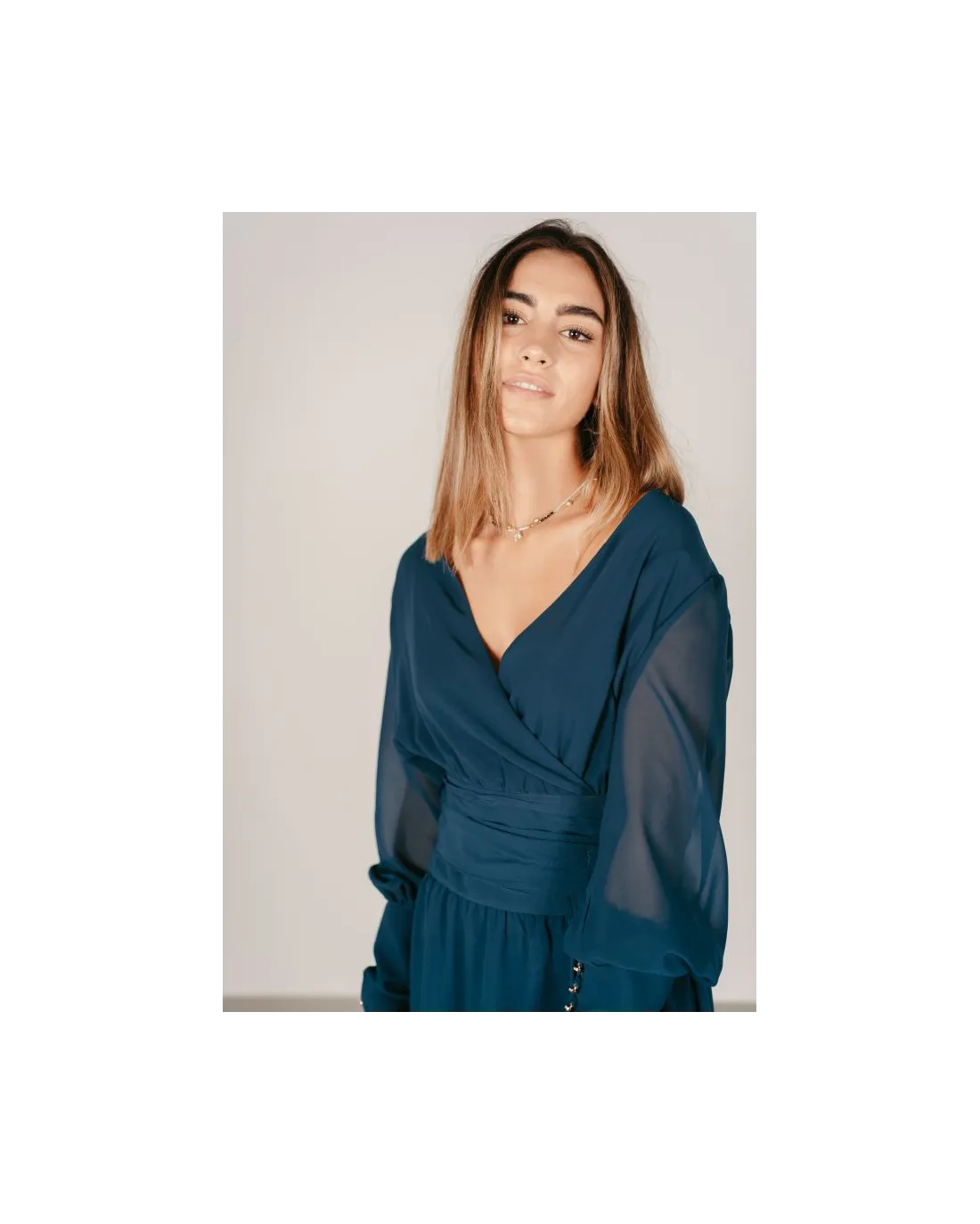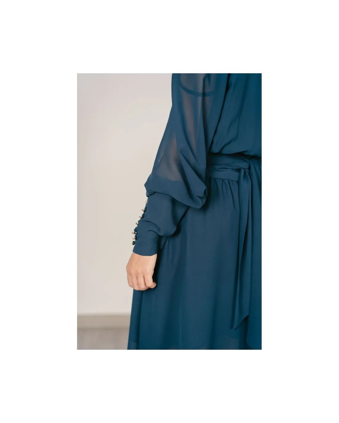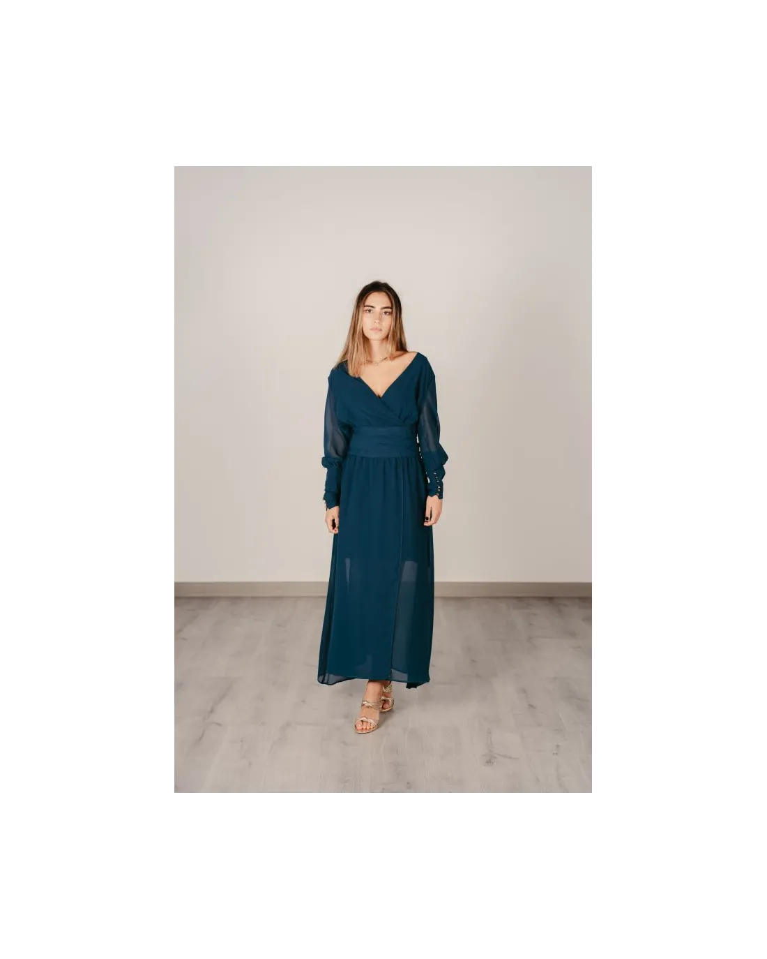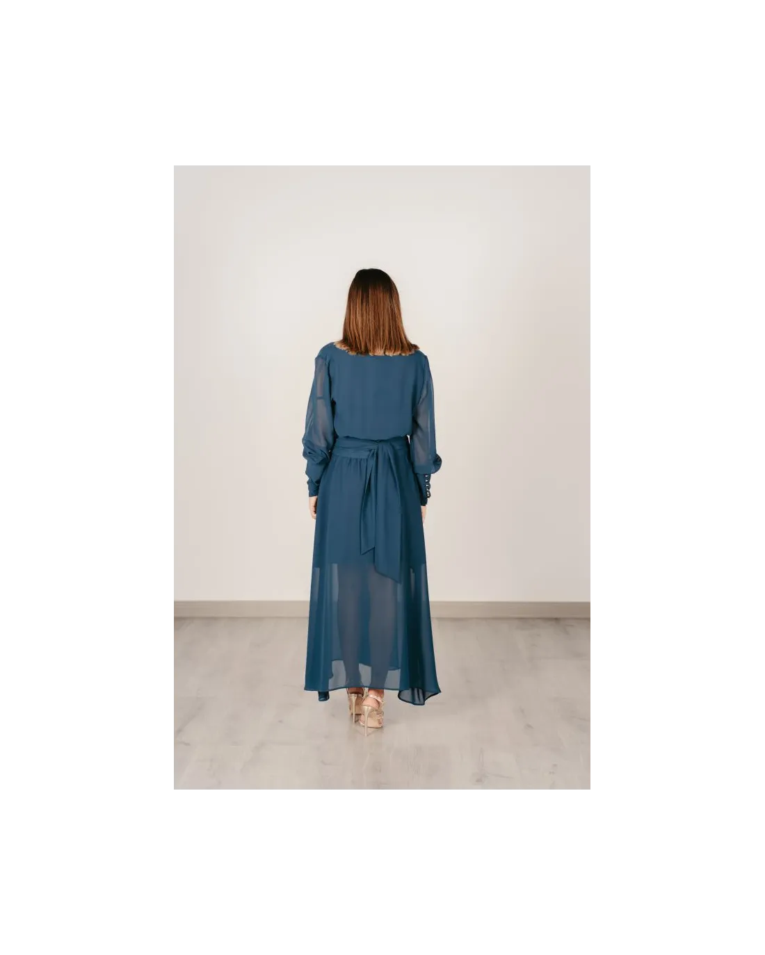 Vestido de corte midi con cuerpo ablusado, escote en V con manga larga acabada en puño con botones dorados, cintura fruncida y falda de corte cruzado. Éste modelo está confeccionado en un tejido de gasa que deja transparentar media pierna. Combínalo con complementos dorados, ideal para esos eventos de coctel.