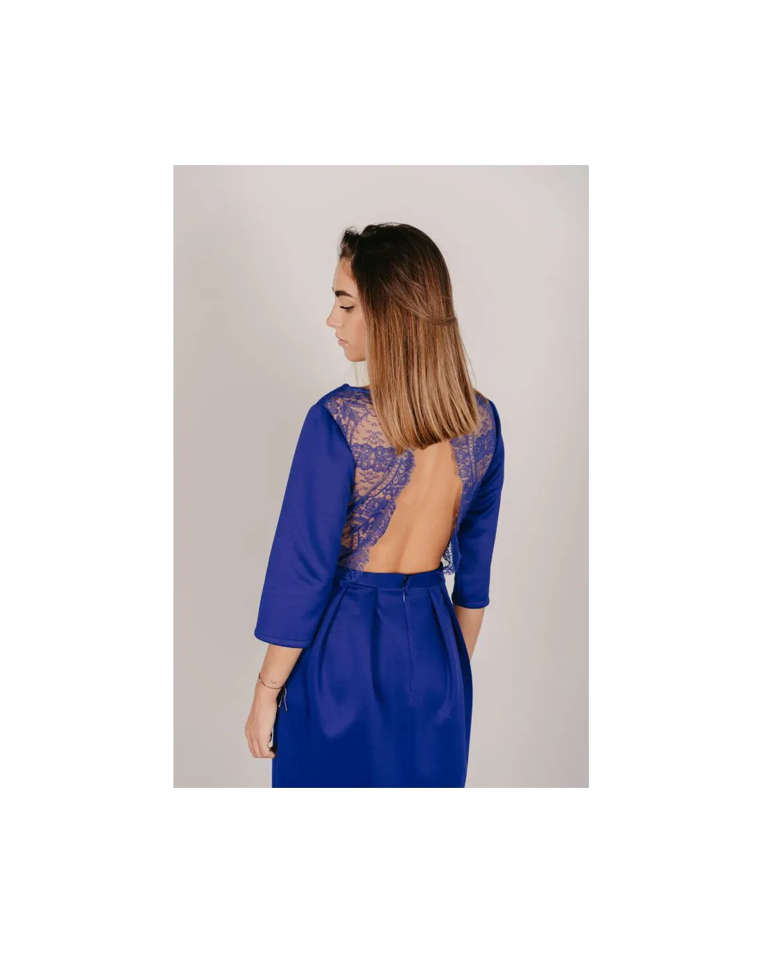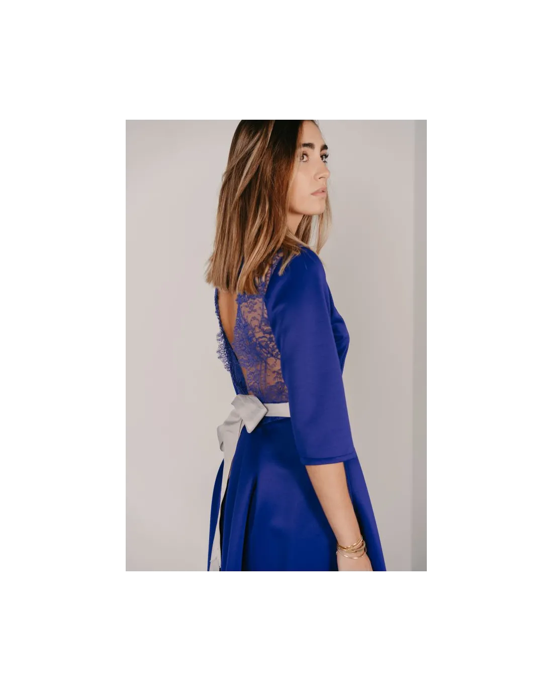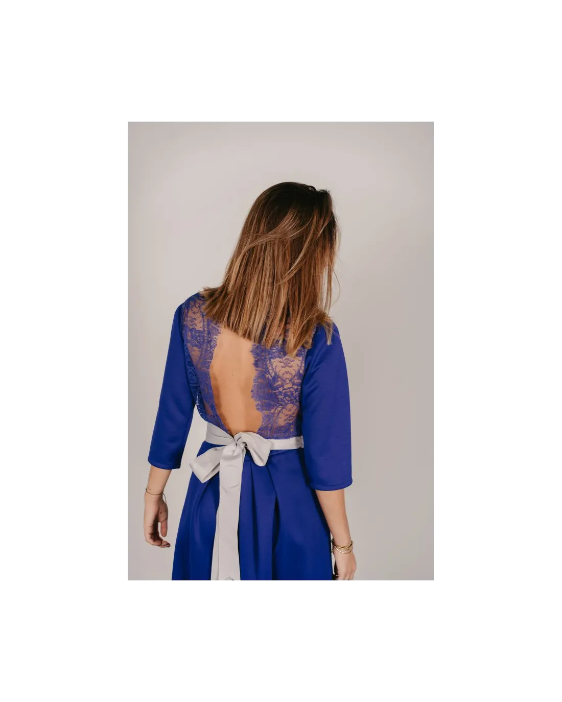 Vestido corto con falda de vuelo cortado a la cintura de la cual salen dos palas pequeñas a cada lado, su manga es francesa con escote redondo y espalda semi descubierta con detalles de encaje. Incluye una lazada a contraste