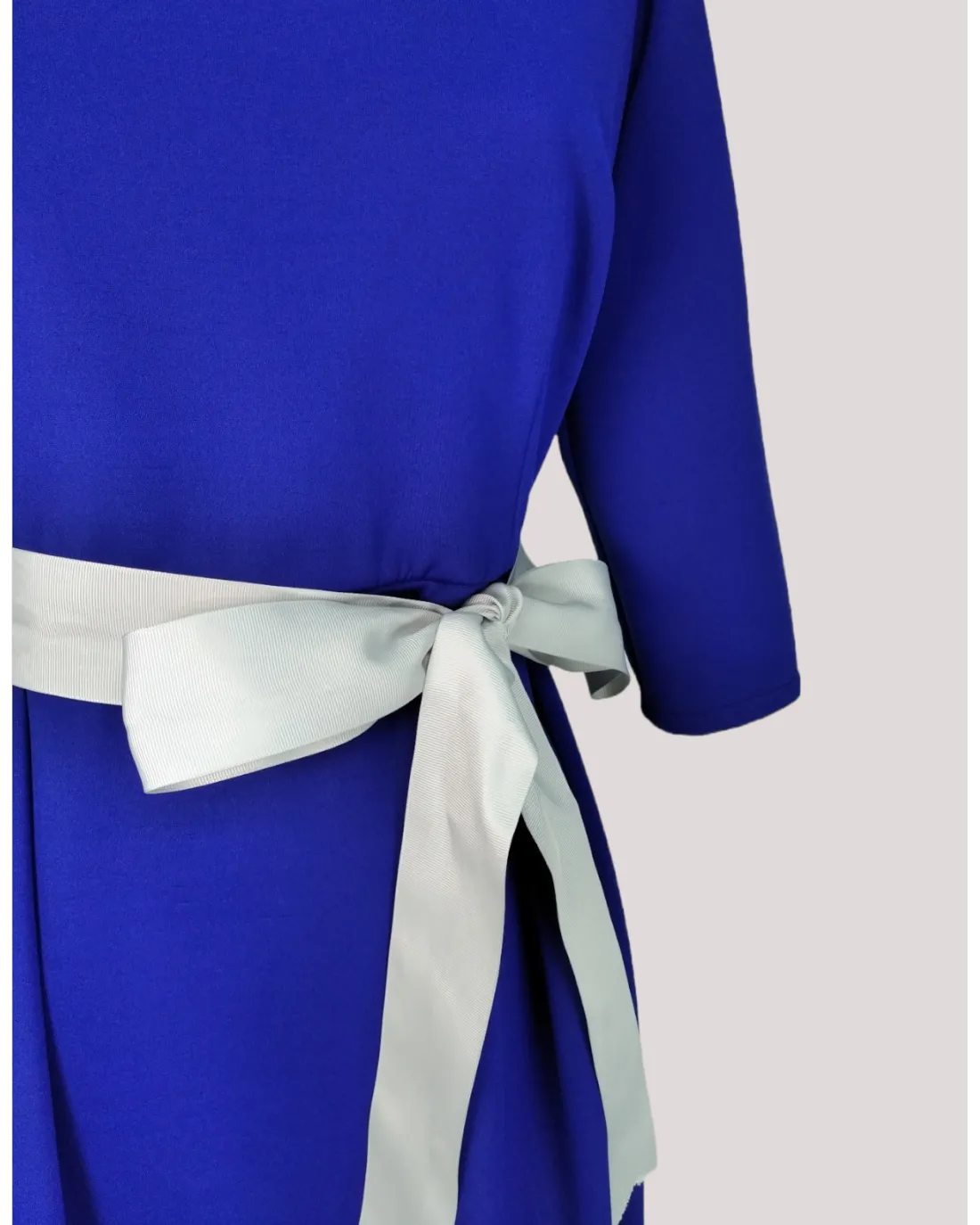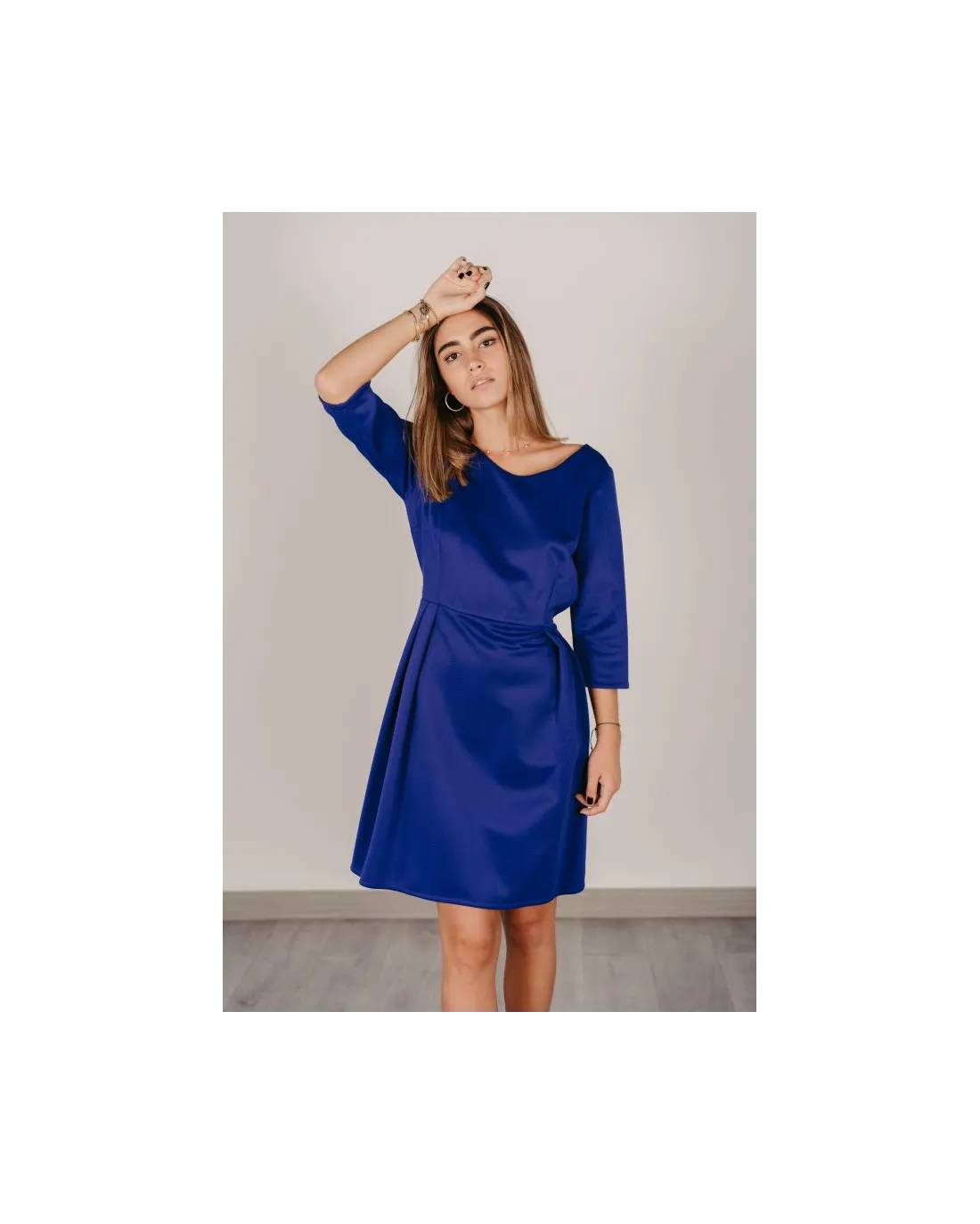 Vestido corto confeccionado con doble tejido, la parte de arriba brocada con manga 3/4 escote redondo y la parte de atrás con espalda baja cruzada. El final del vestido confeccionado en un tejido crepé con drapeado y lazada en un lateral.