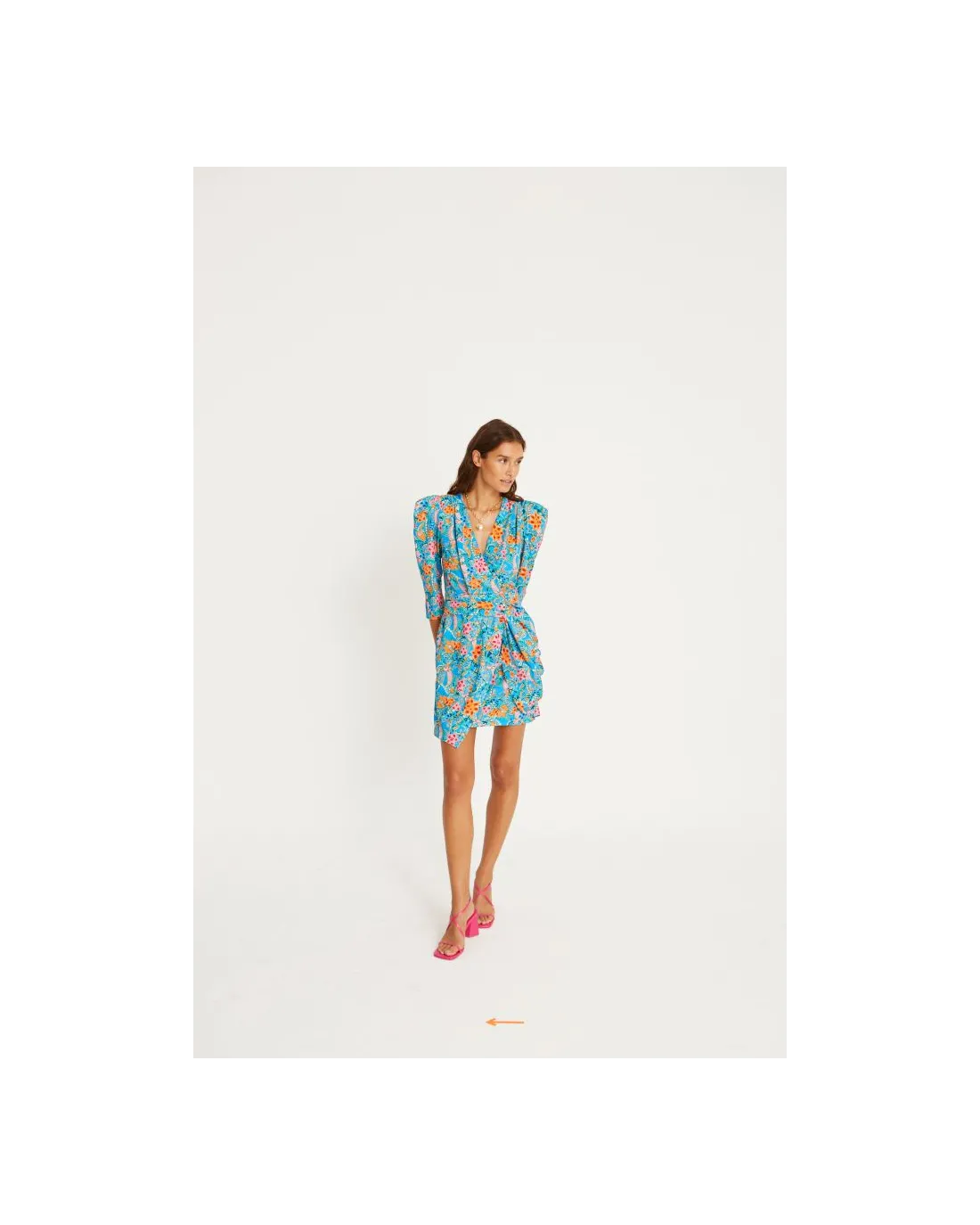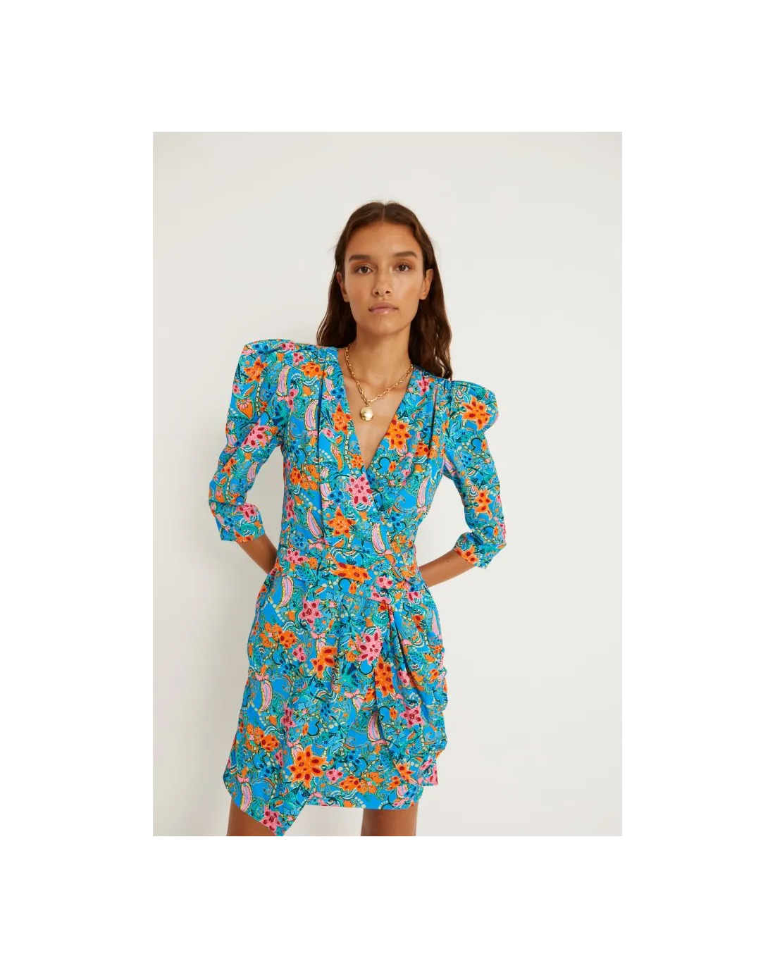 Vestido midi de confeccionado en un tejido de raso lavado. Cruzado tipo wrap, con mangas murciélago y cinturón a juego.